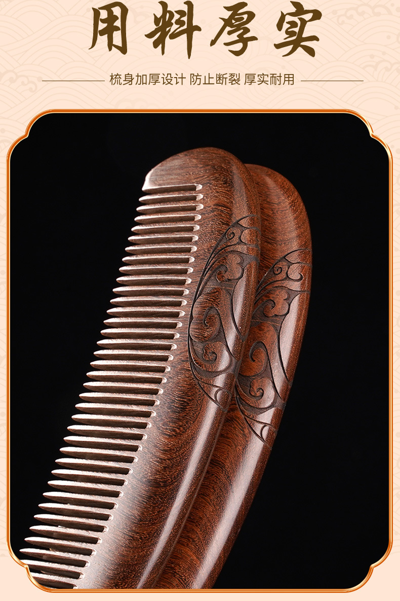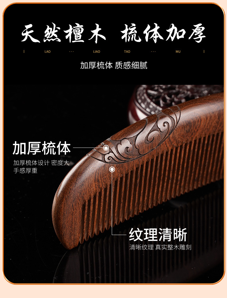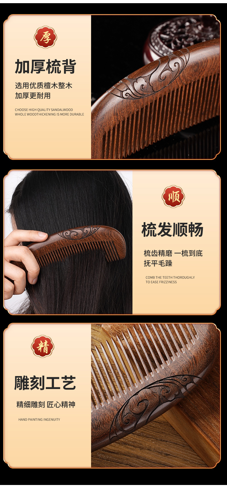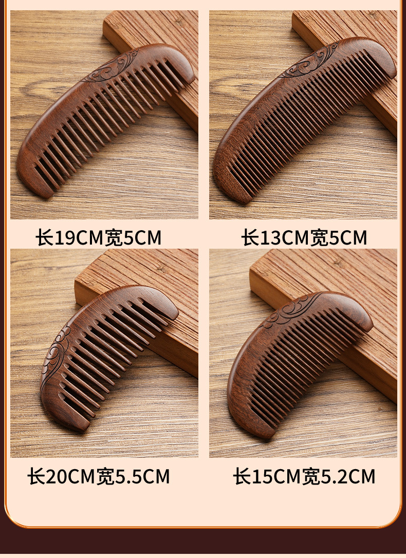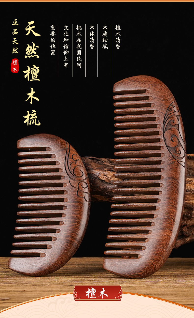 天然黑金檀木半月梳顺发按摩头皮木质半月梳子双面雕花便携按摩梳