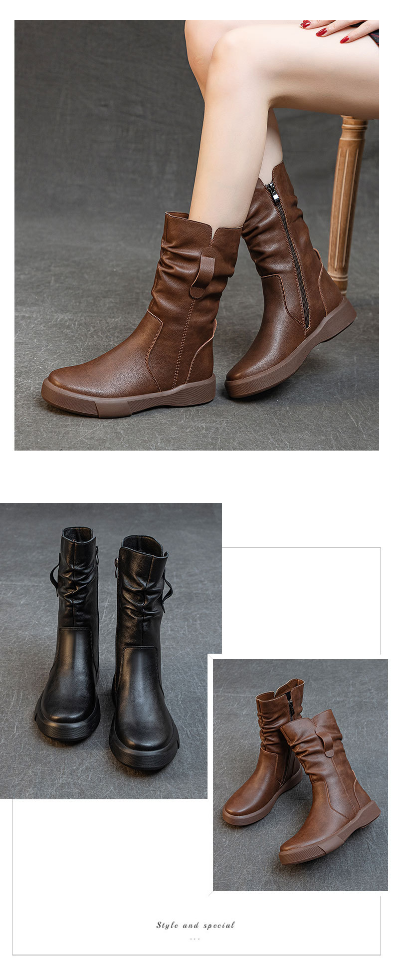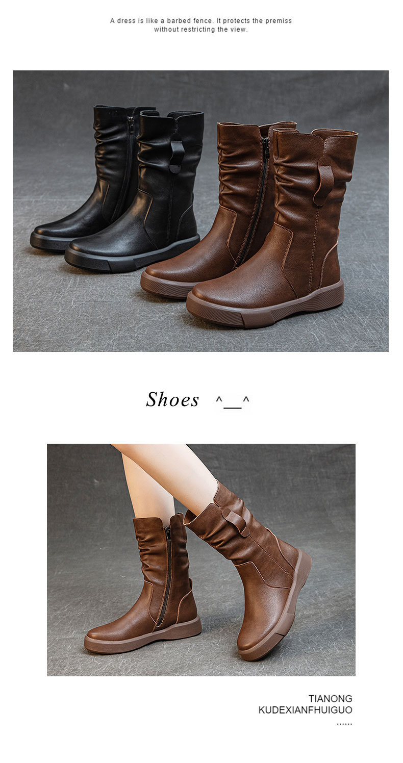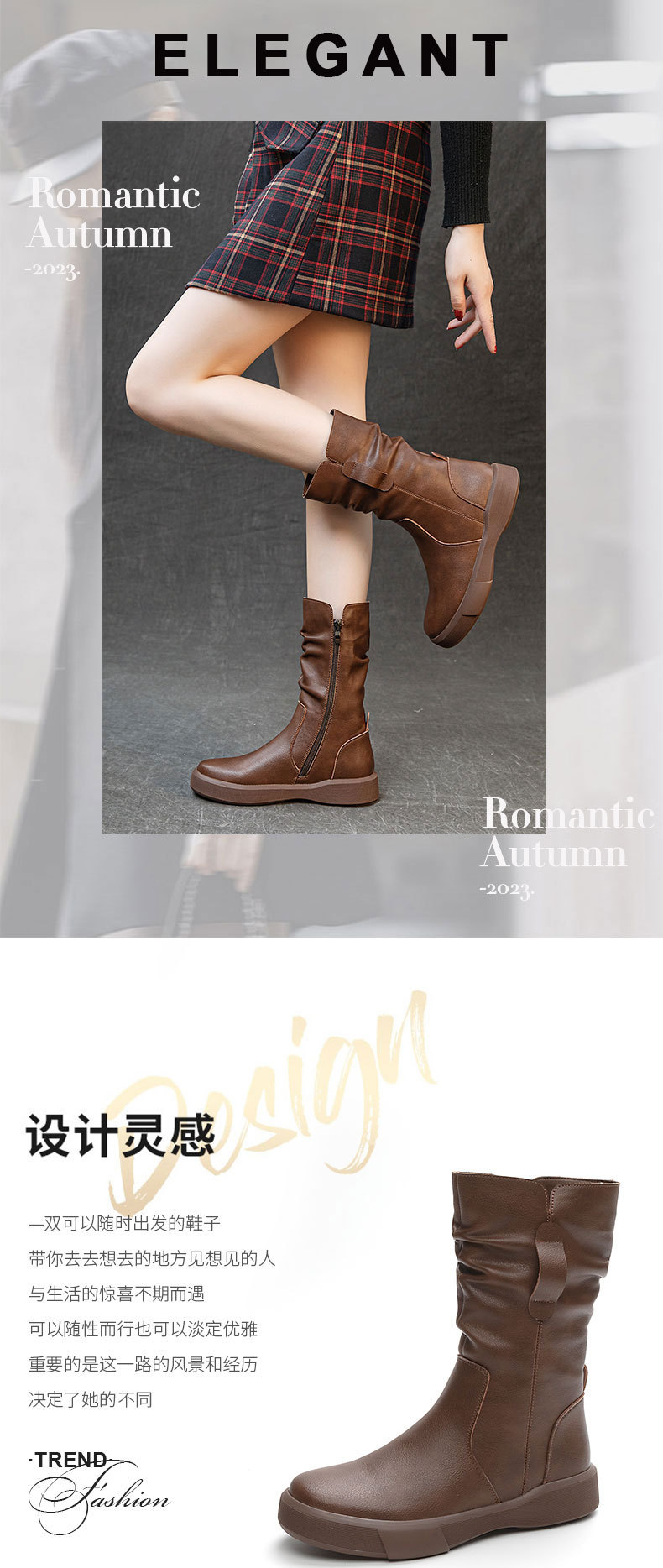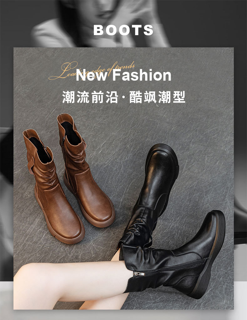 欧美简约百搭真皮马丁靴女秋冬季棕色中筒靴透气保暖粗跟厚底靴子