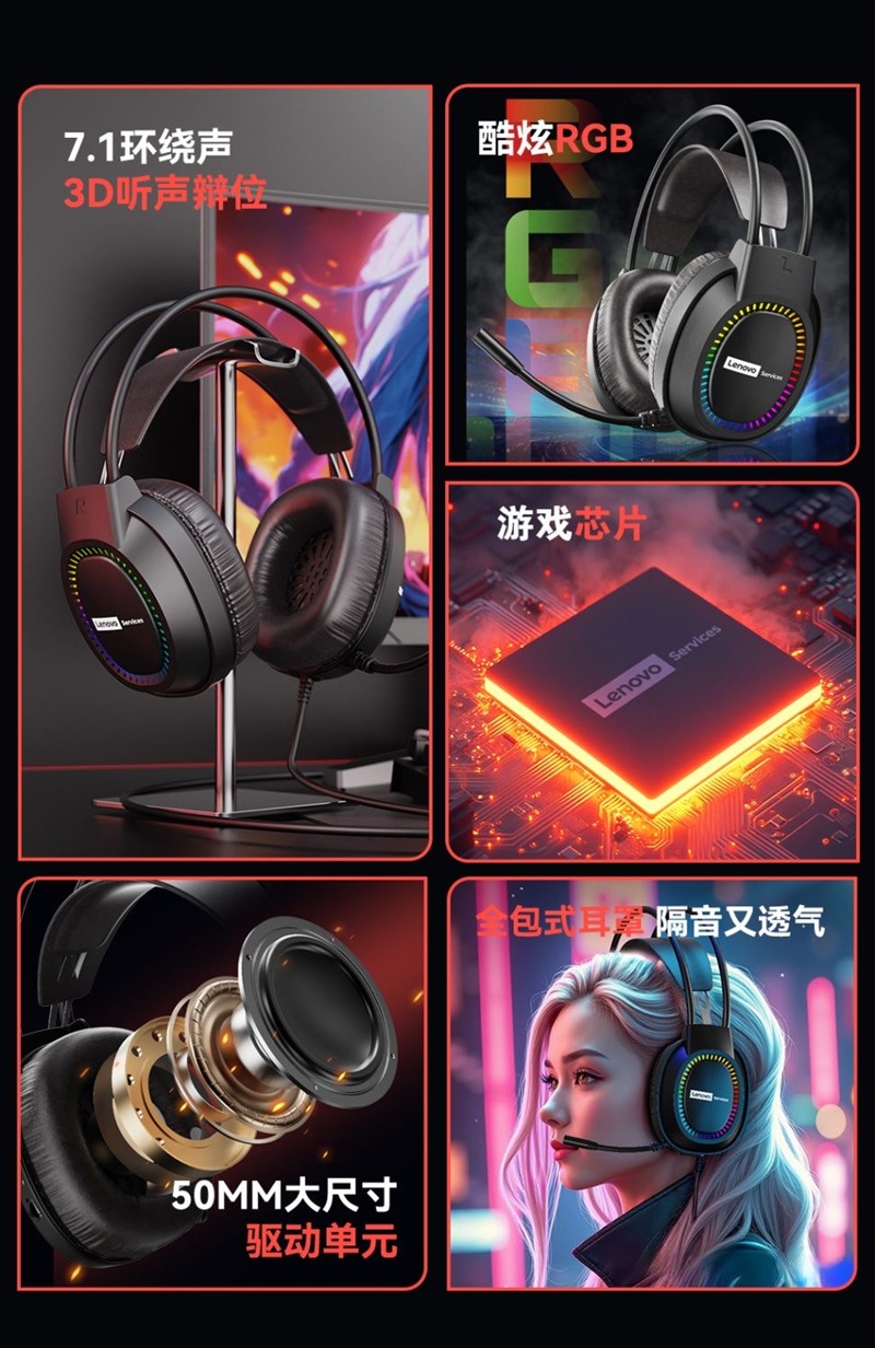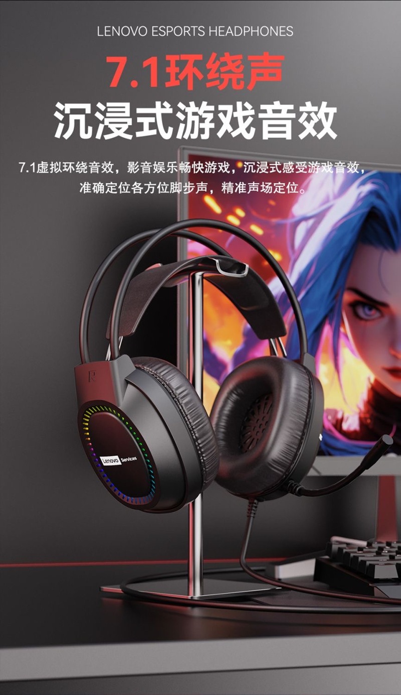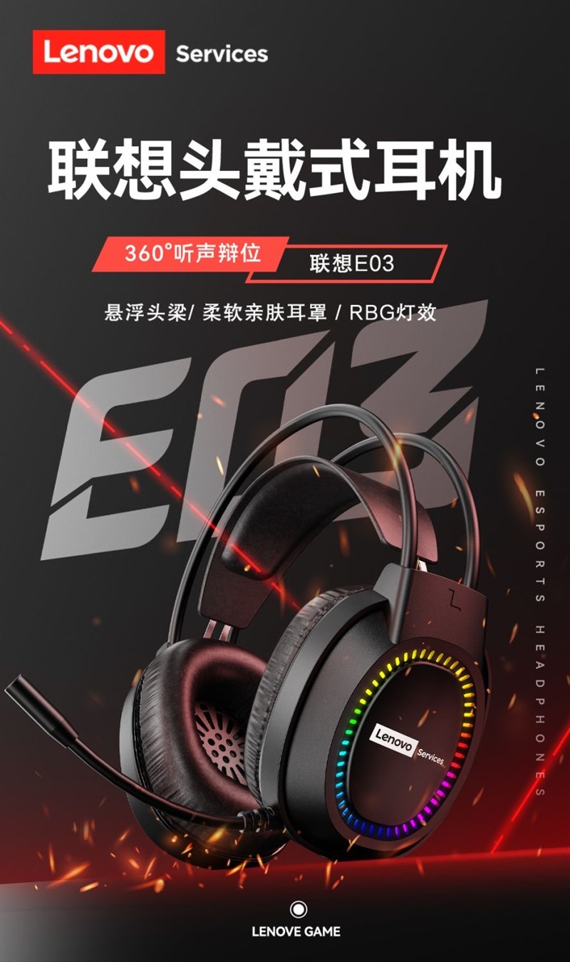 lenvo联E03头戴式笔记本台机电脑耳机USB有线耳麦7.1声道电竞游戏