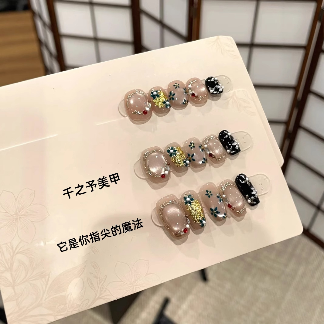 纯手工穿戴甲巴洛克金属风珍珠五彩鲜花手绘甲片高级感显白美甲贴