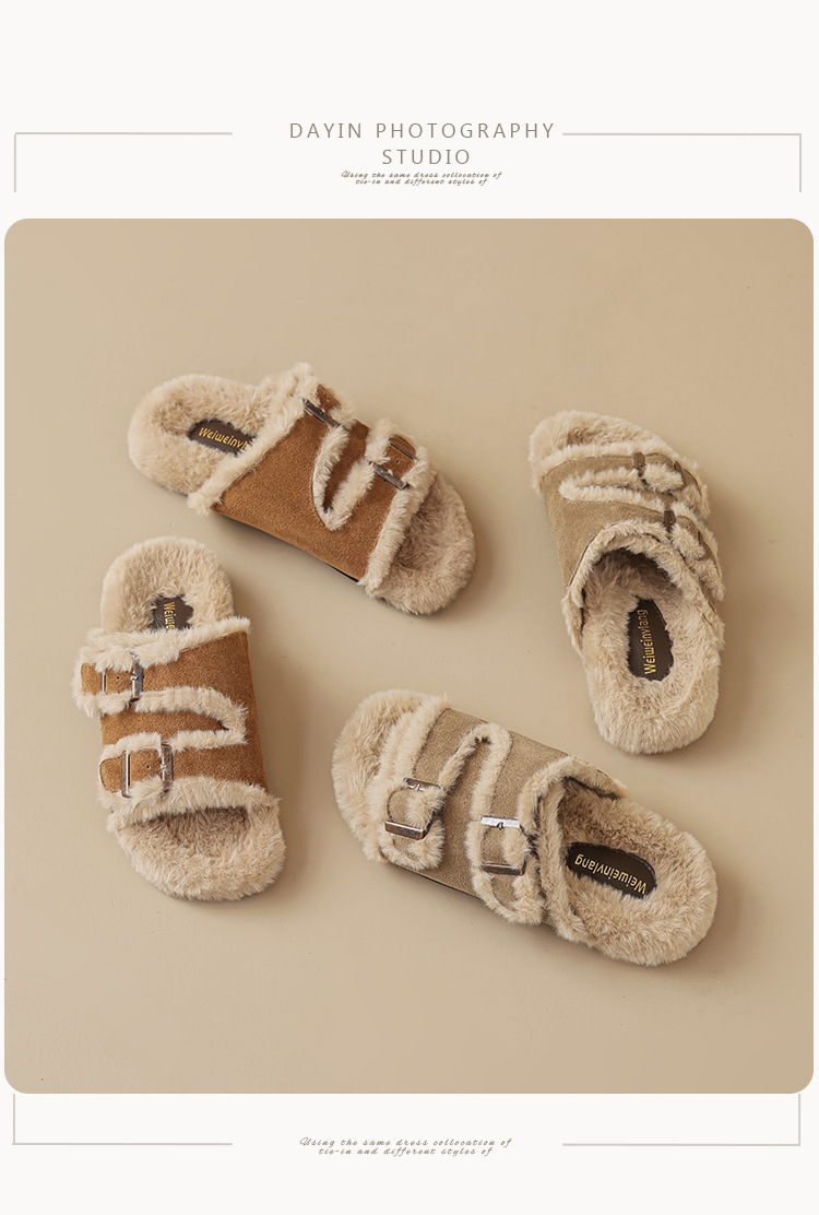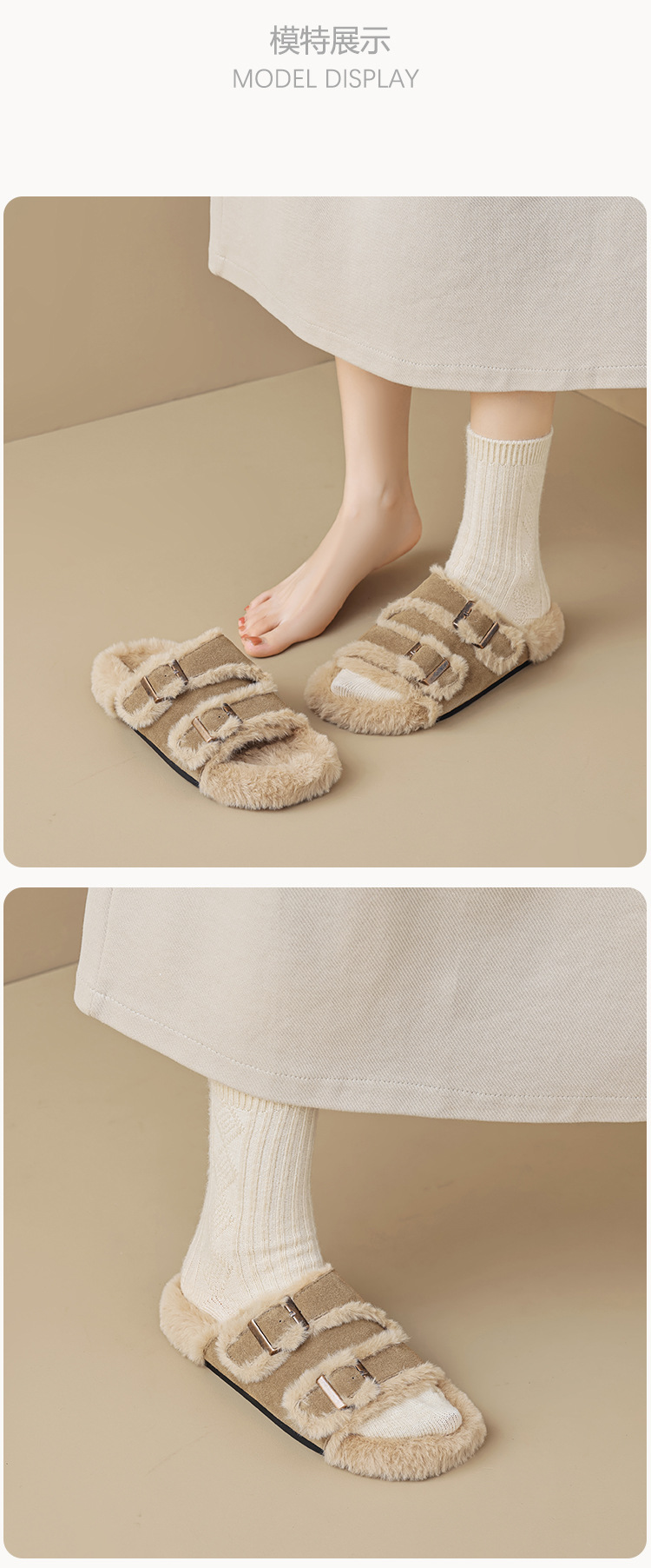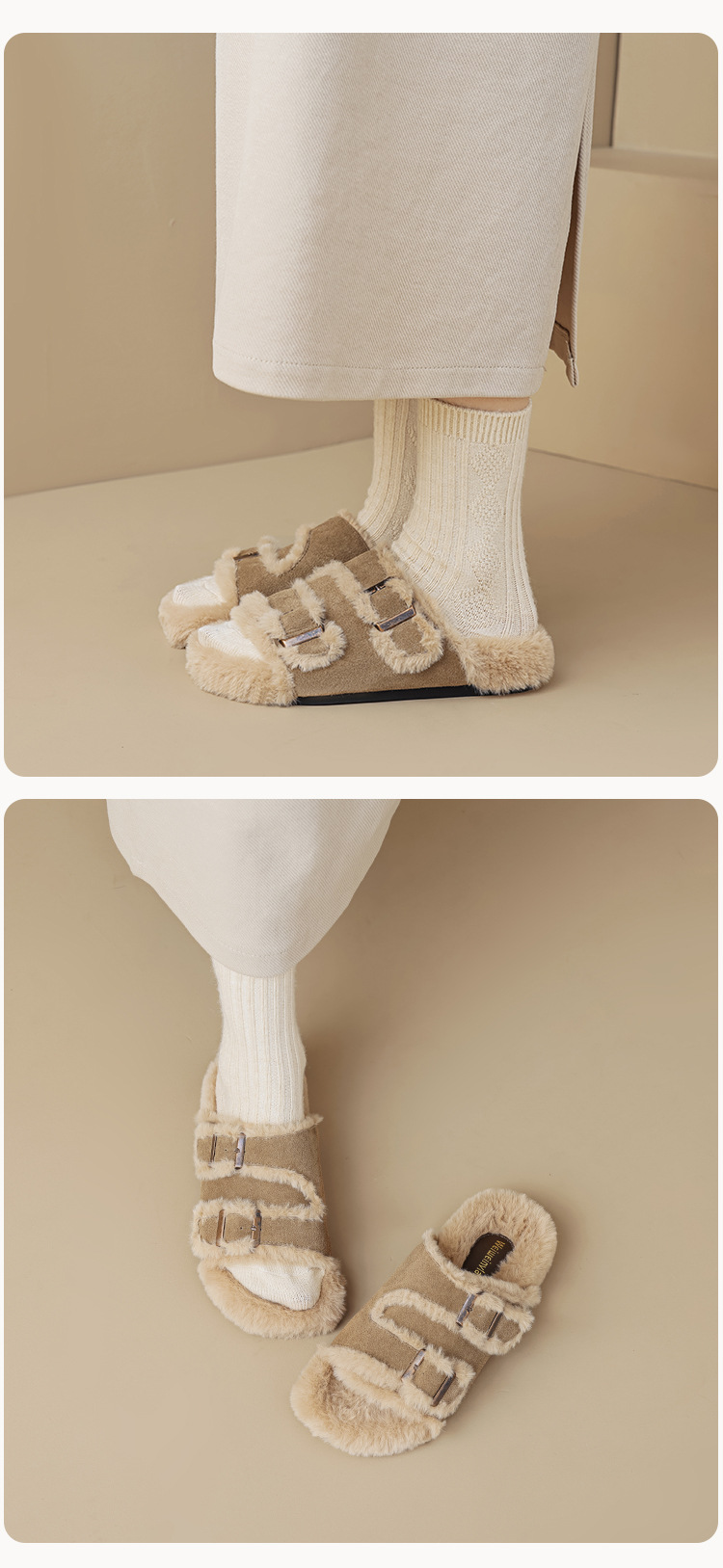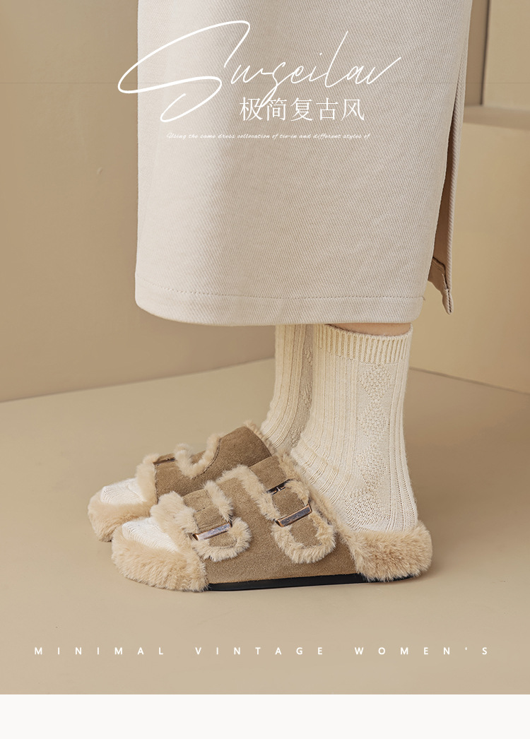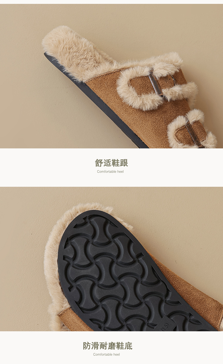 威威女郎 22-6复古真皮棉拖鞋女秋冬外穿厚底毛毛拖一字带勃肯鞋