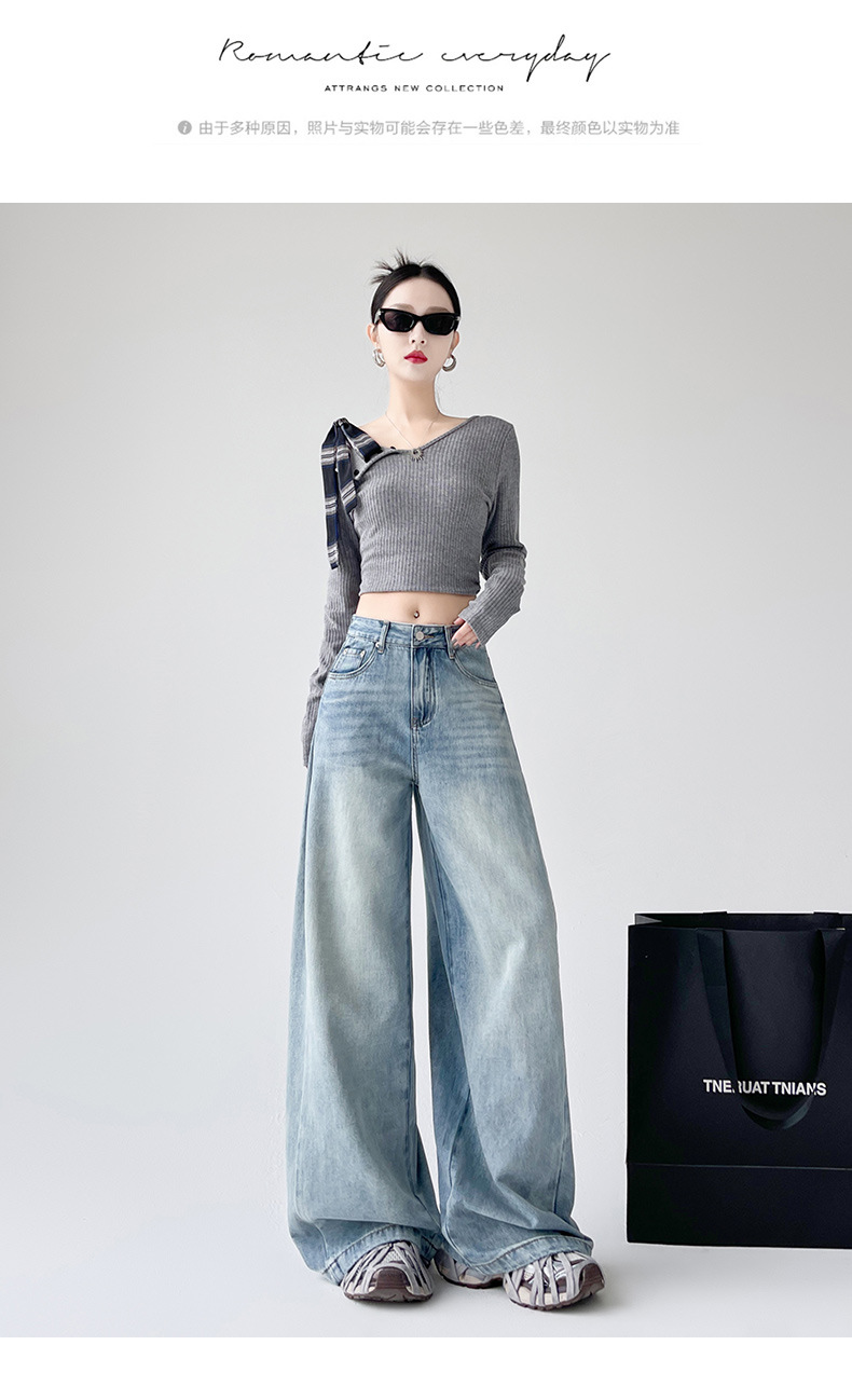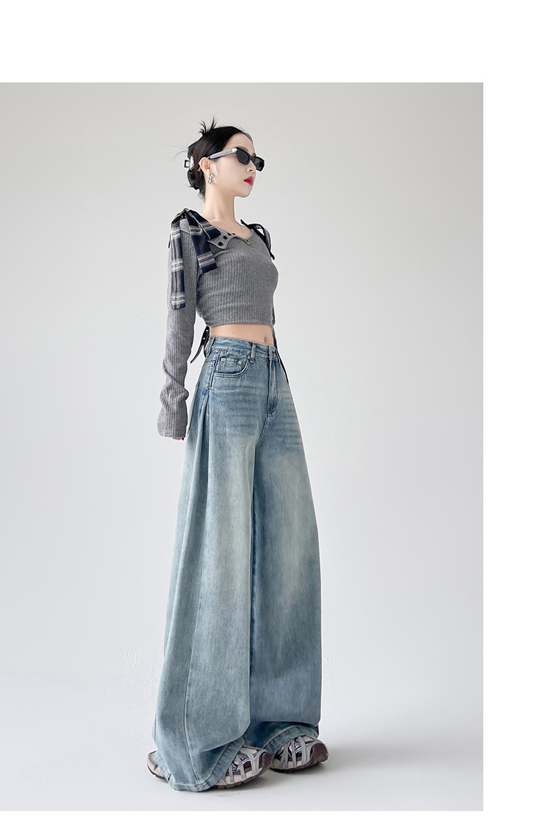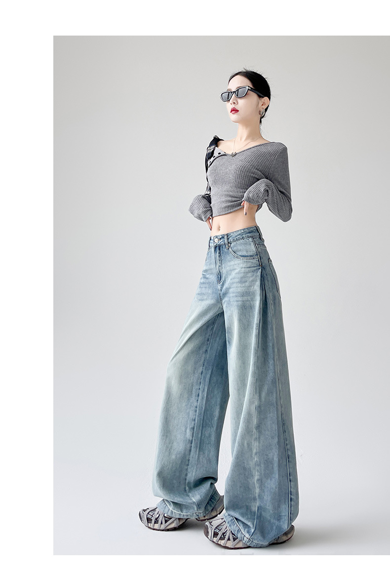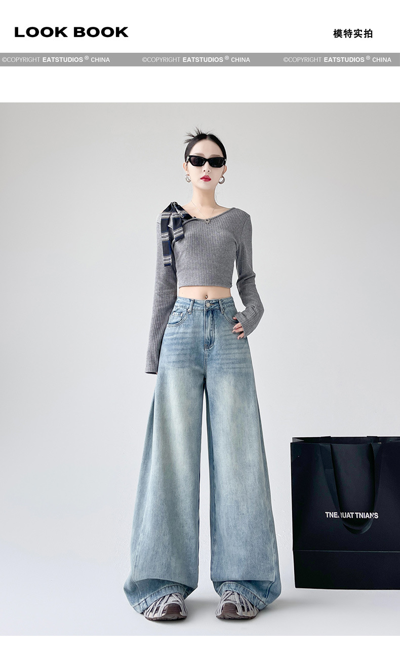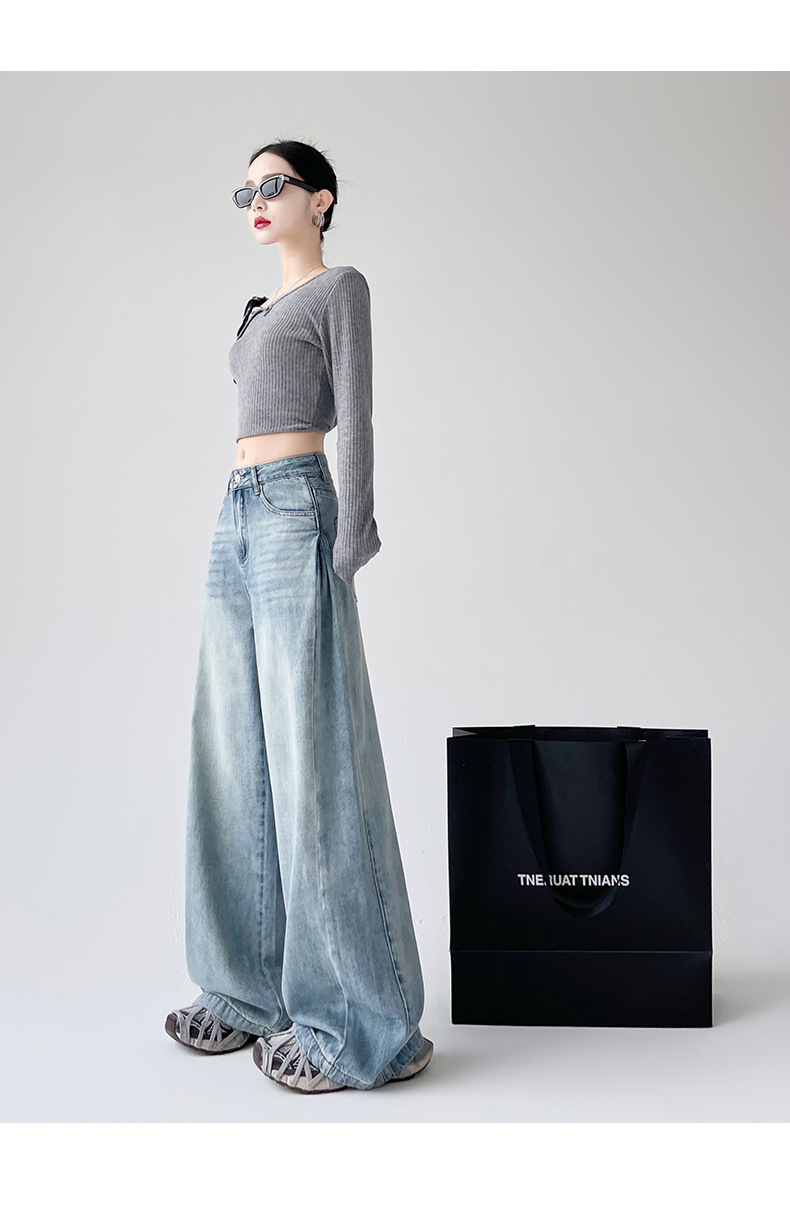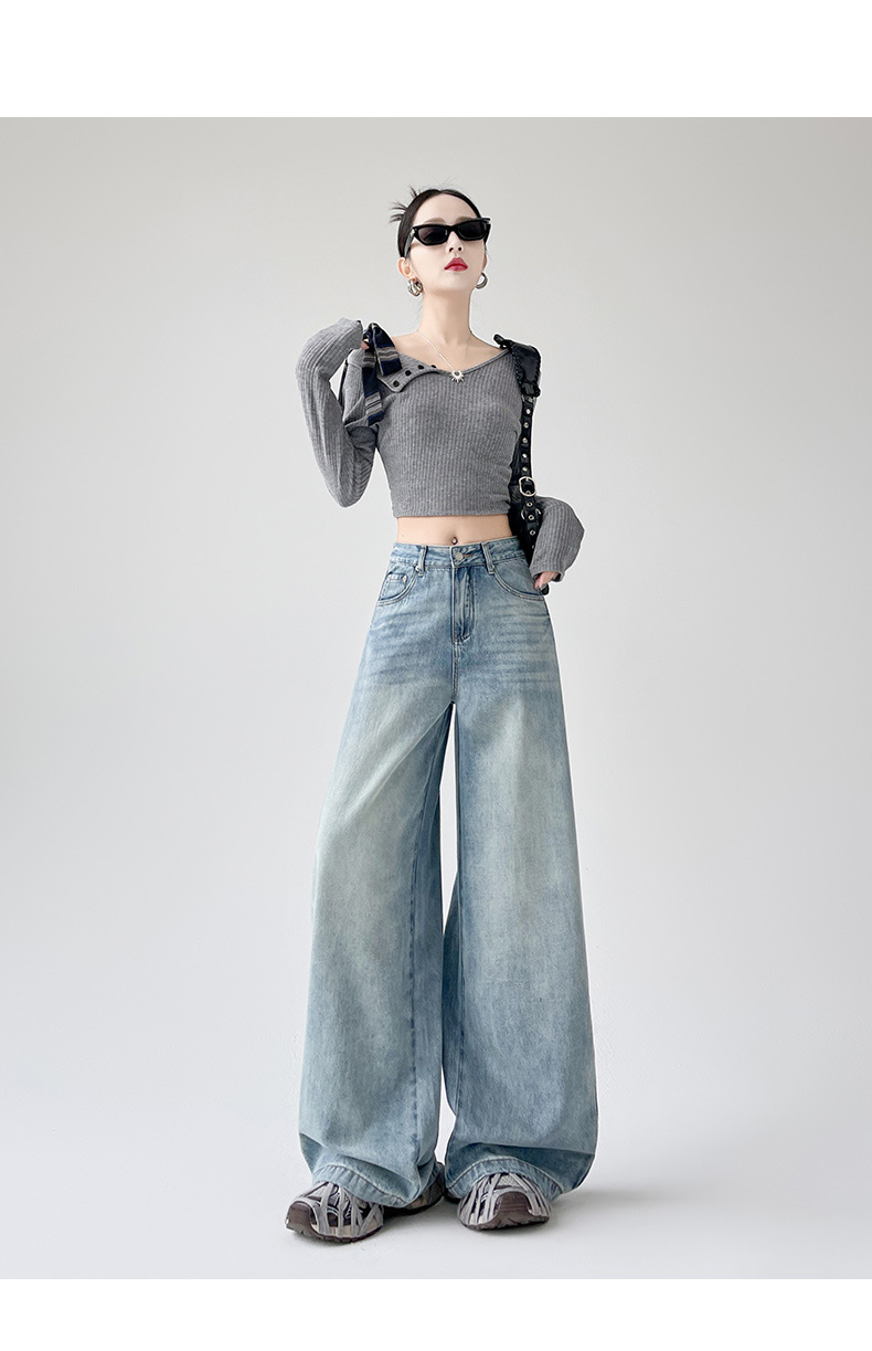 高腰宽松水洗牛仔裤女显瘦垂感直筒裤拖地裤阔腿裤长裤子蓝色长裤