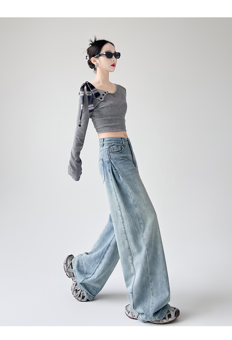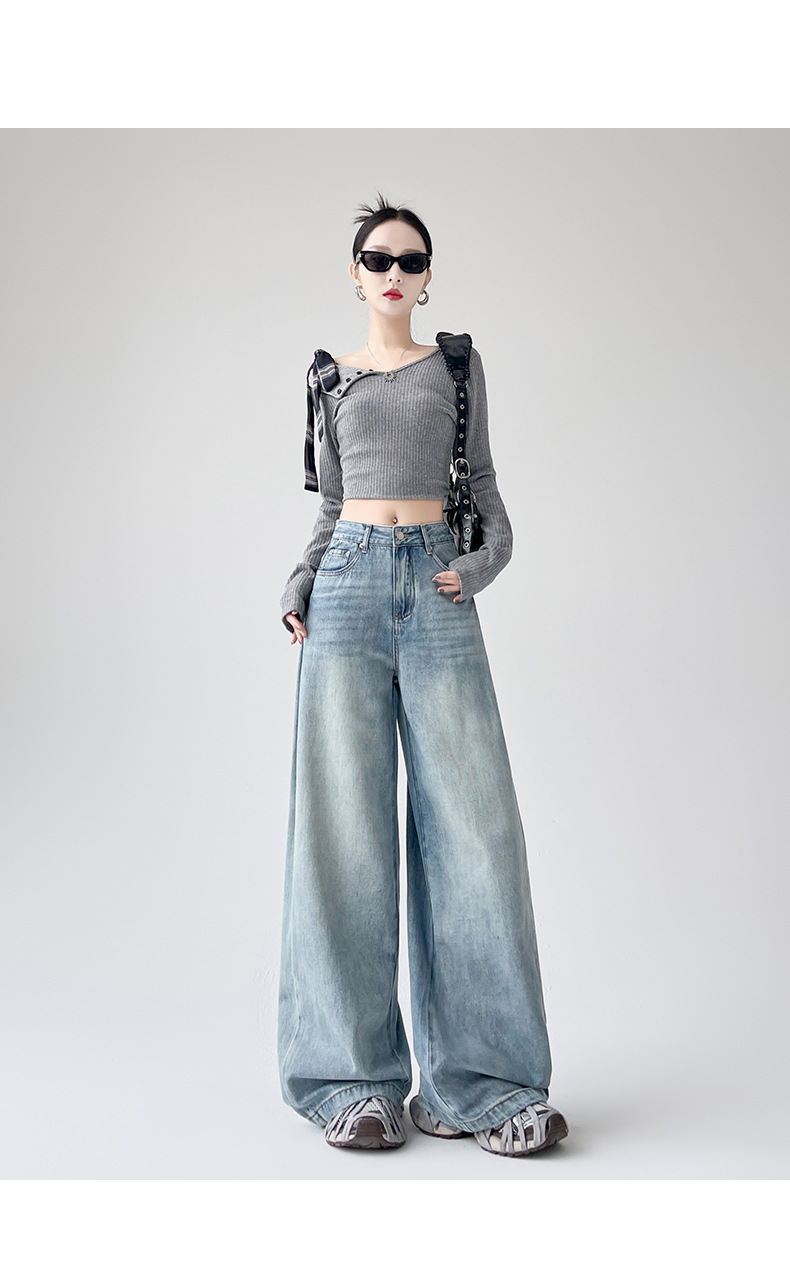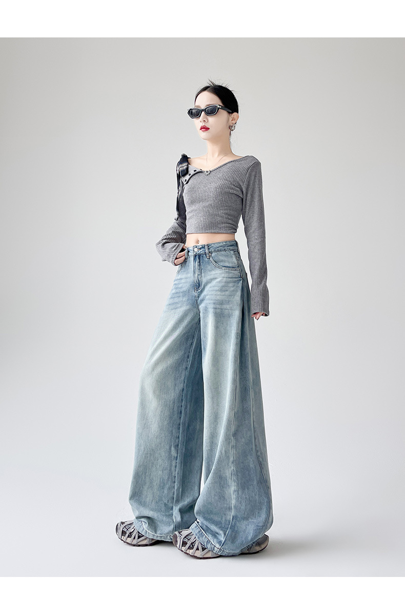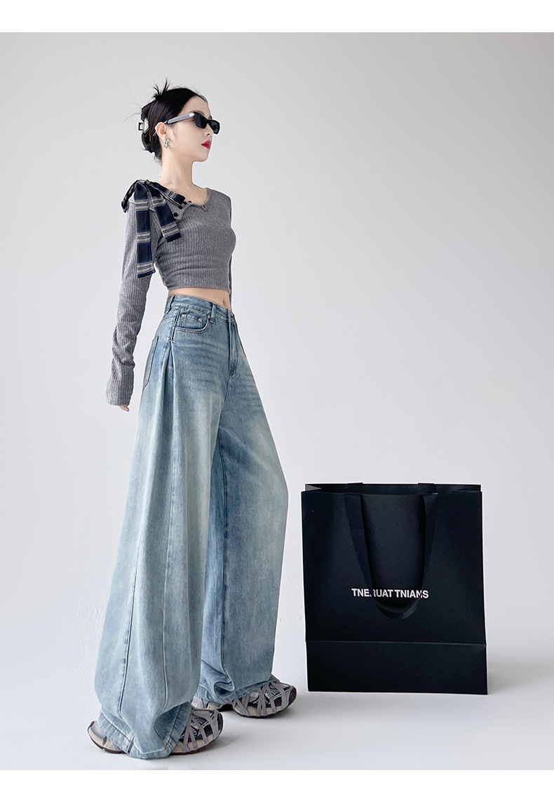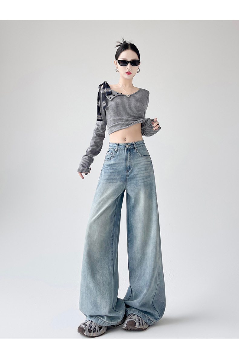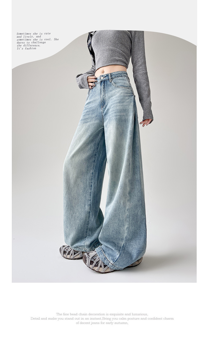 高腰宽松水洗牛仔裤女显瘦垂感直筒裤拖地裤阔腿裤长裤子蓝色长裤