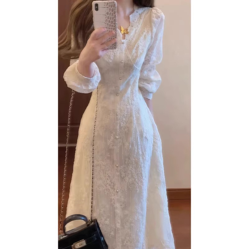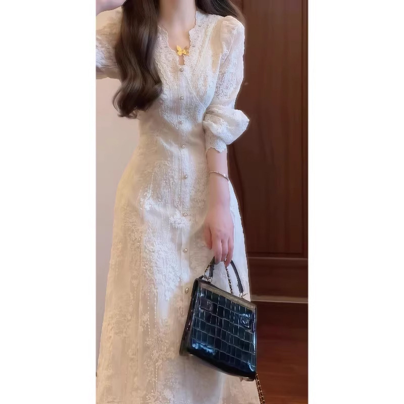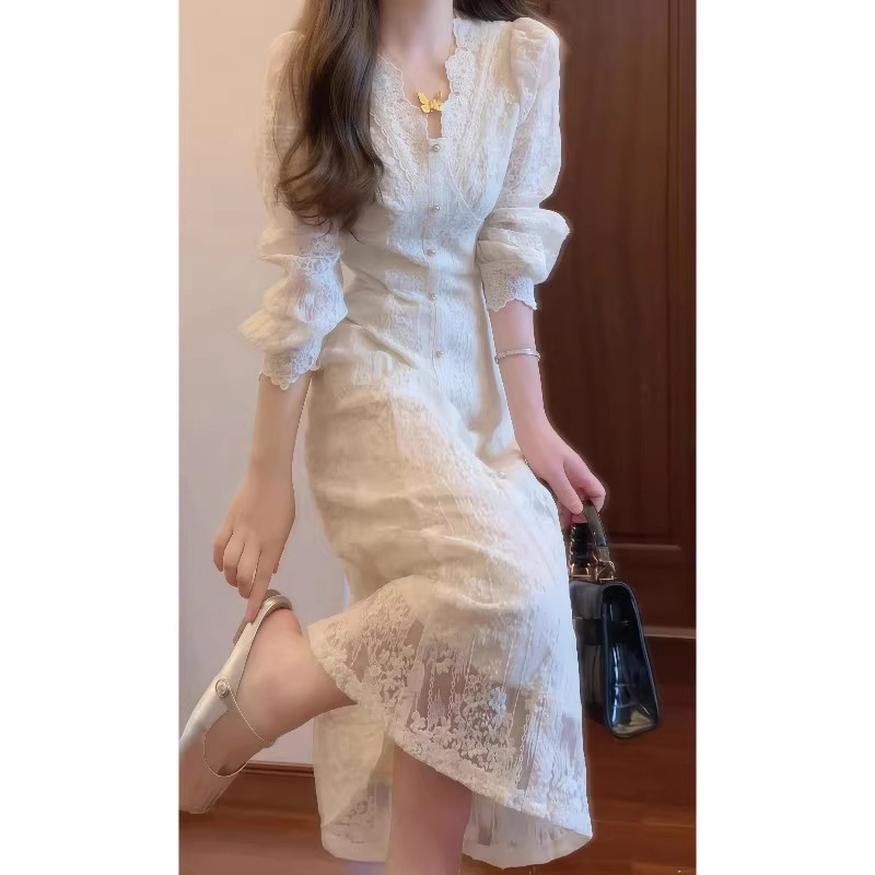 2025秋季新款法式甜美温柔风白色蕾丝连衣裙女长袖收腰气质长裙子
