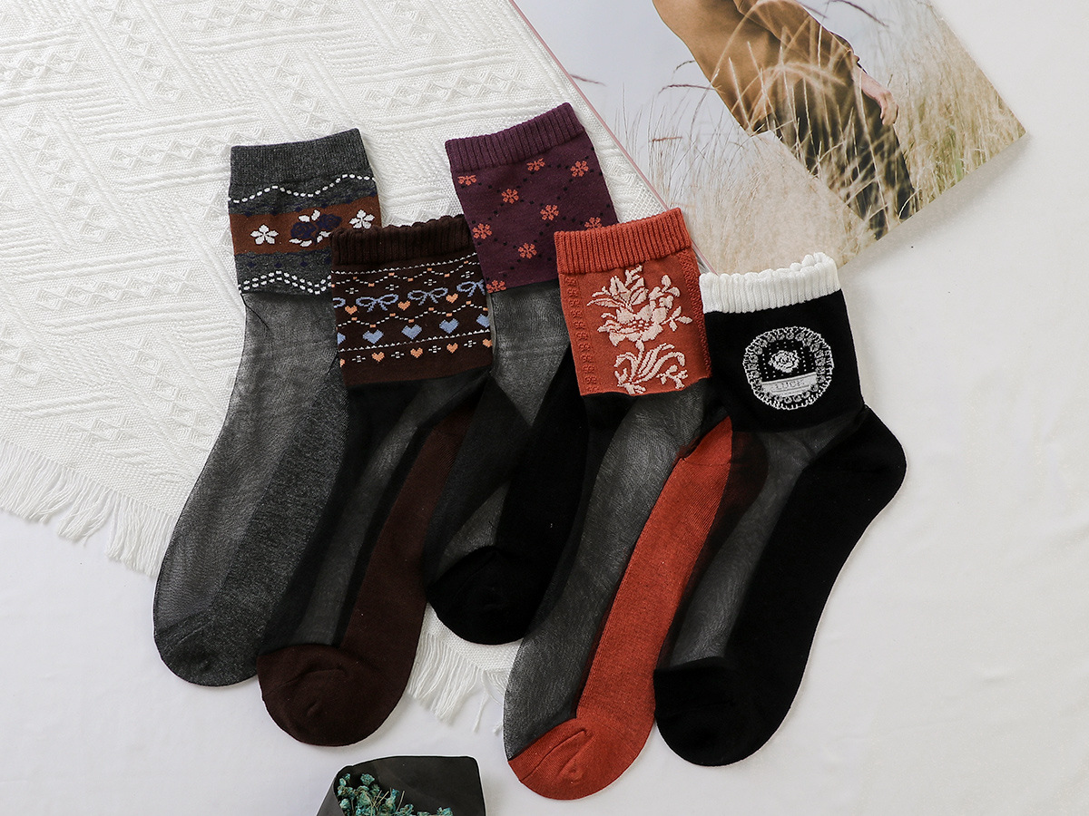 蝴蝶结袜子女士中筒袜春秋韩国花边圆点卡丝女袜棉底透明透气批发