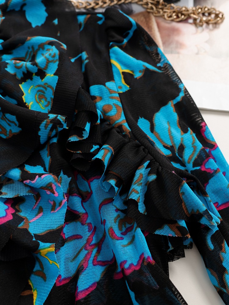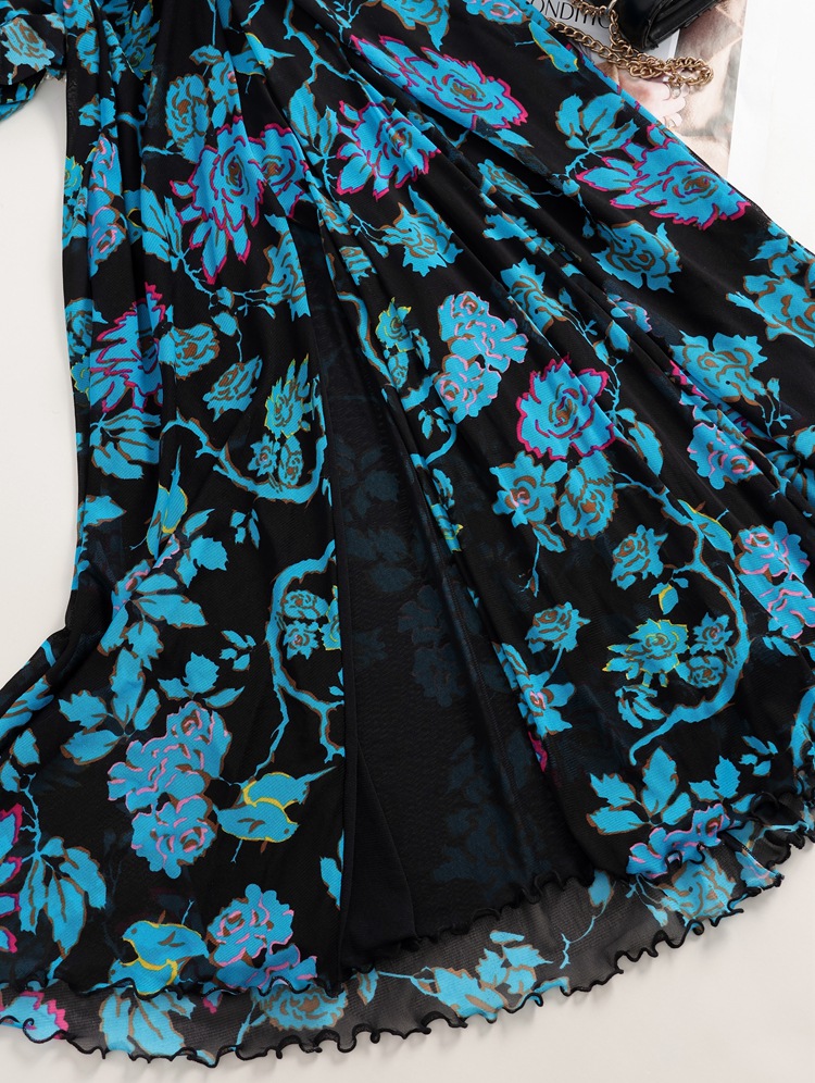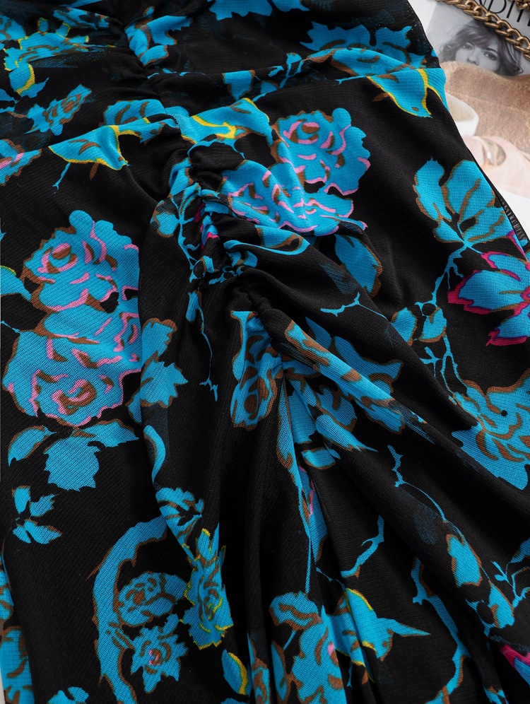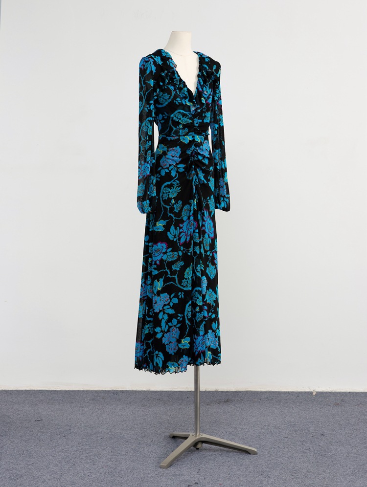 [现货]李湘同款修身弹力印花长款连衣裙抽褶设计V领长袖碎花裙子
