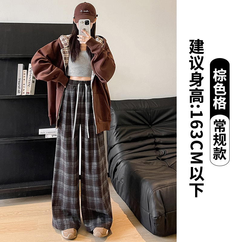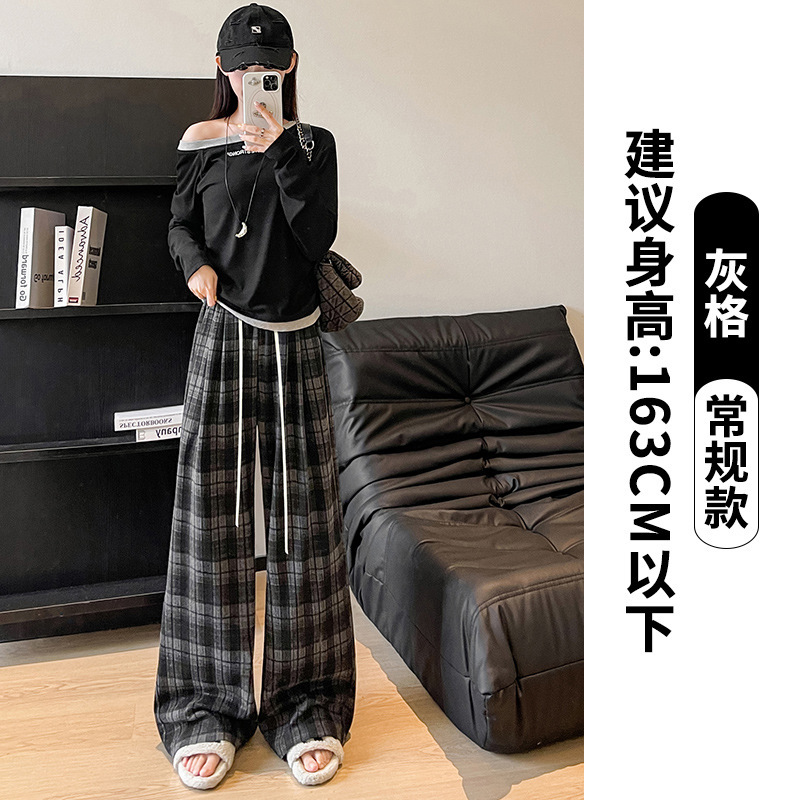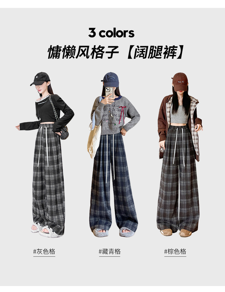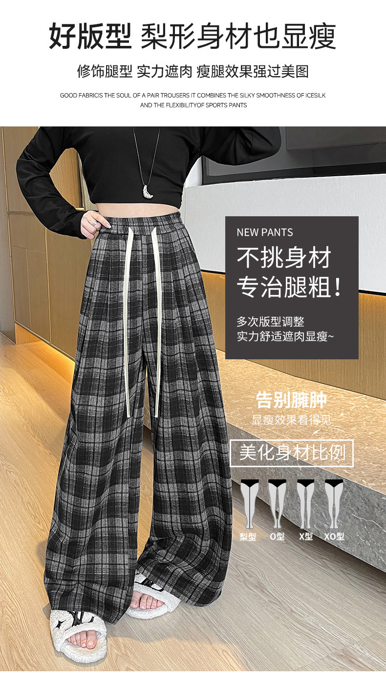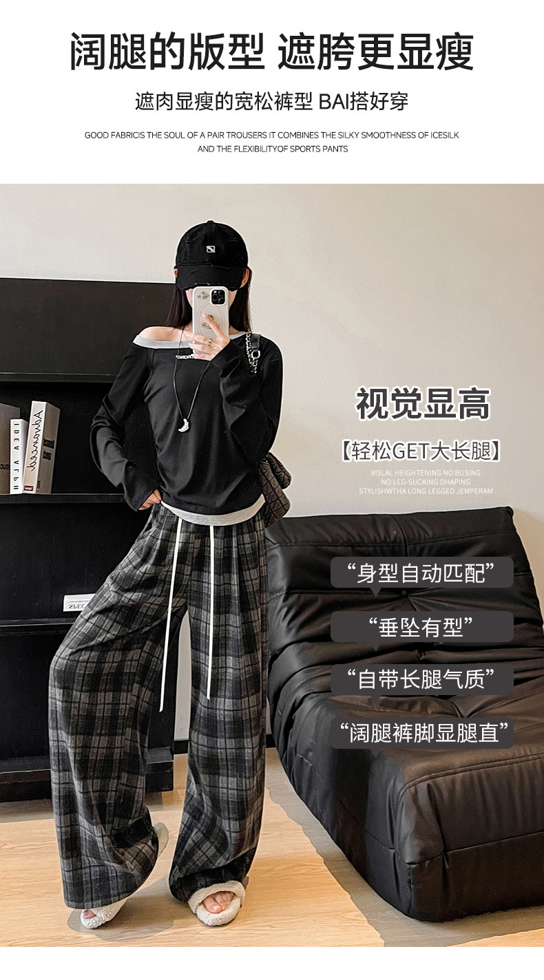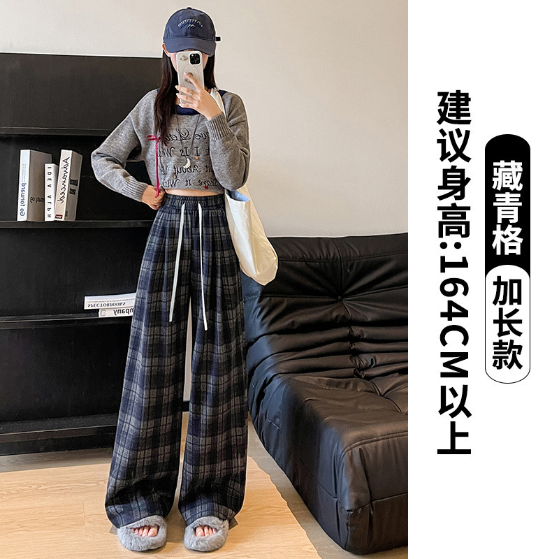 藏青色格子裤女2025春秋新款高腰垂感直筒裤宽松显瘦小个子阔腿裤