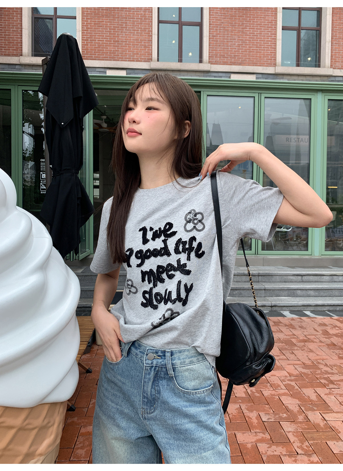 原创字母牙刷绣印花长袖t恤女春夏新款宽松纯棉圆领上衣