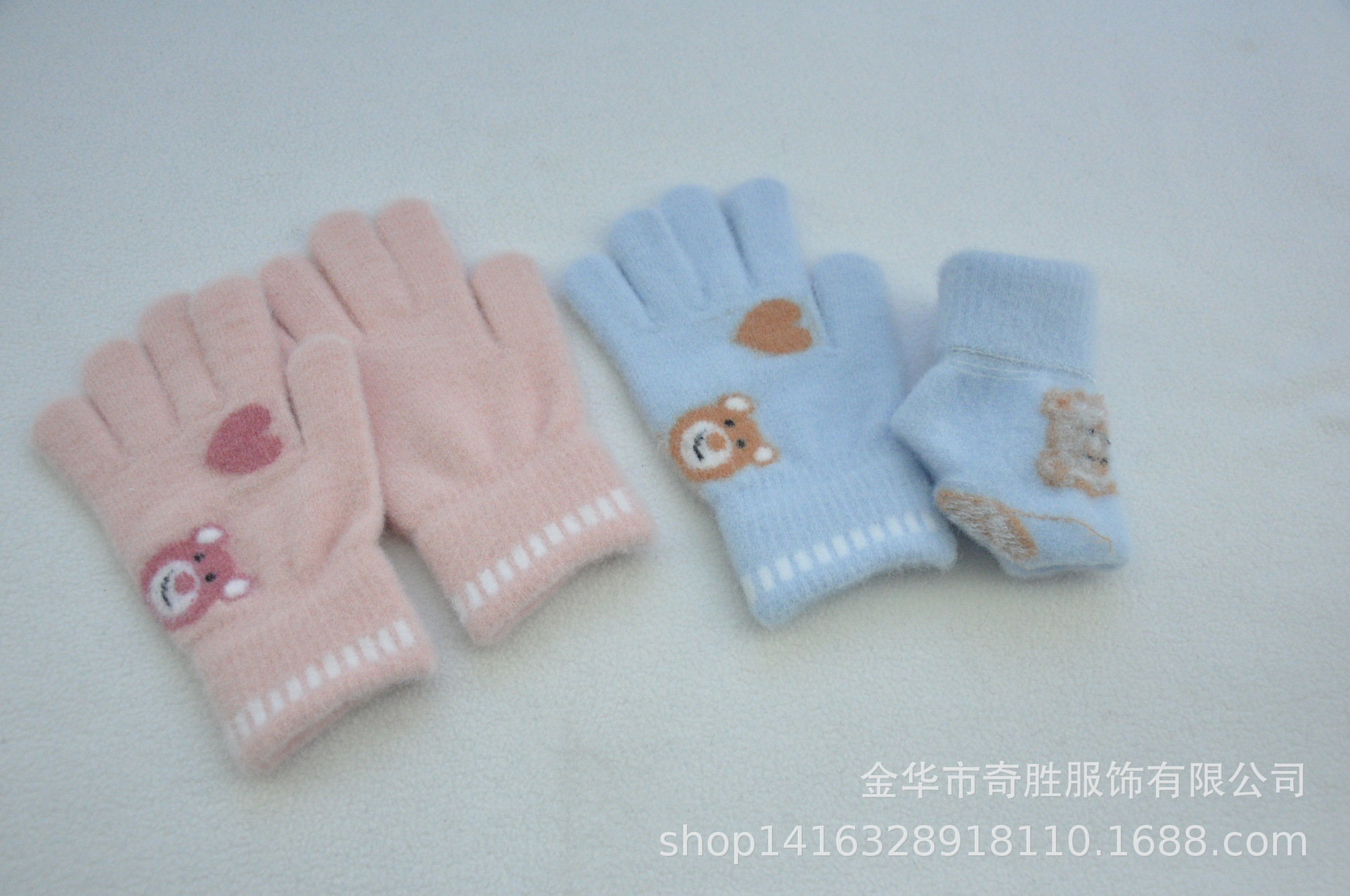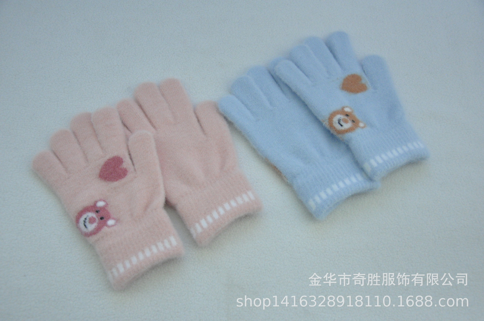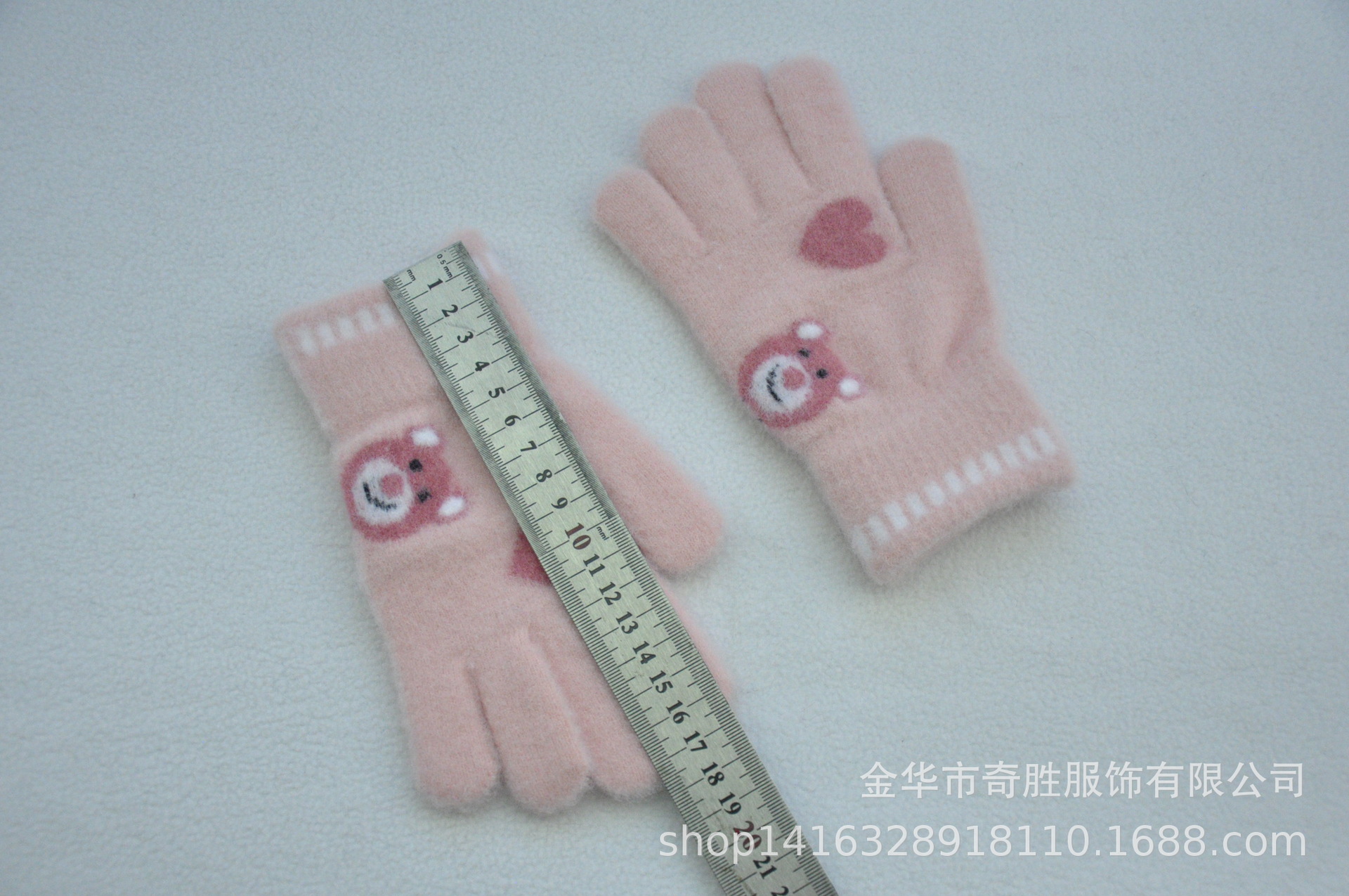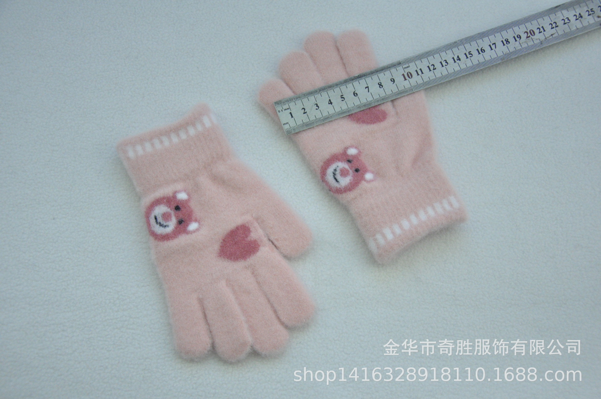 儿童新款冬季保暖加绒加厚貂毛手套男女中童全指防寒小熊提花手套