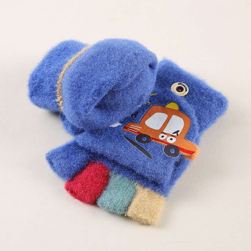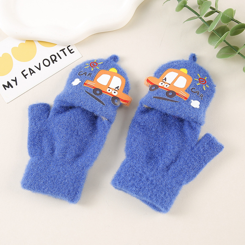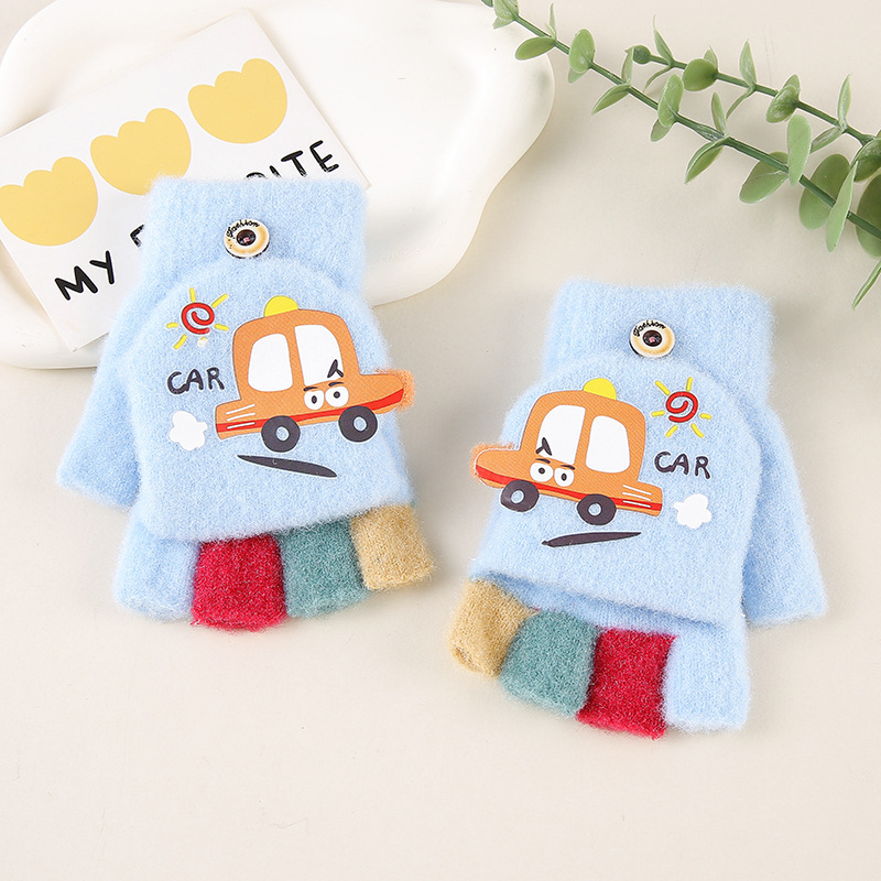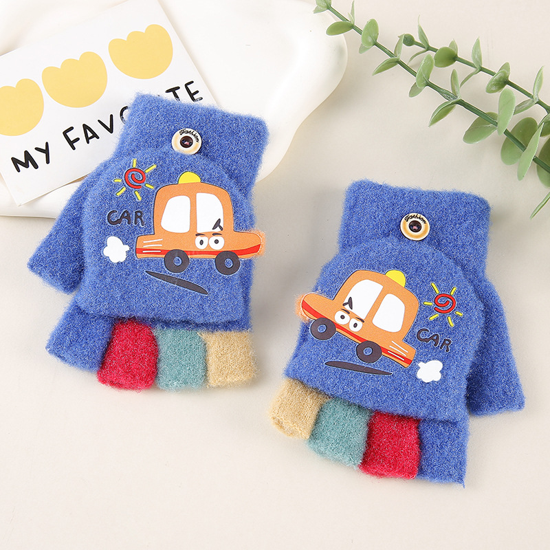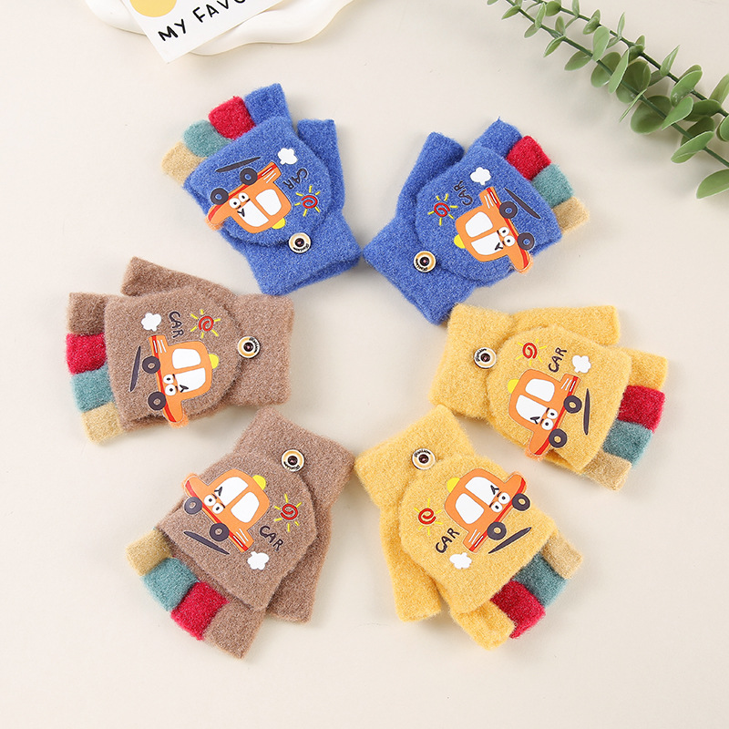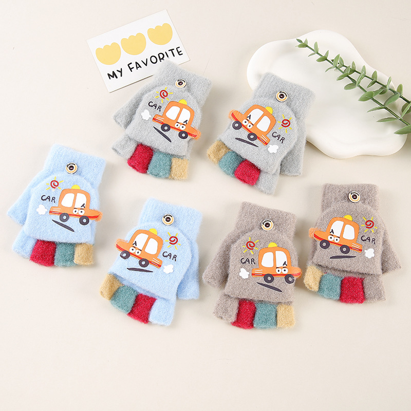 儿童手套冬天保暖小男孩卡通可爱汽车幼儿园男童半指翻盖两用手套