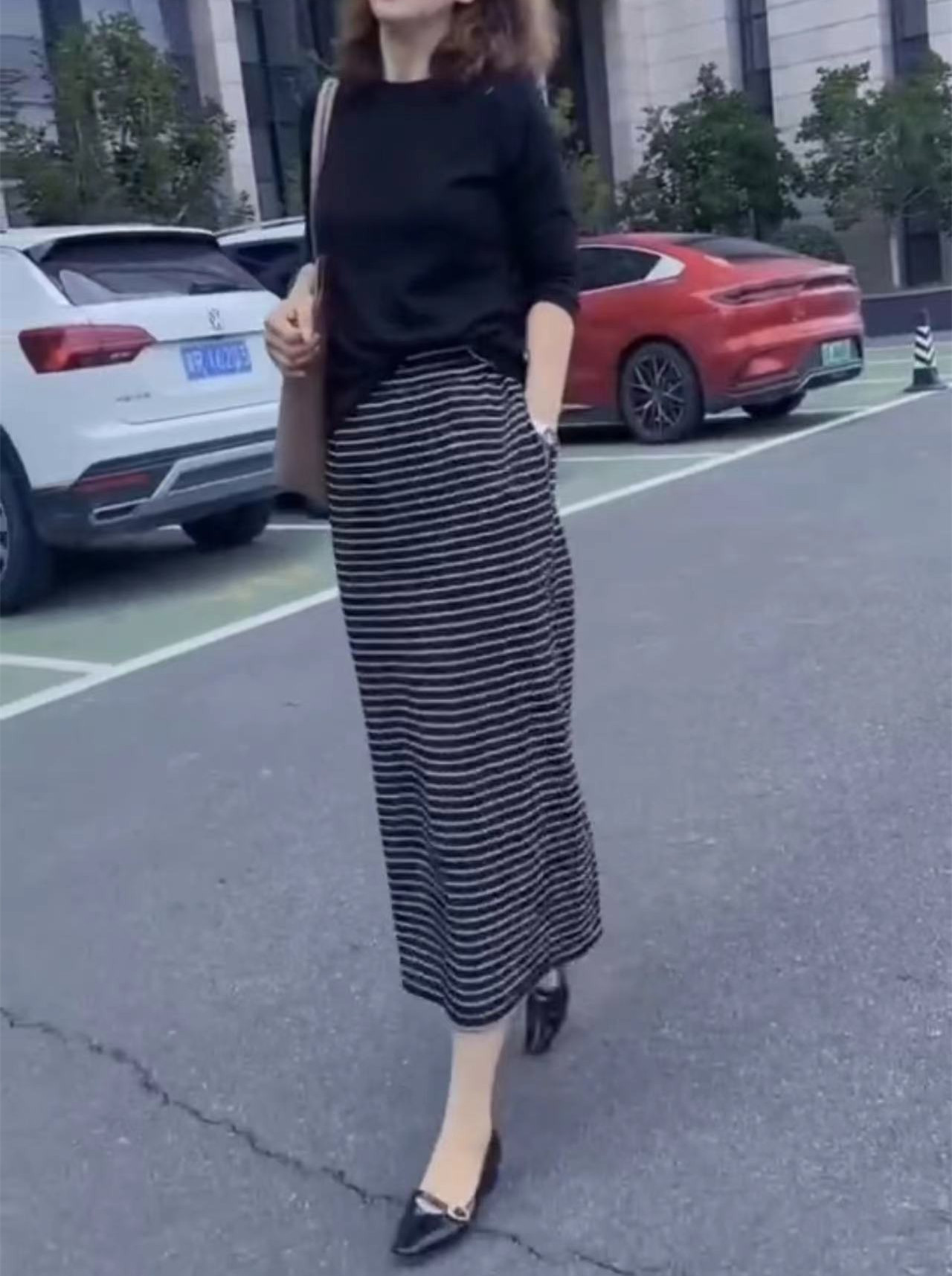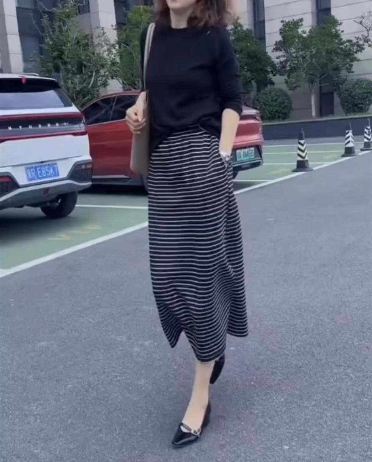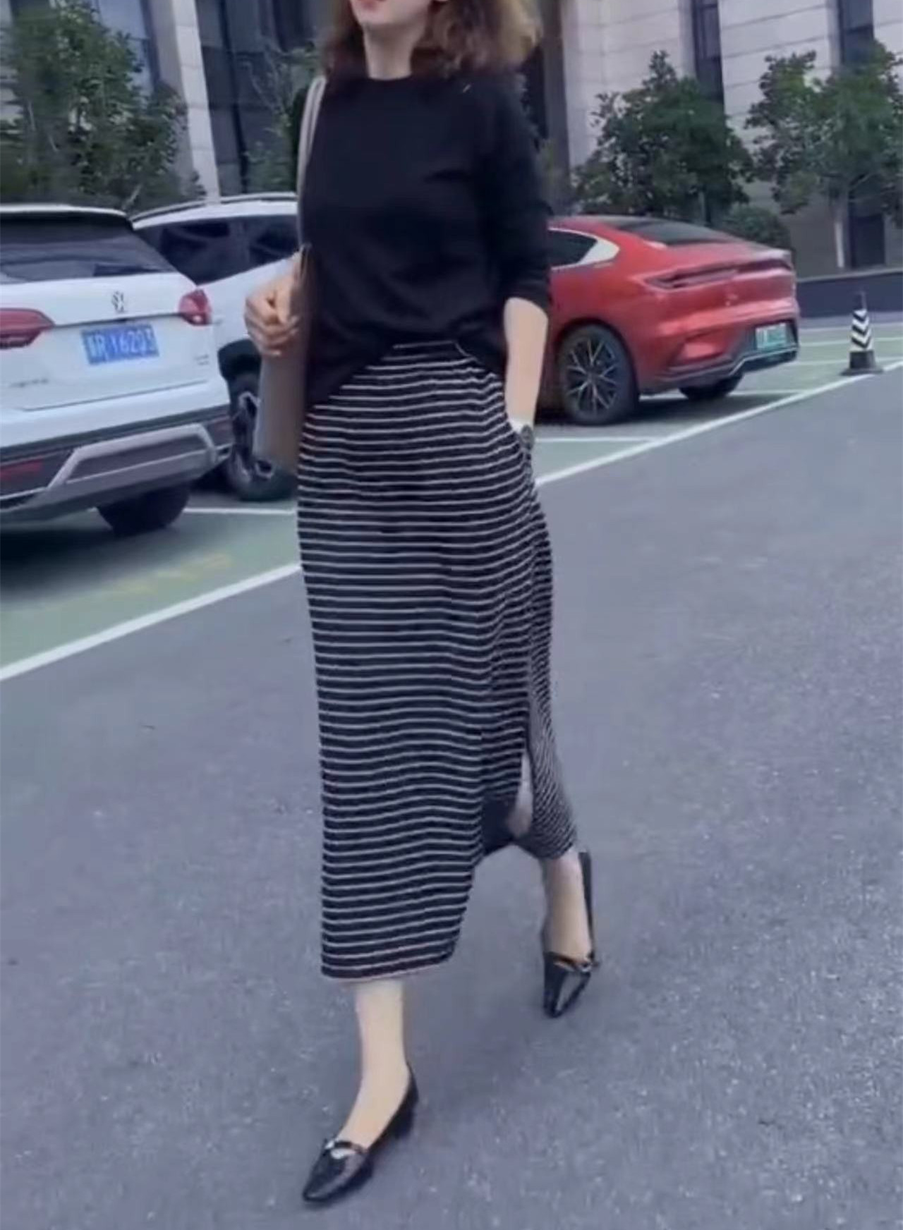 24887大爱美依缘2025秋季新款纯色宽松T恤侧边开叉条纹半身裙女装