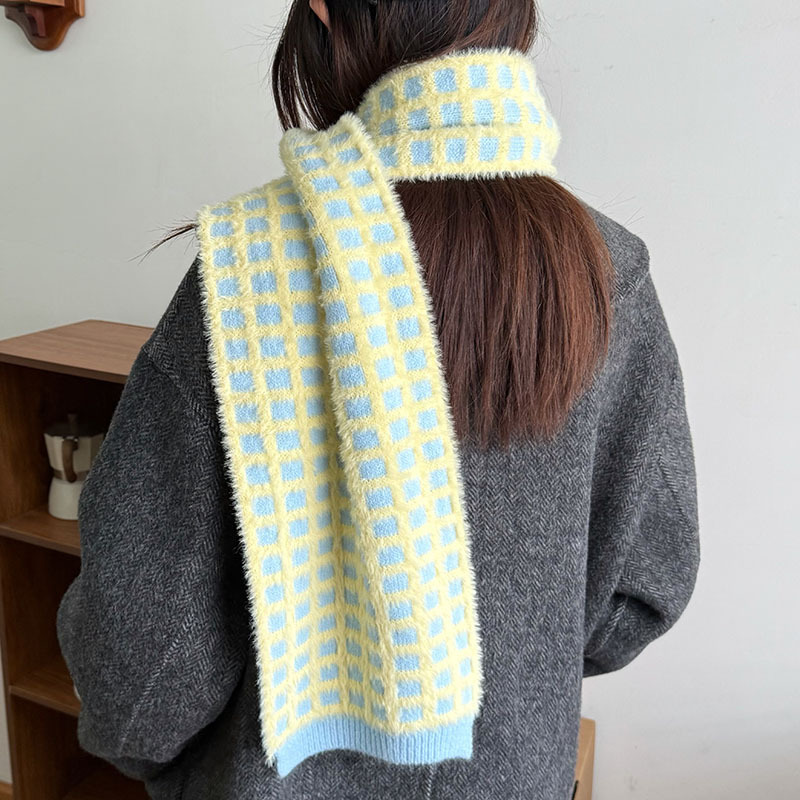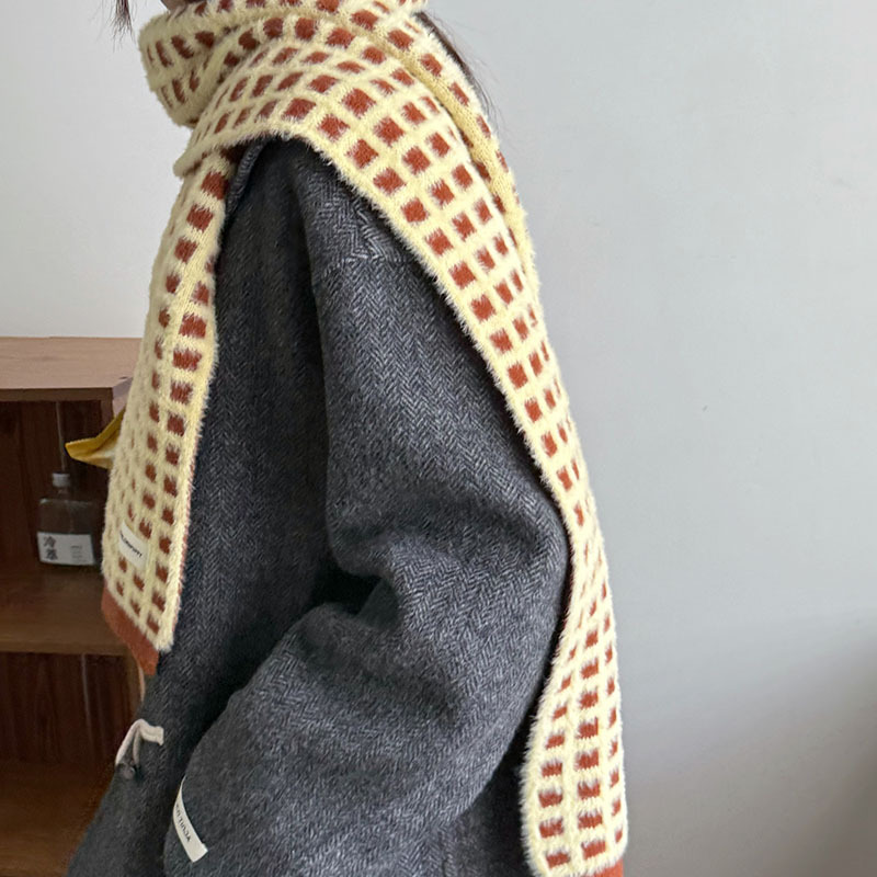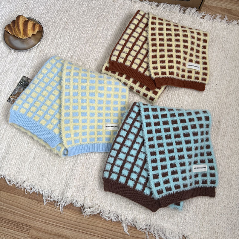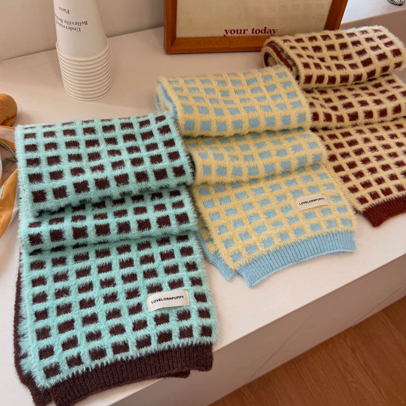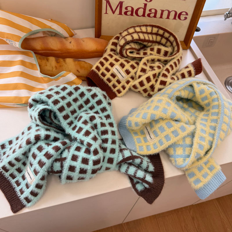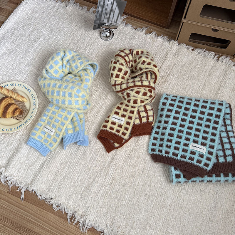 华夫格韩系氛围感棋盘格子针织围巾女秋冬季高级感仿羊绒保暖围脖