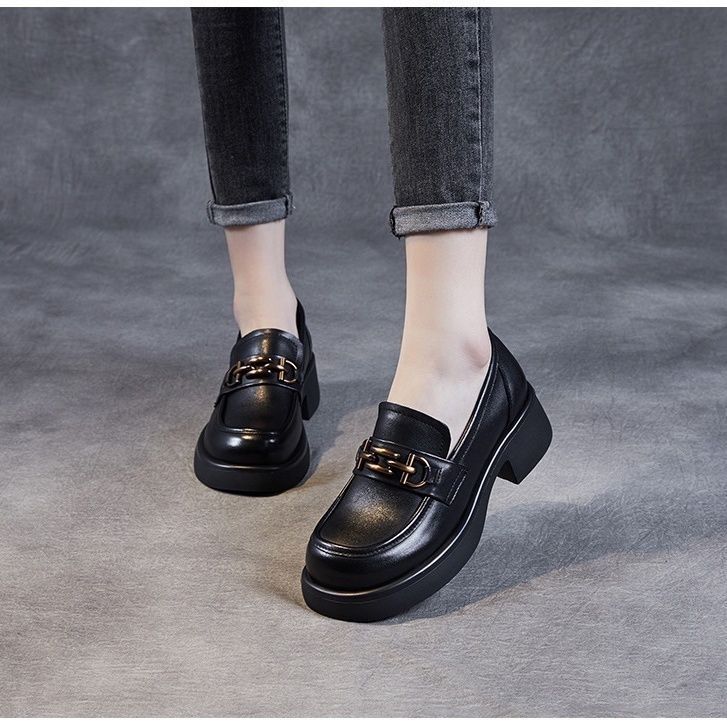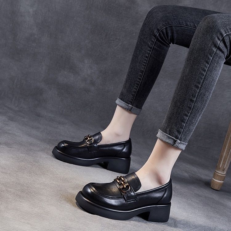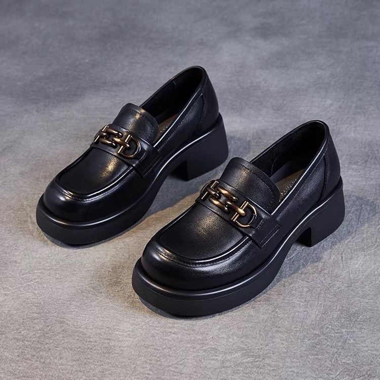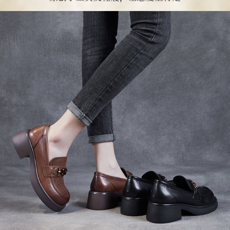 软皮小众粗跟小皮鞋女设计感英伦风2025春季百搭一脚蹬乐福单鞋子