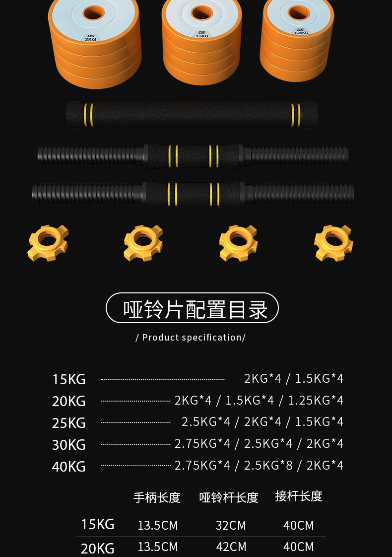 包铁哑铃男女健身家用健身器材可调节重量实心10KG20公斤杠铃套装