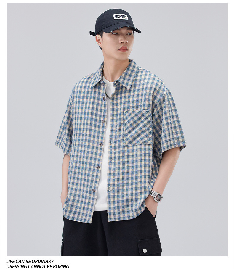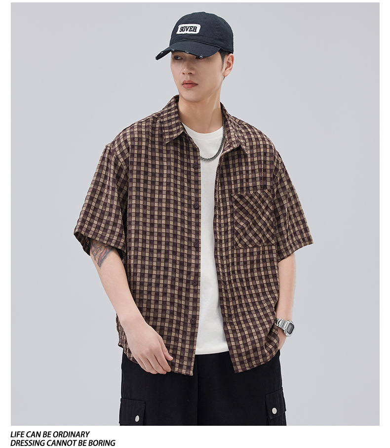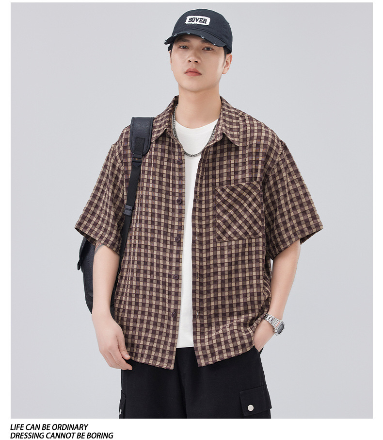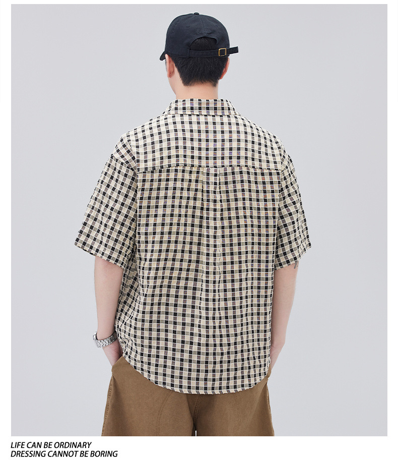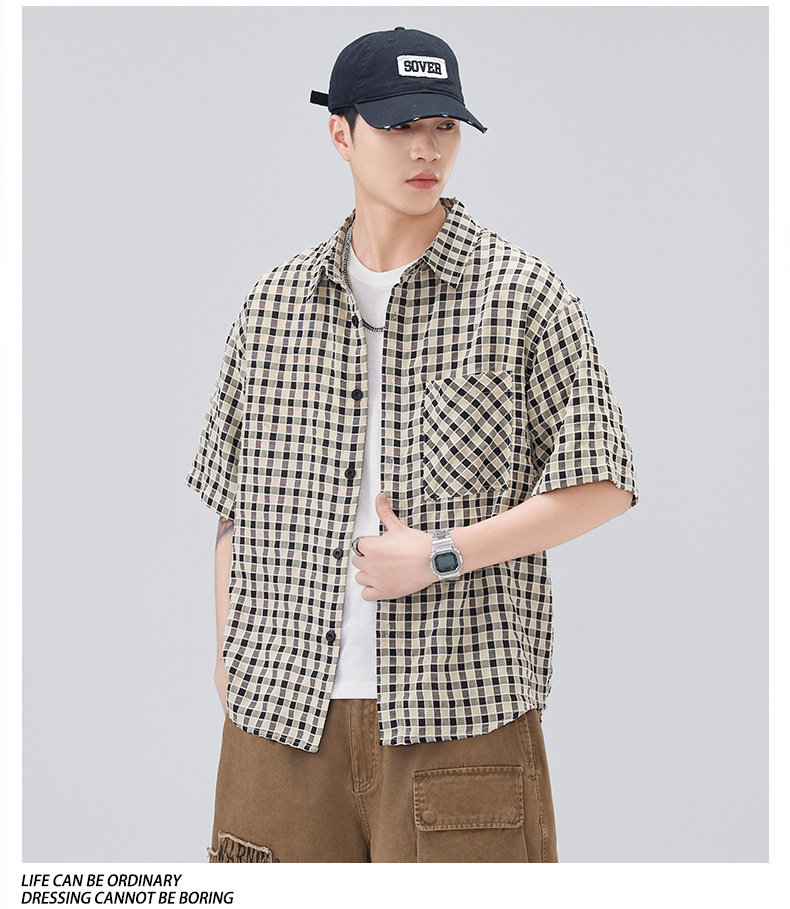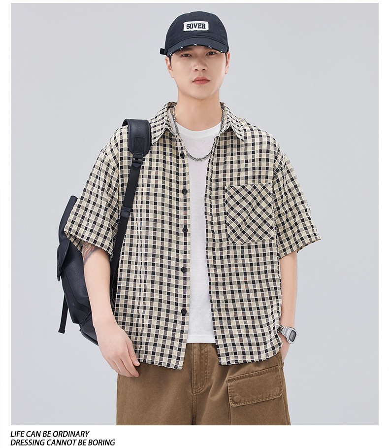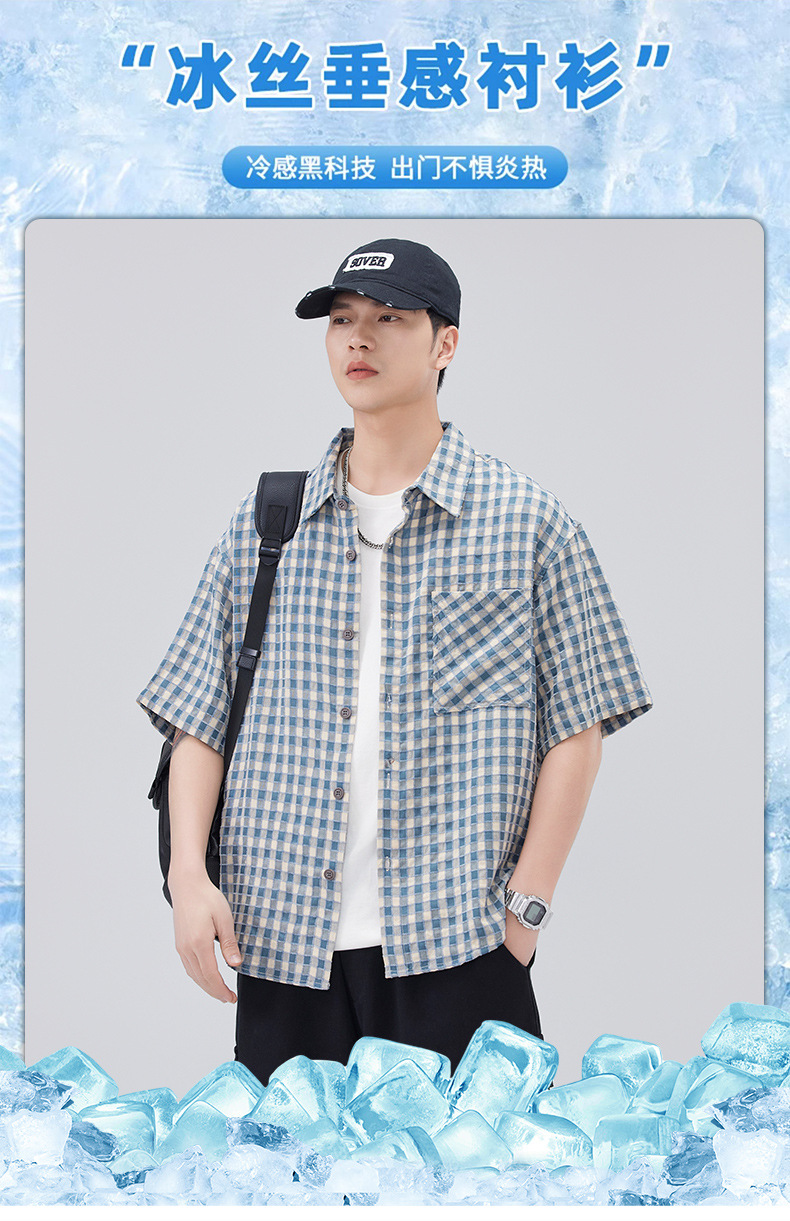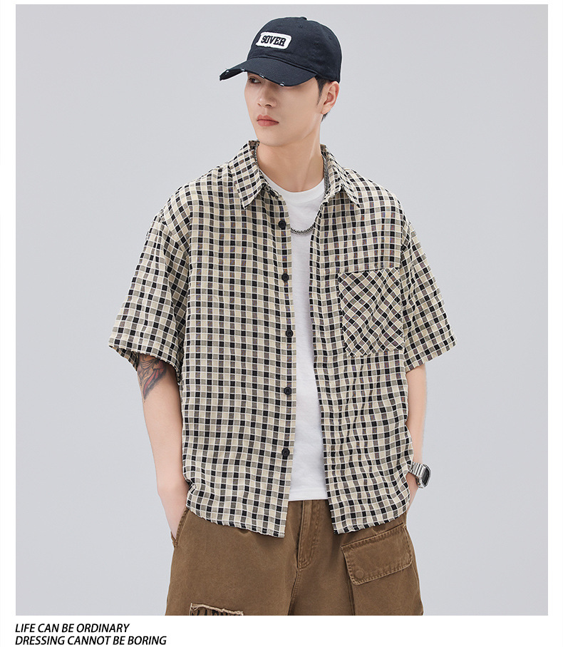 慕沅男装 2025春夏新款格子短袖翻领衬衫男潮流ins外穿宽松上衣服