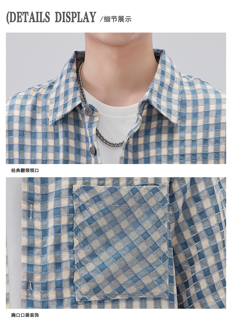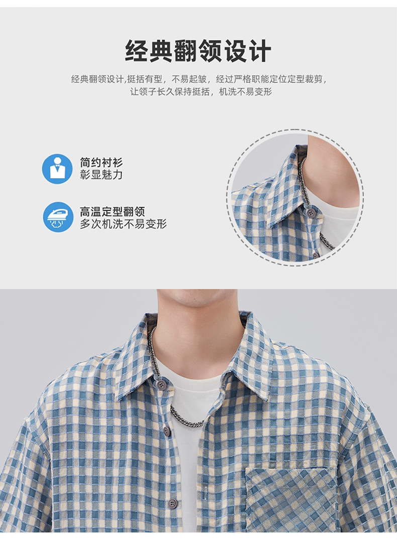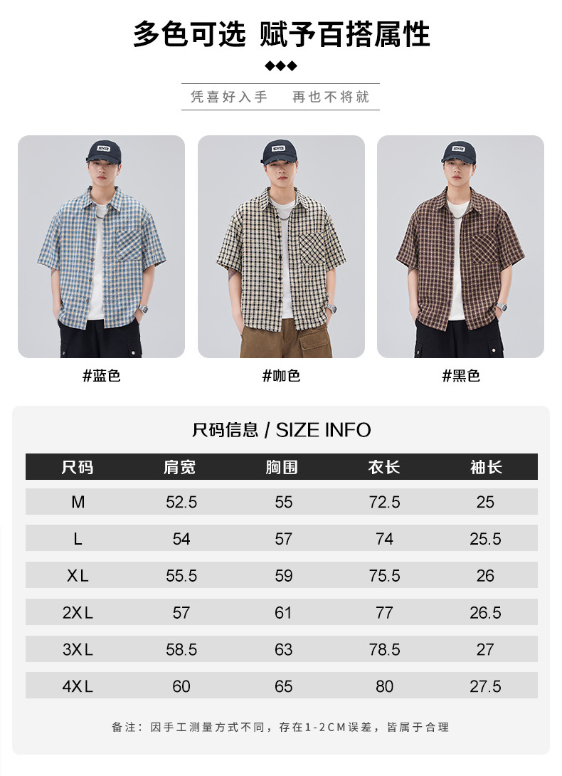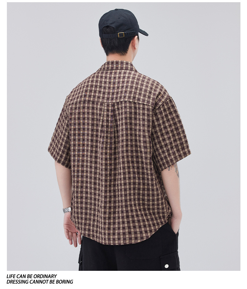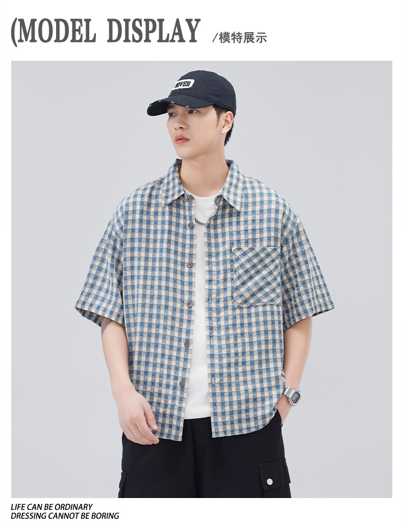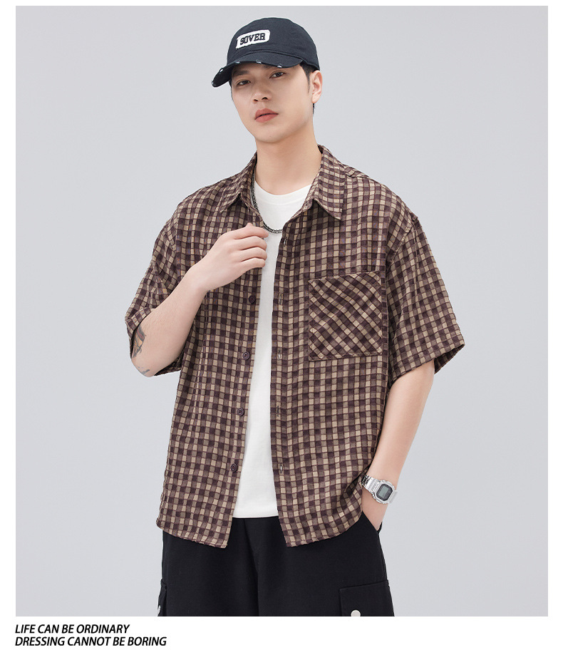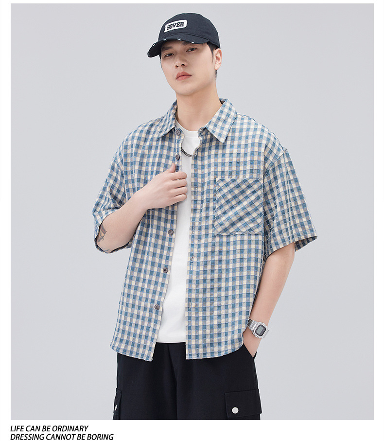慕沅男装 2025春夏新款格子短袖翻领衬衫男潮流ins外穿宽松上衣服