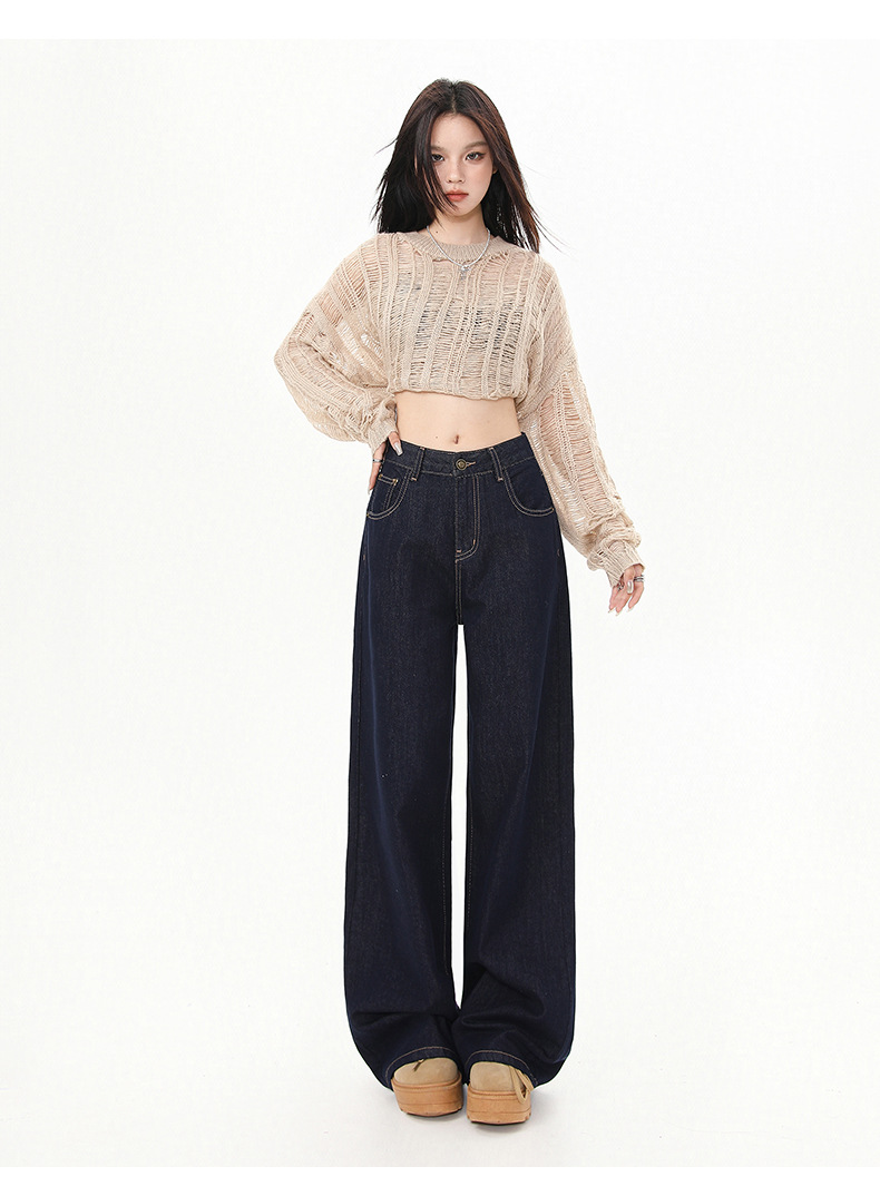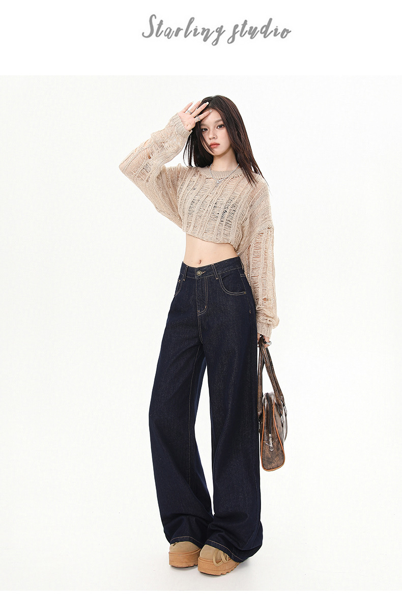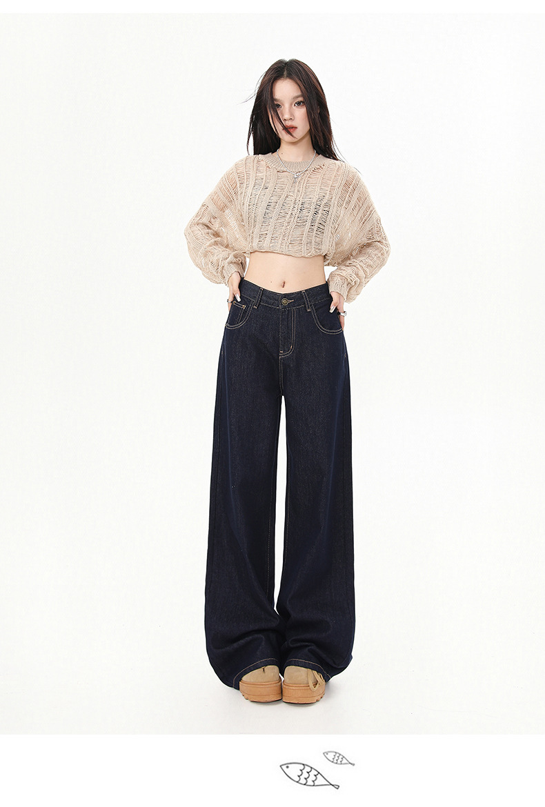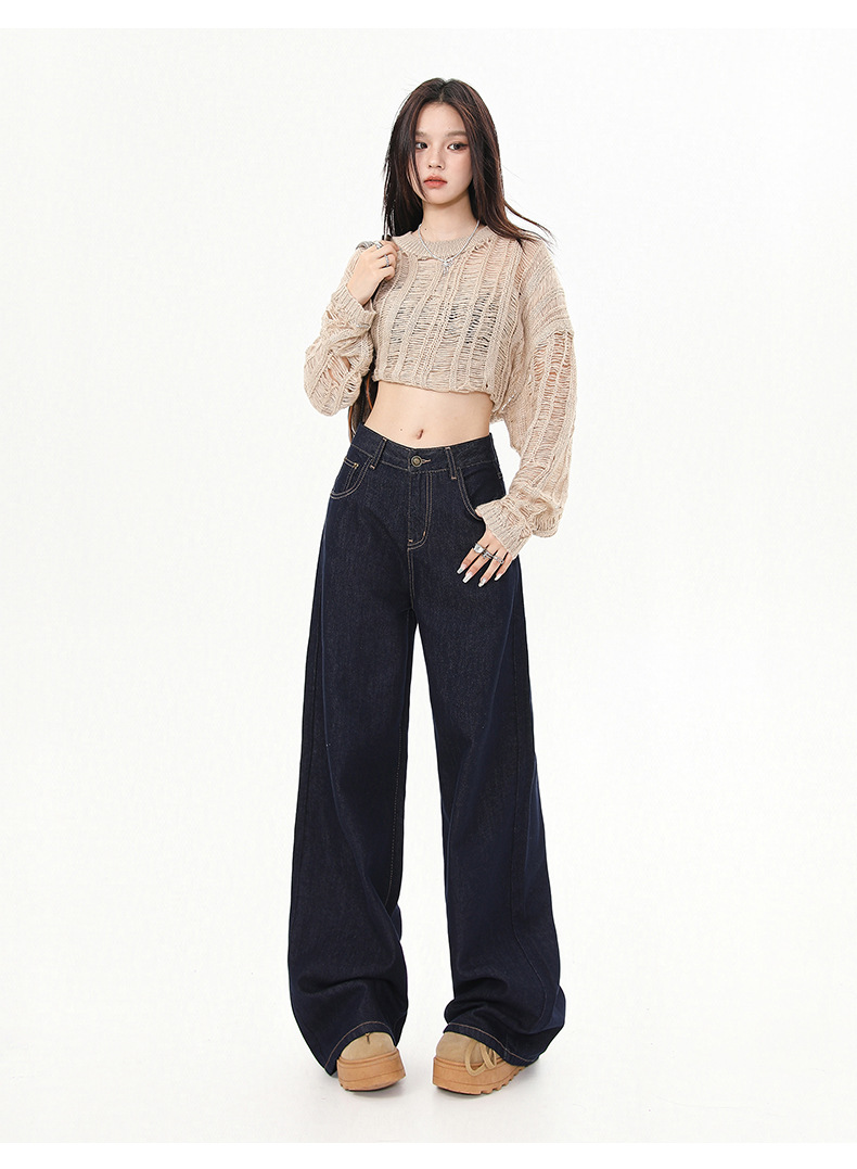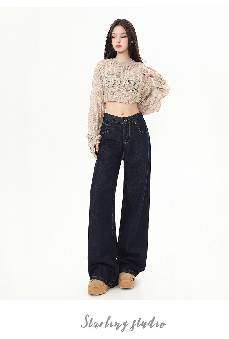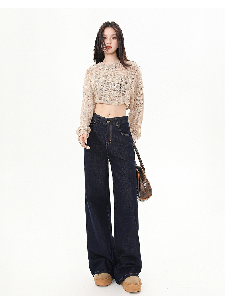 防掉色牛仔裤女丹宁色垂感2024秋新款宽松阔腿裤原色百搭长裤