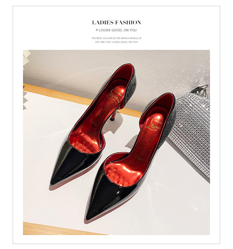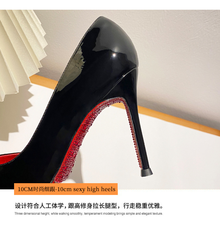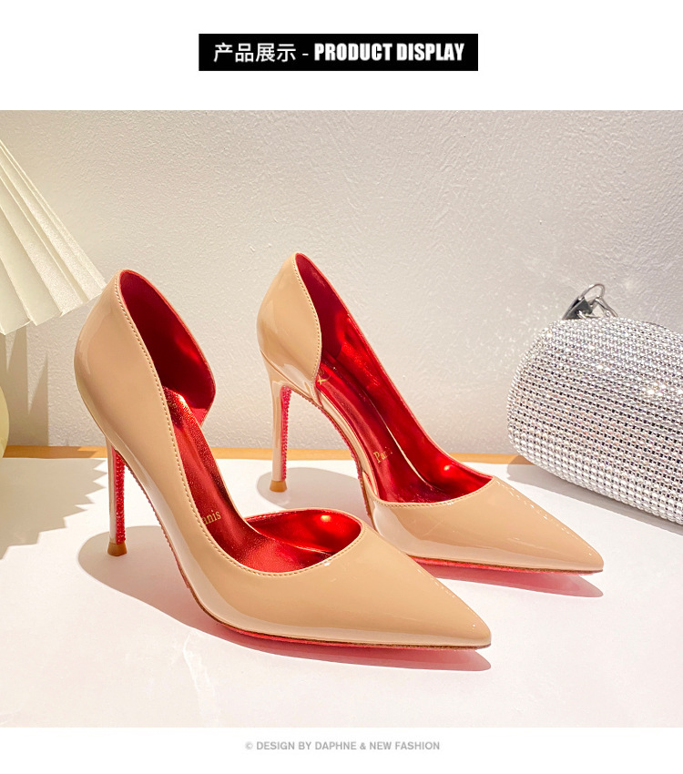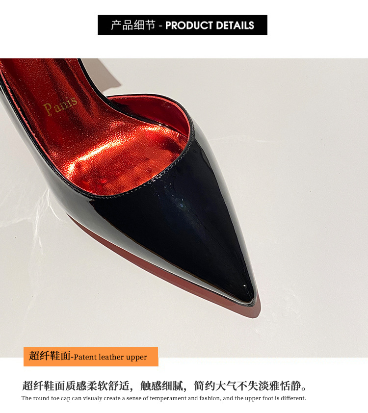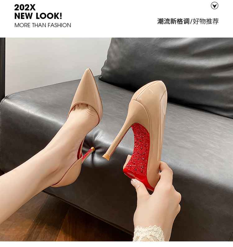 2025新款水钻尖头侧空性感裸色高跟鞋女绝美细跟气质黑色漆皮单鞋