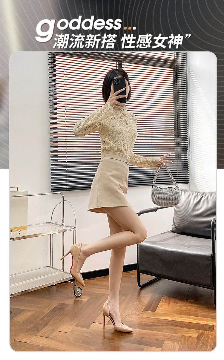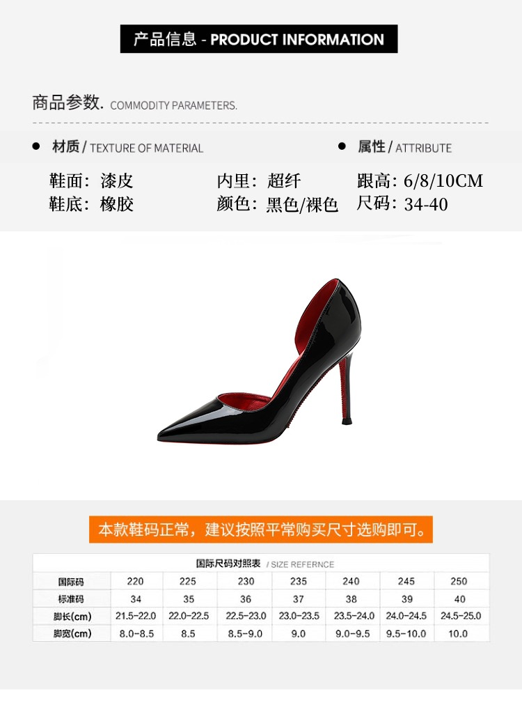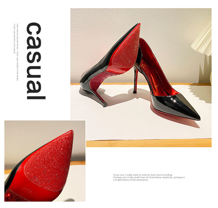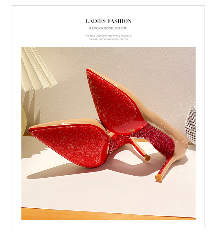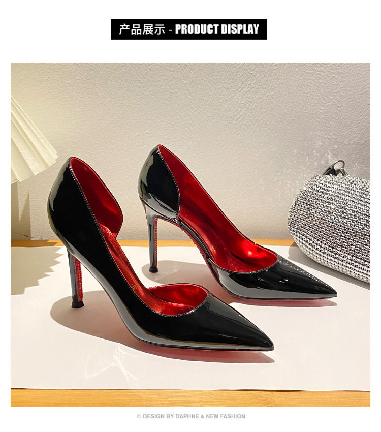 2025新款水钻尖头侧空性感裸色高跟鞋女绝美细跟气质黑色漆皮单鞋