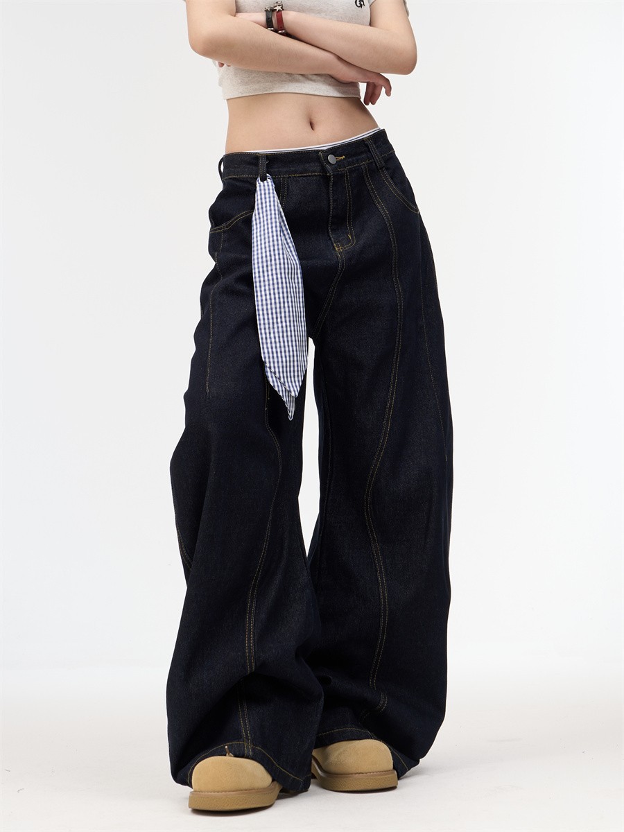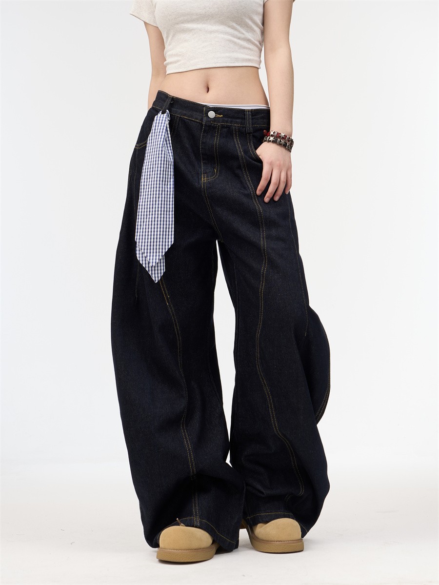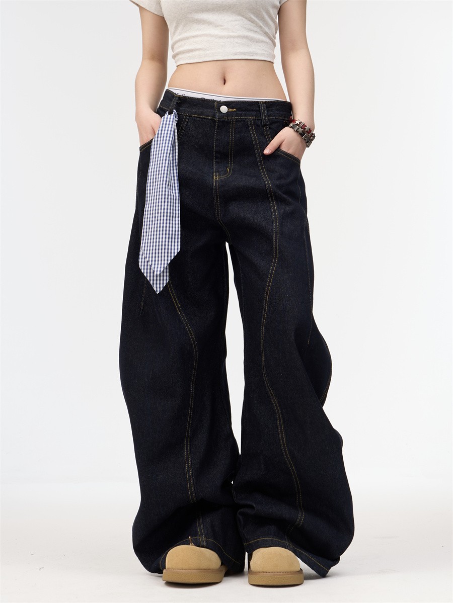 美式复古原色水洗弯刀牛仔裤男女新款宽松阔腿设计感小众休闲长裤