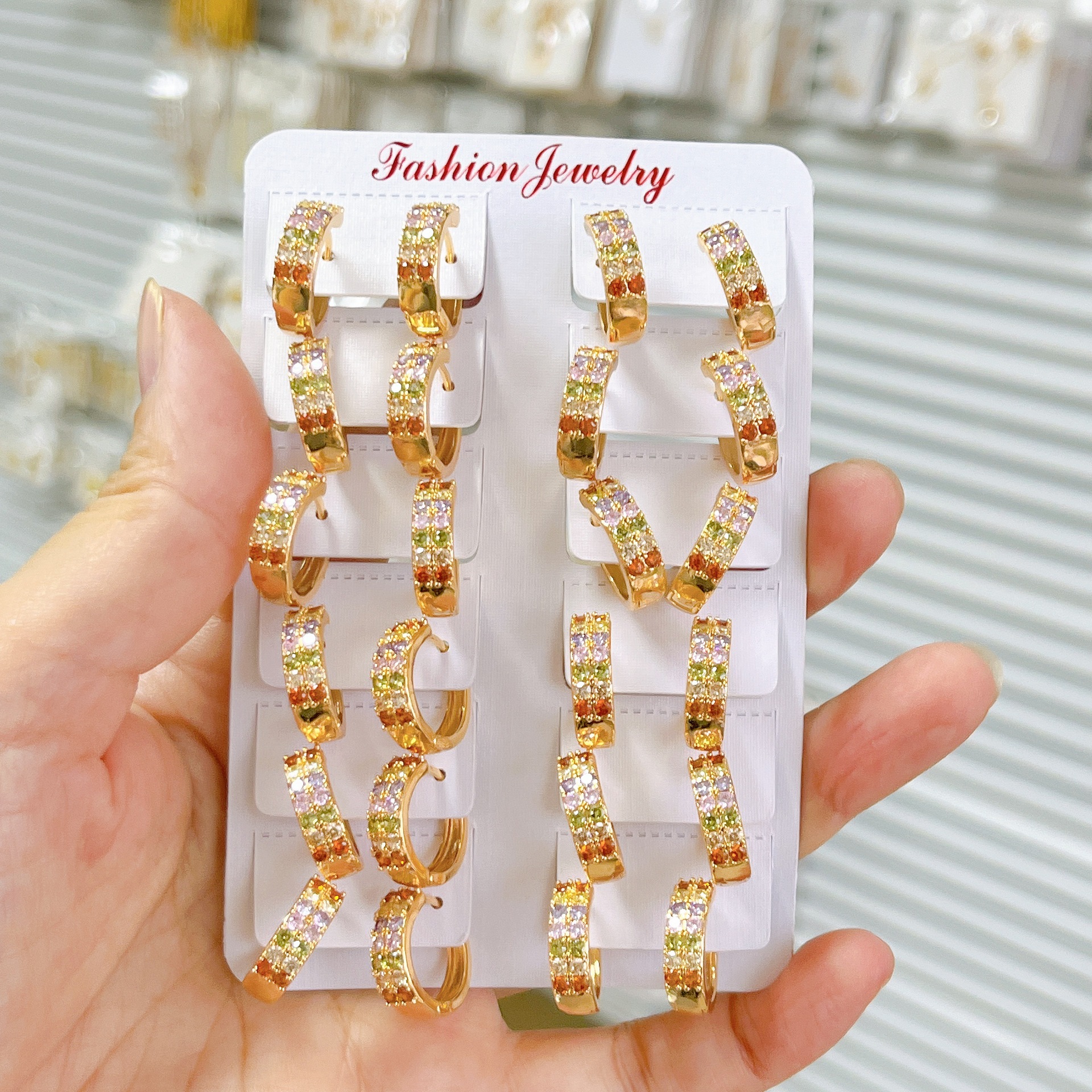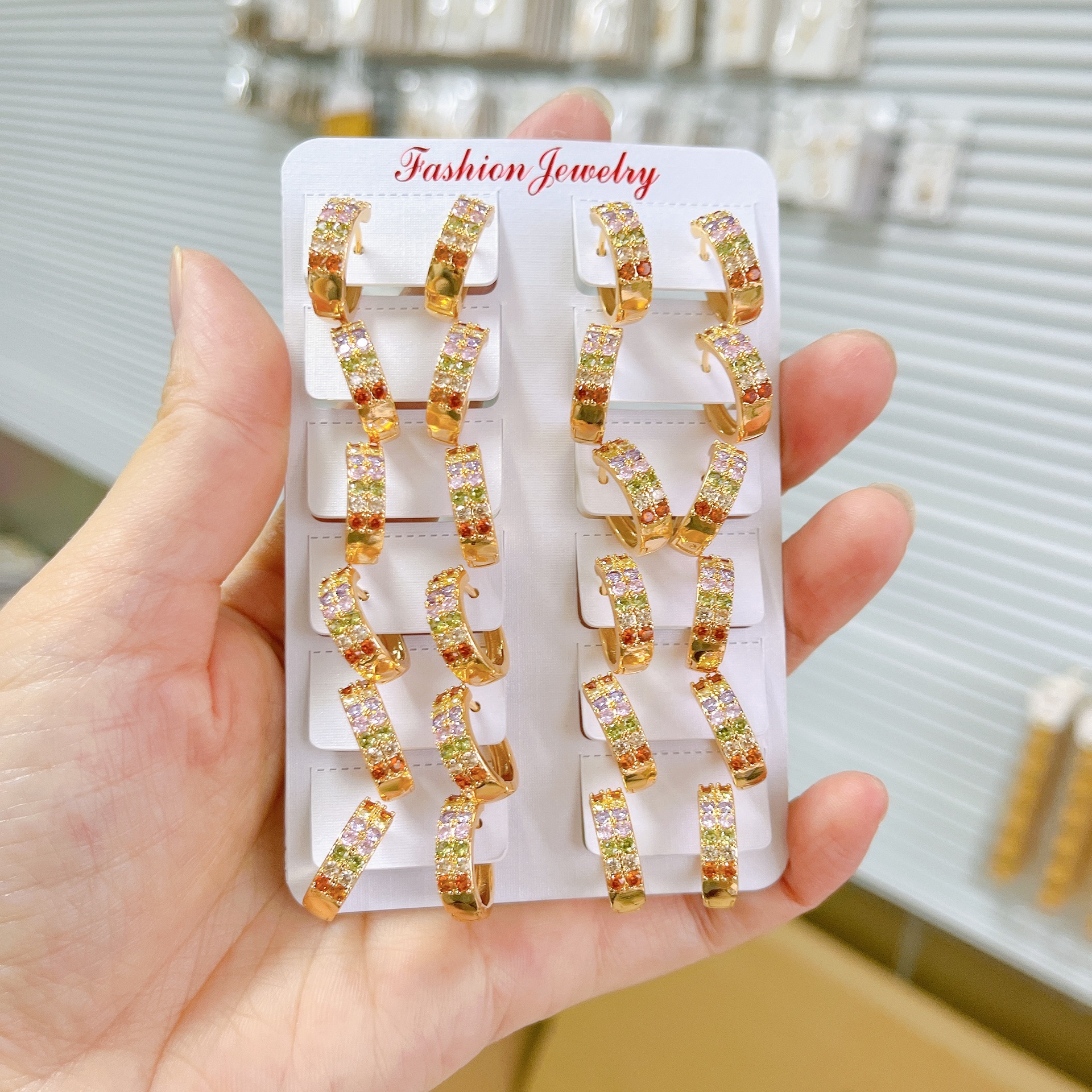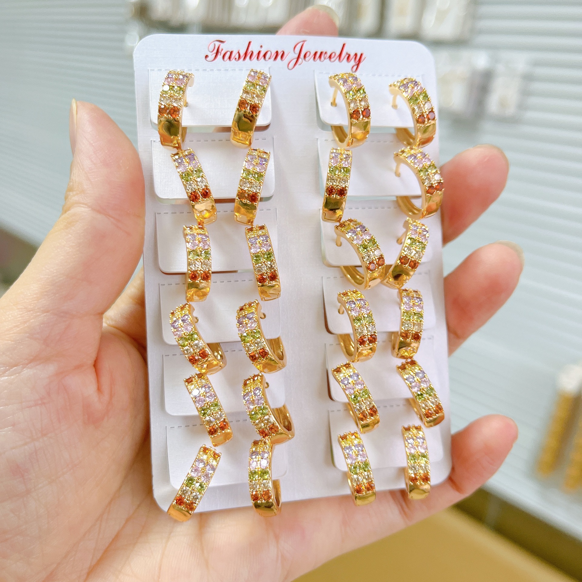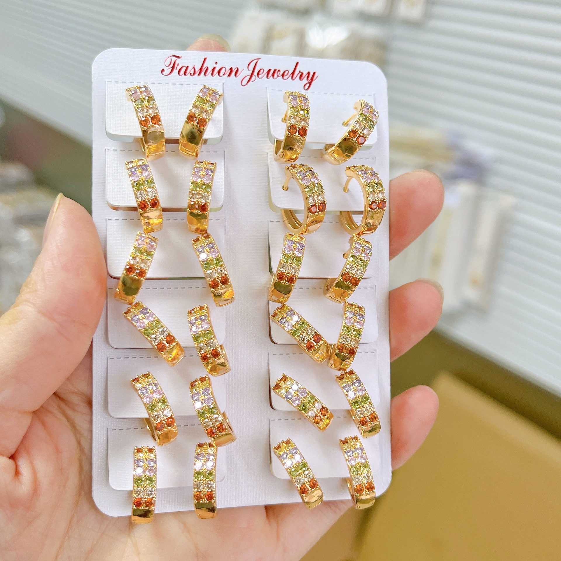 跨境耳环彩色锆石双排耳扣欧美铜微镶锆石时尚多色18K金耳饰气质