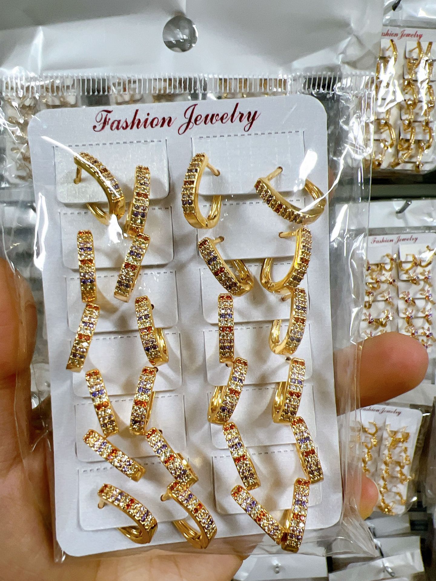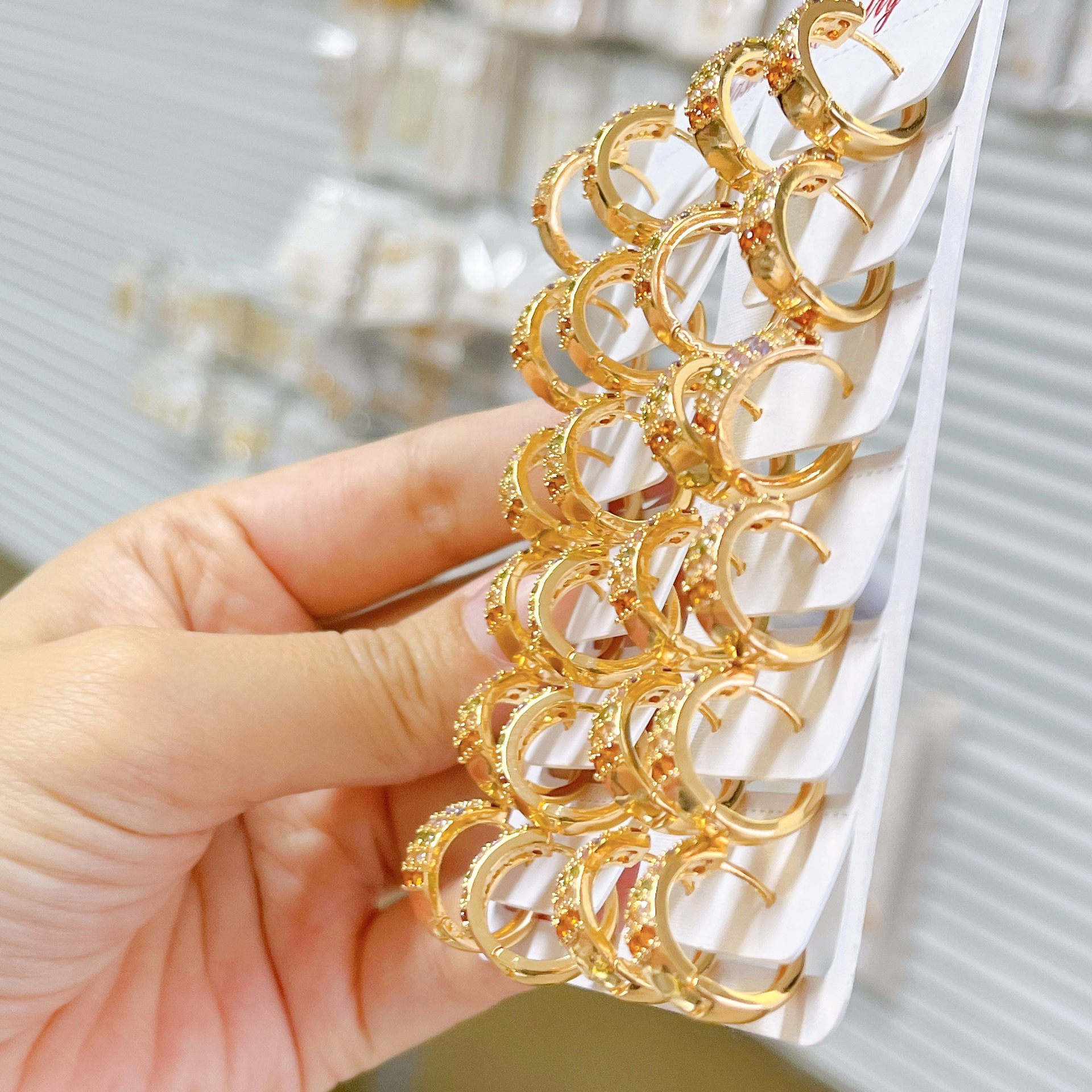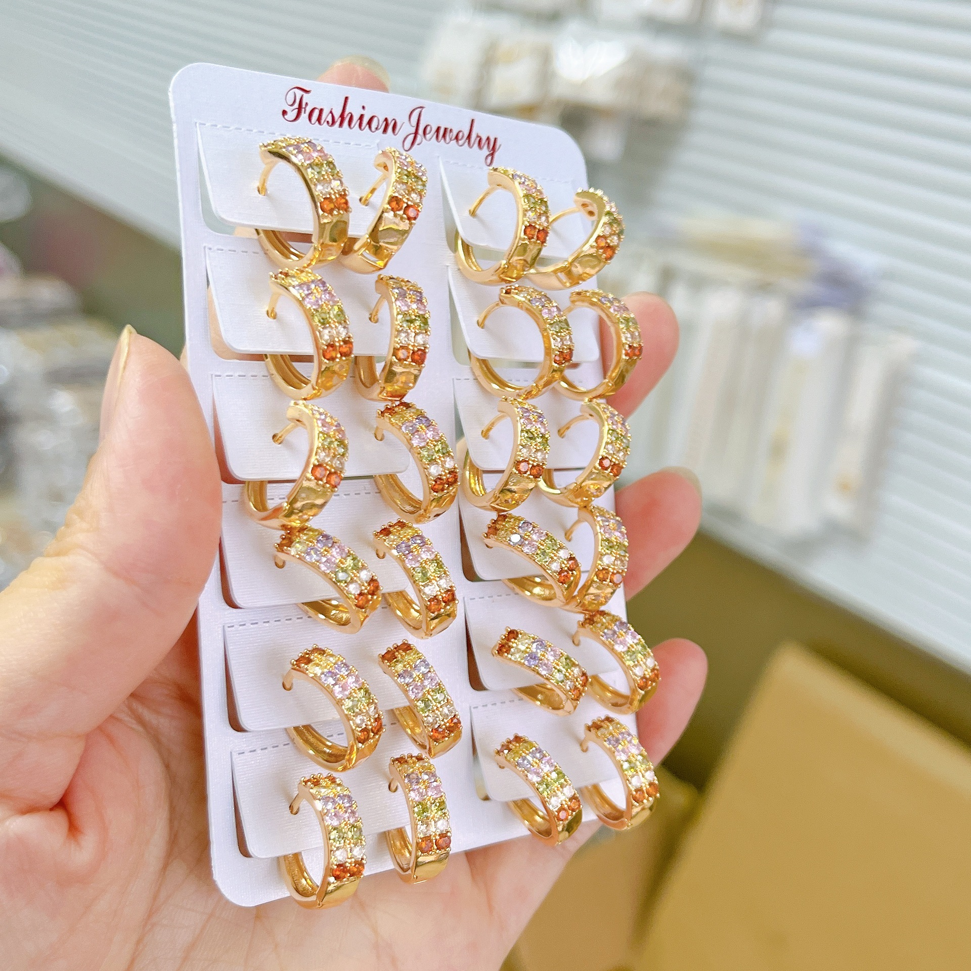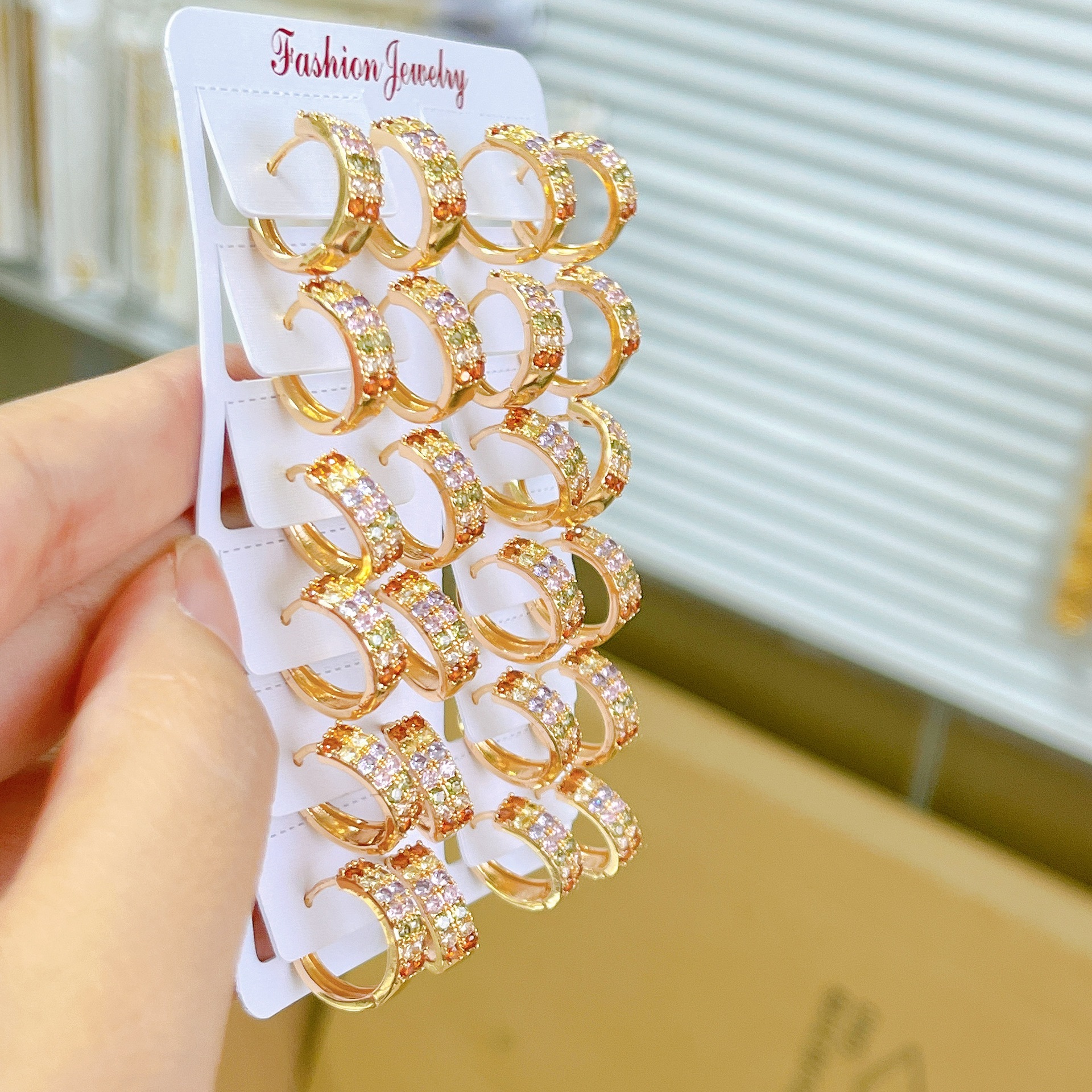 跨境耳环彩色锆石双排耳扣欧美铜微镶锆石时尚多色18K金耳饰气质