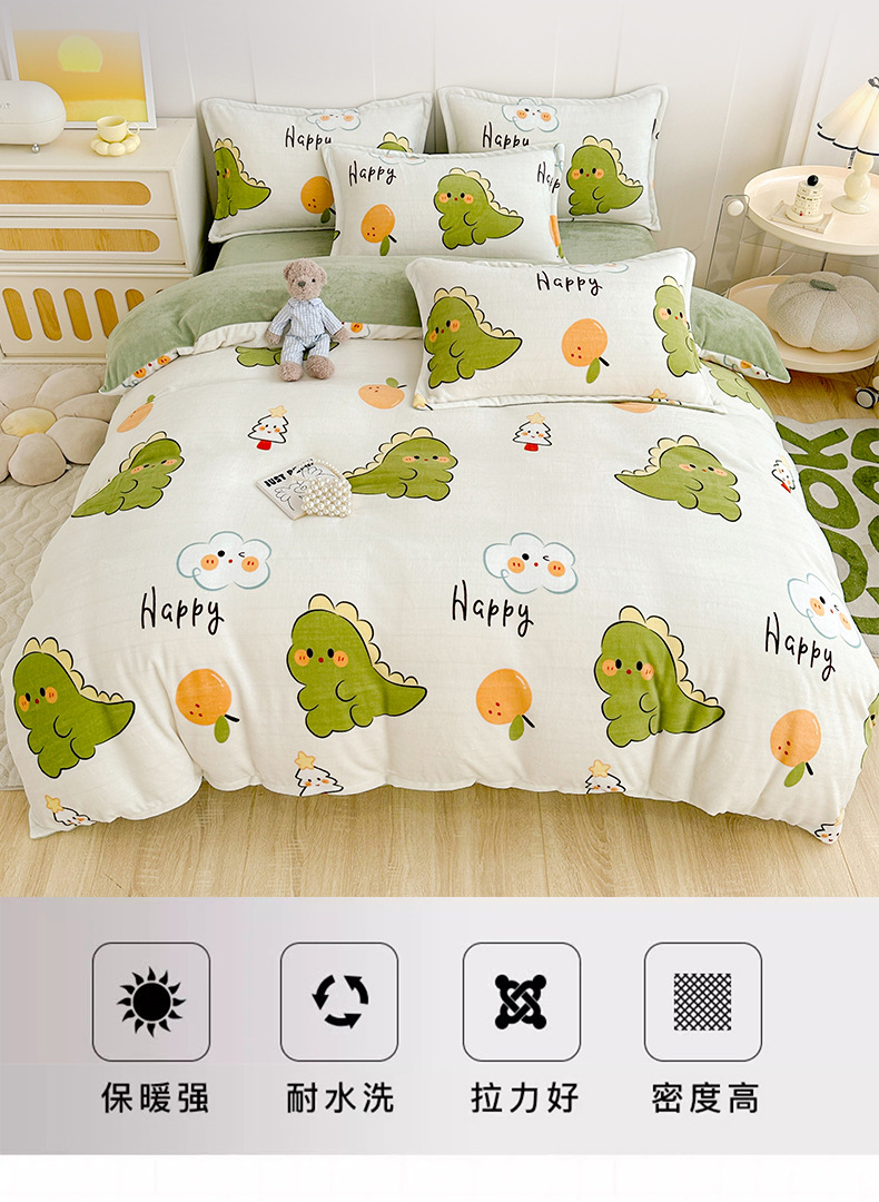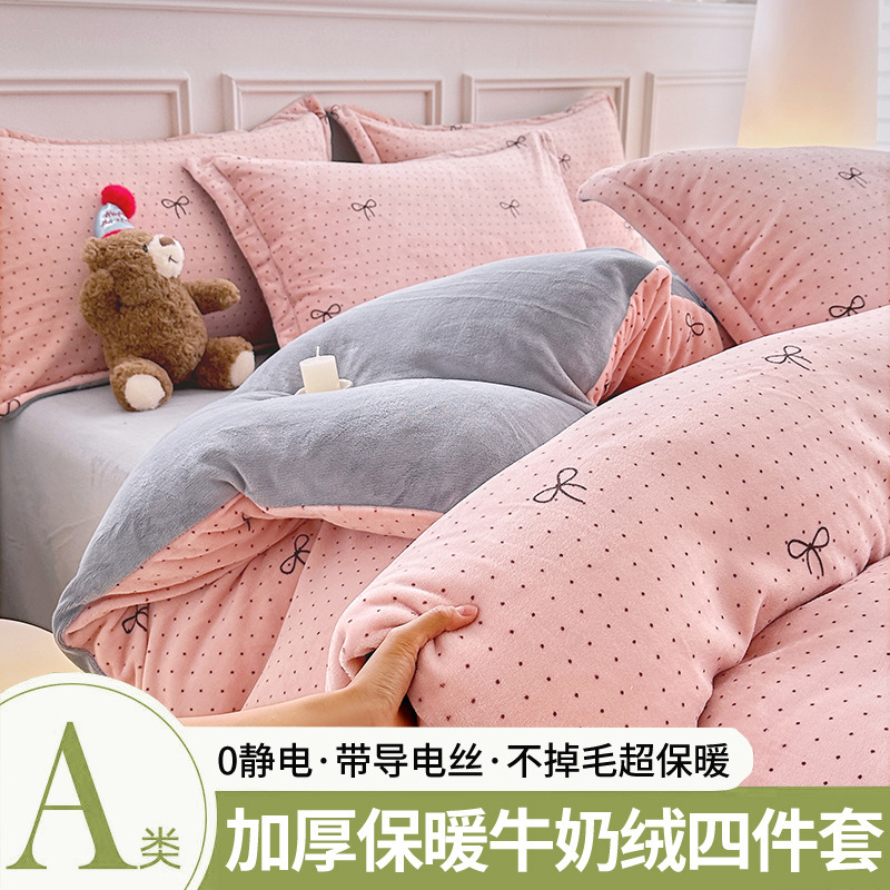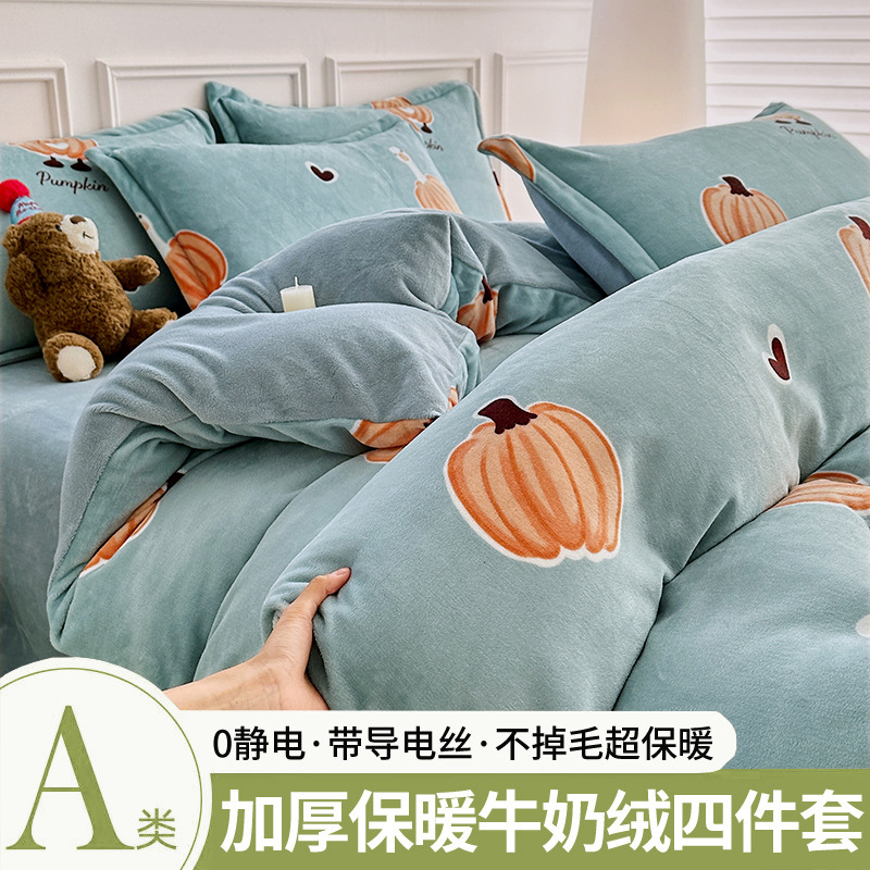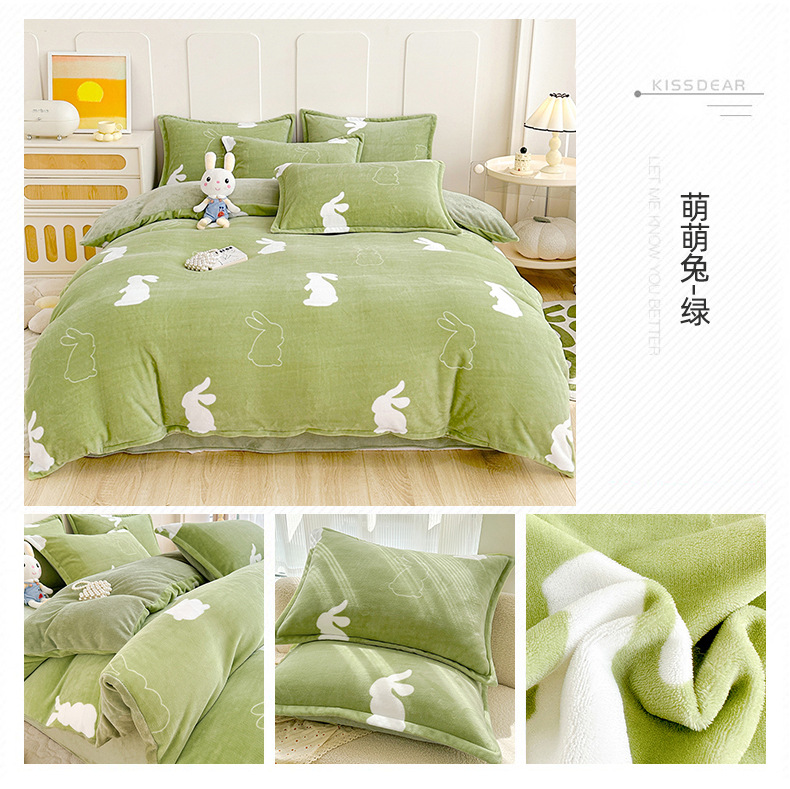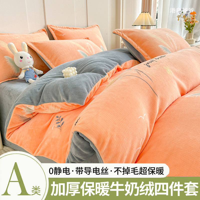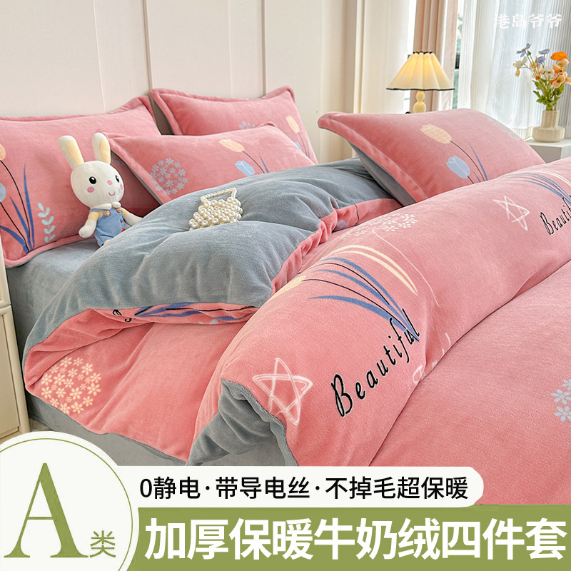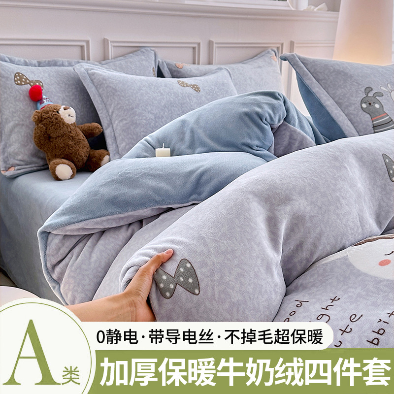 A类冬季牛奶绒四件套双面珊瑚绒床笠加厚被罩加绒被套床单三件套