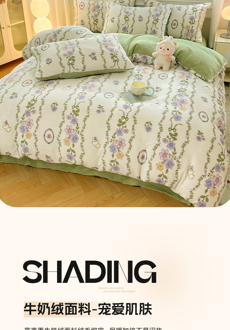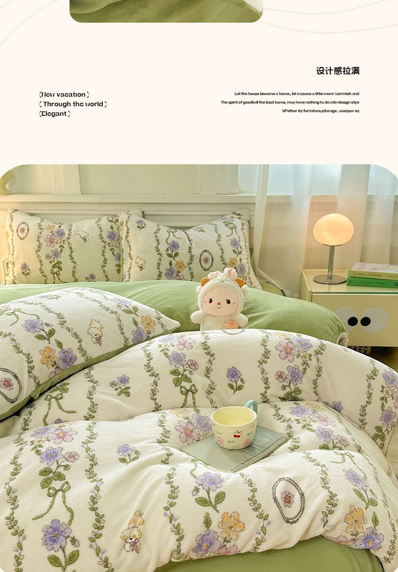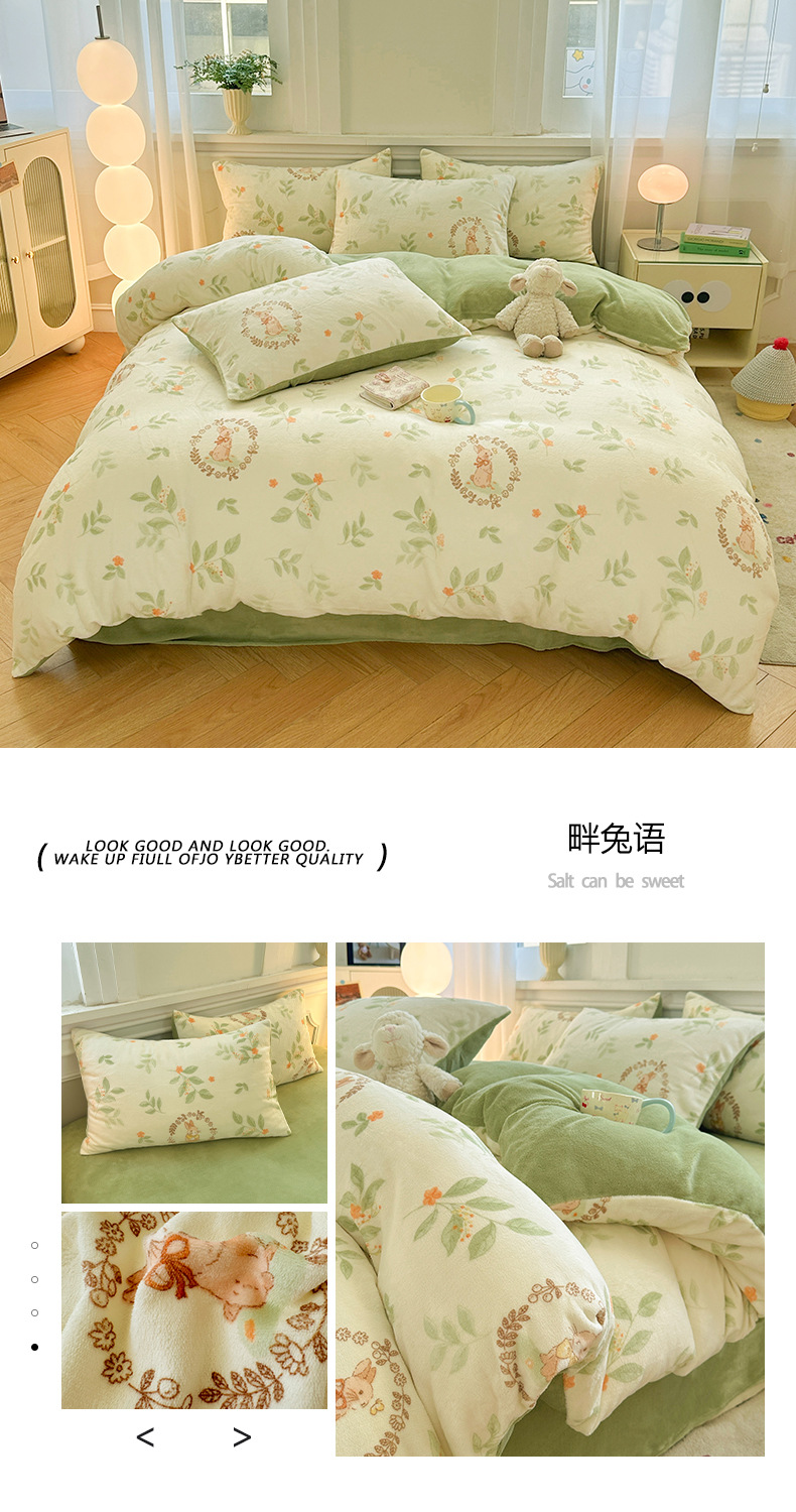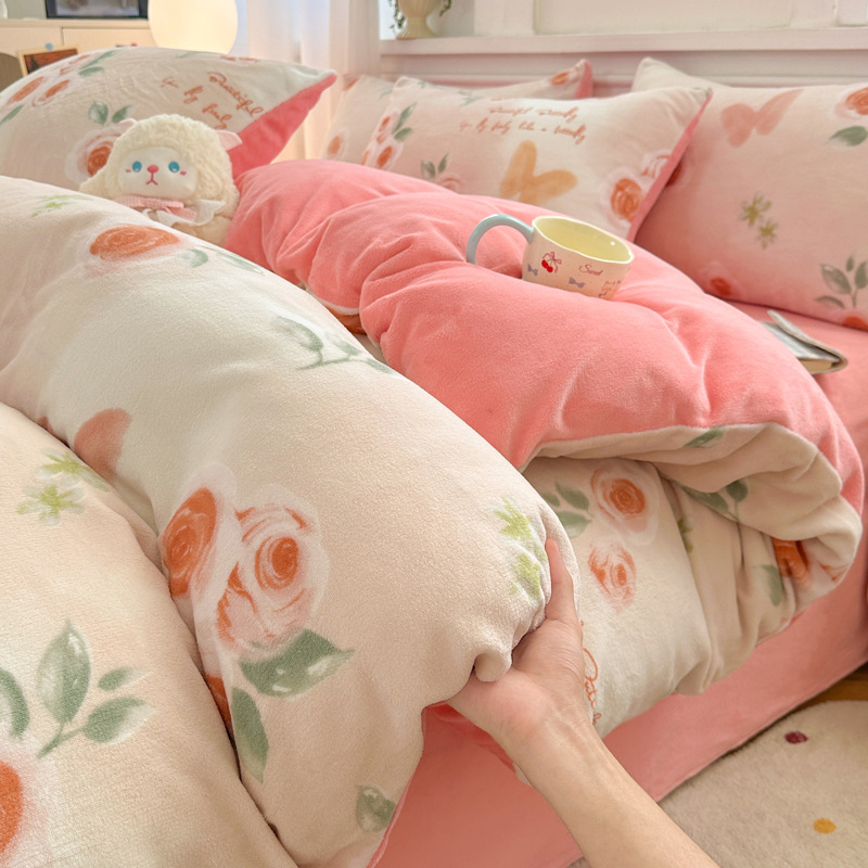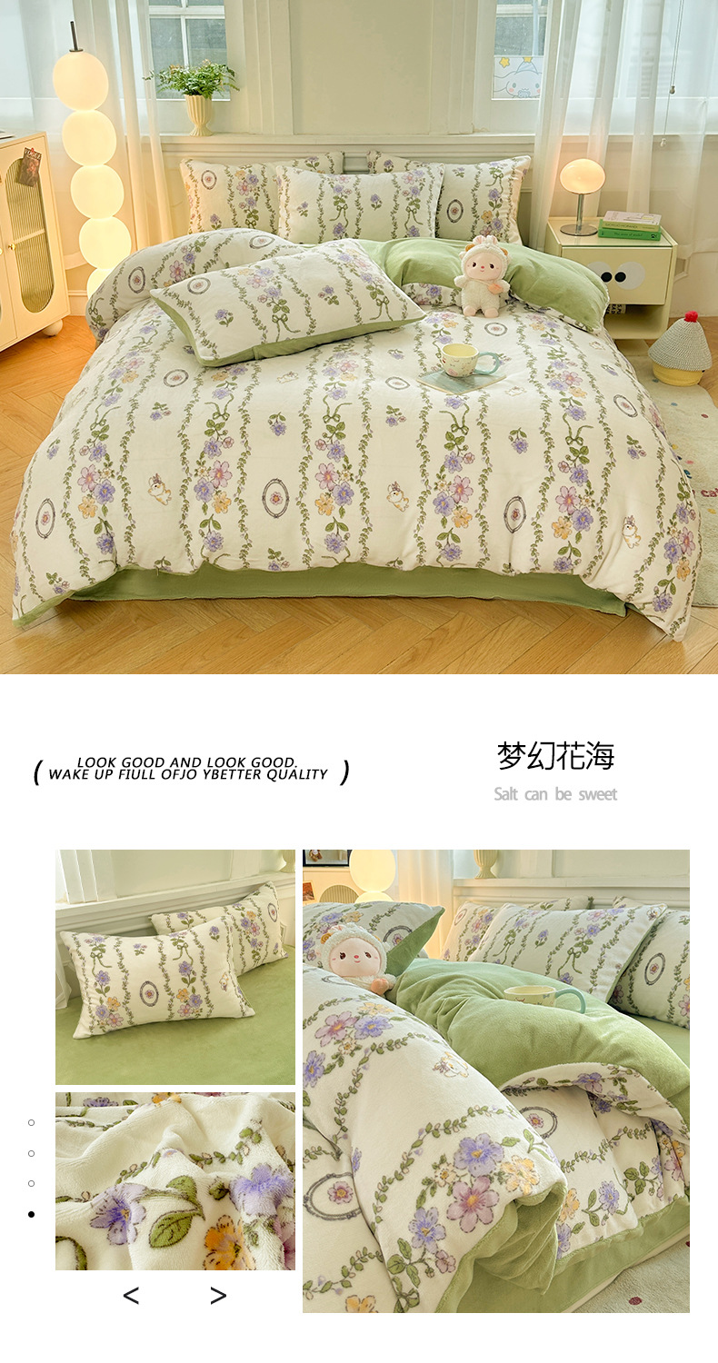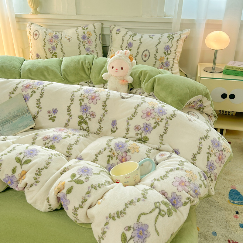 小清新加厚牛奶绒四件套冬季珊瑚法兰双面加绒被套床单床笠三件套