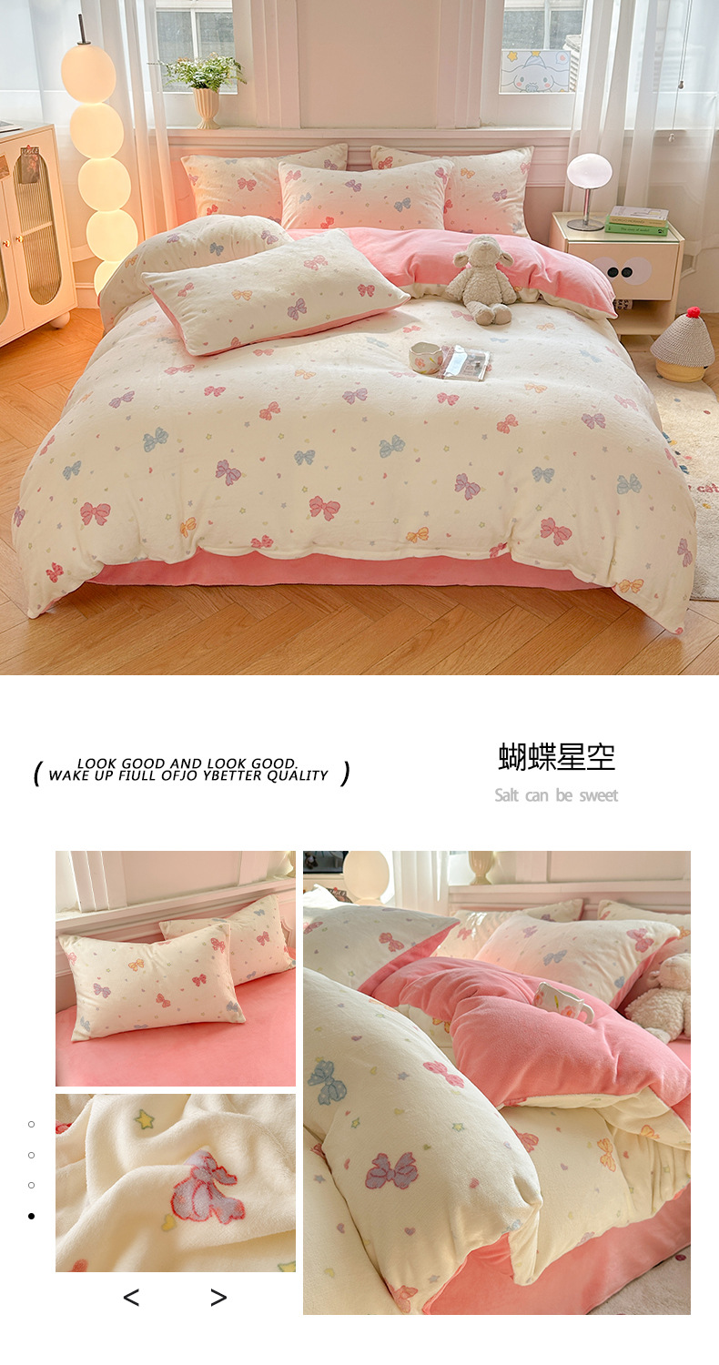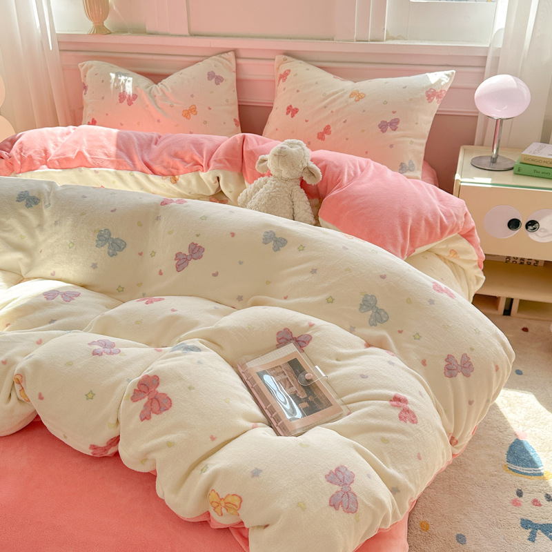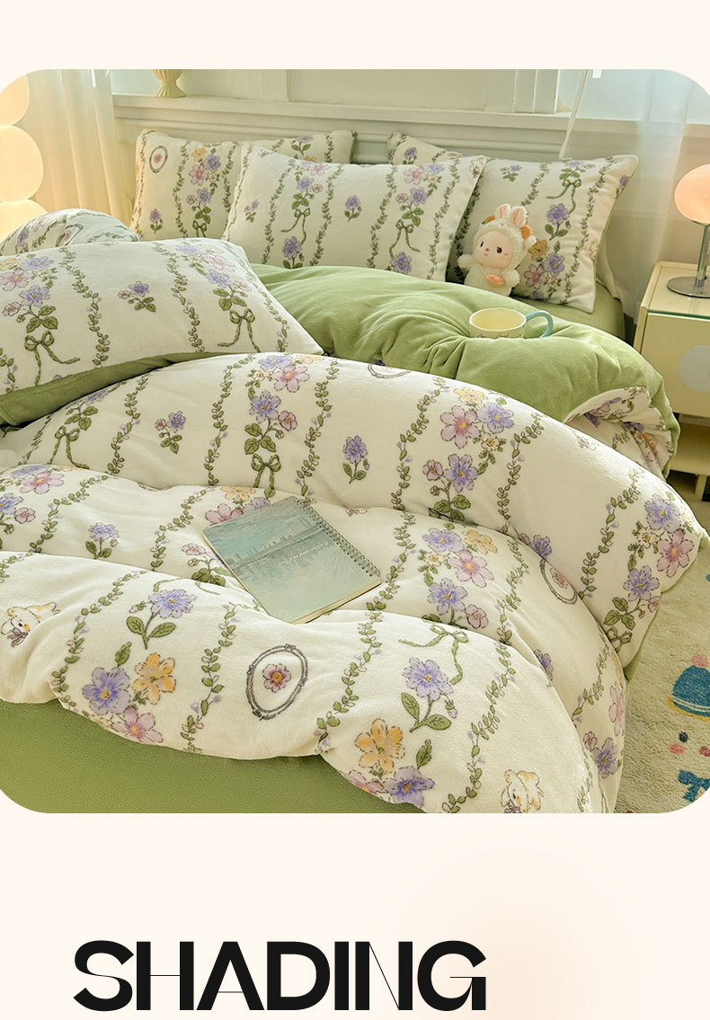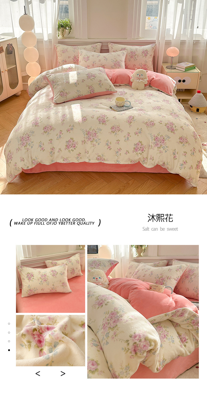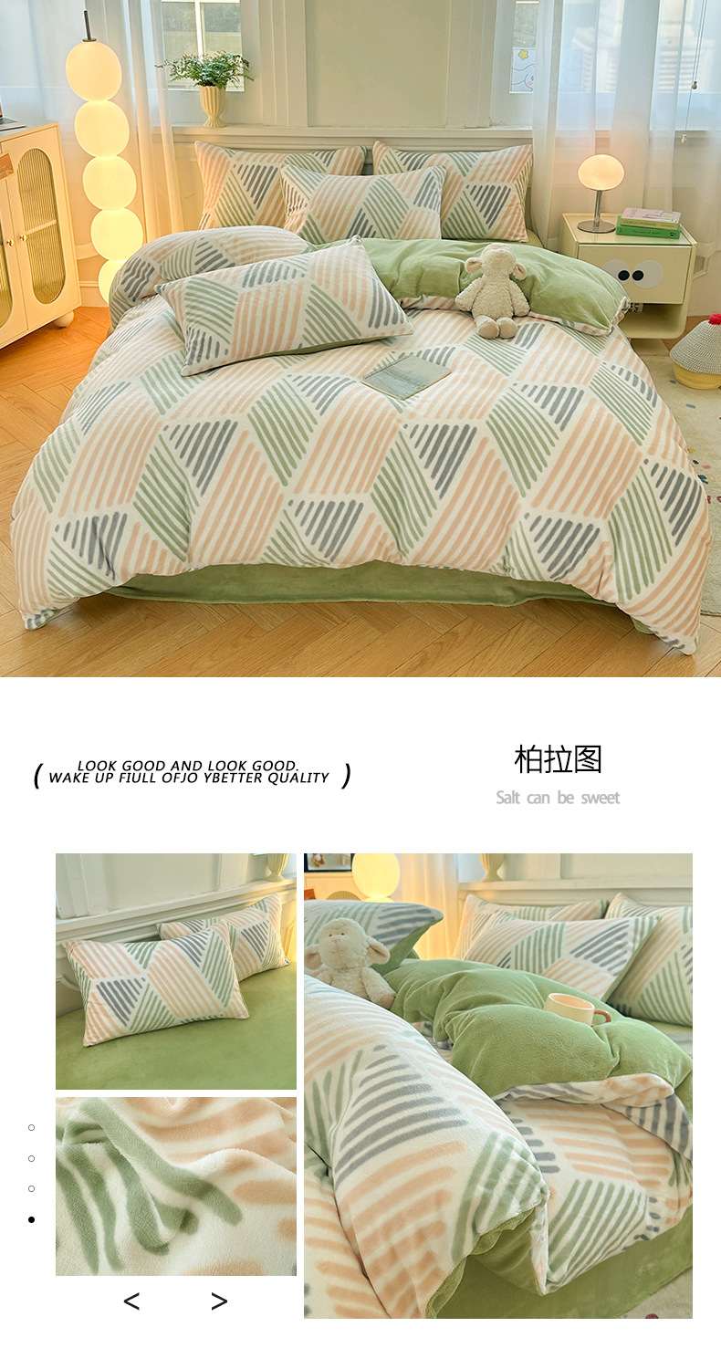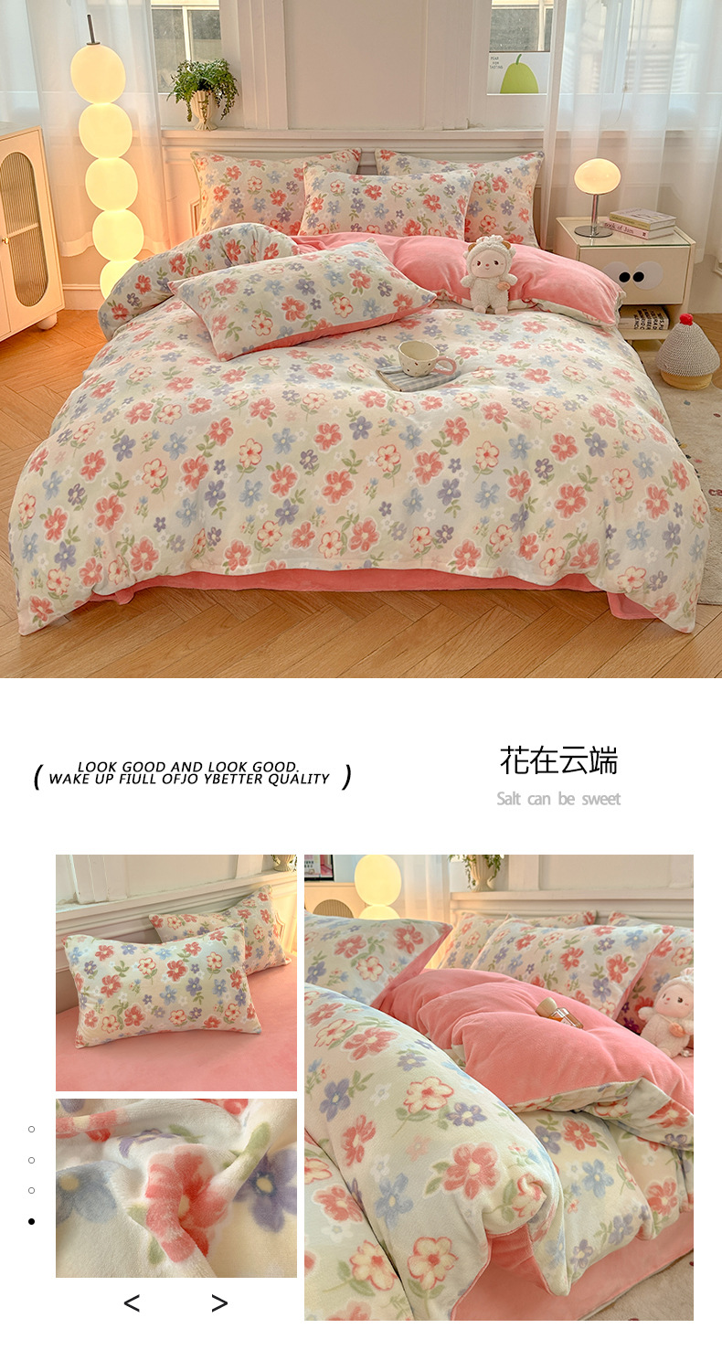 小清新加厚牛奶绒四件套冬季珊瑚法兰双面加绒被套床单床笠三件套