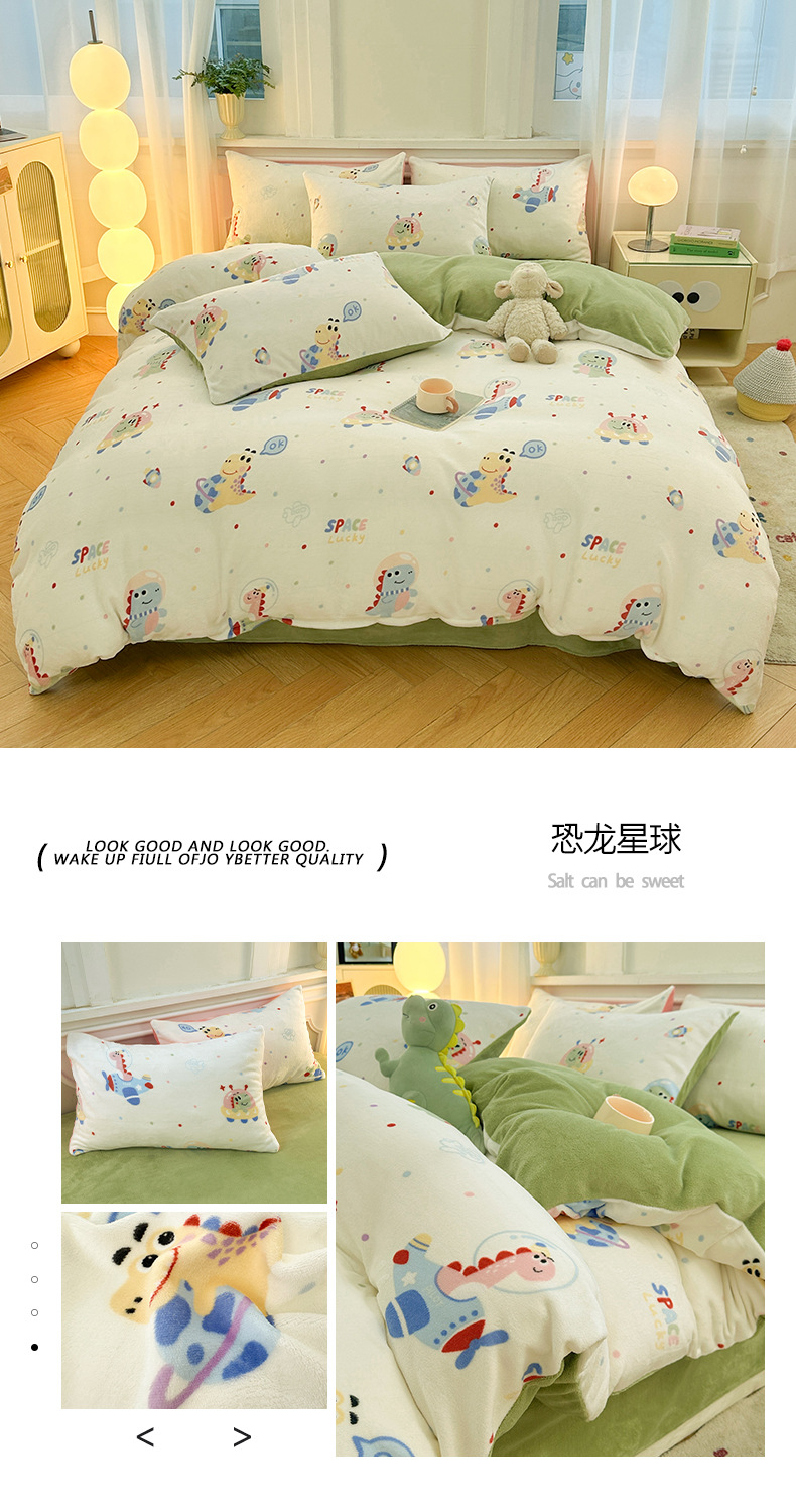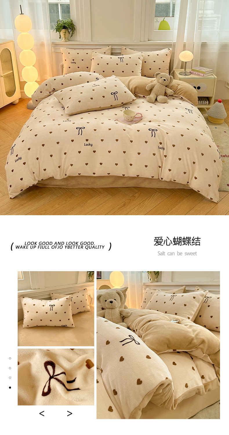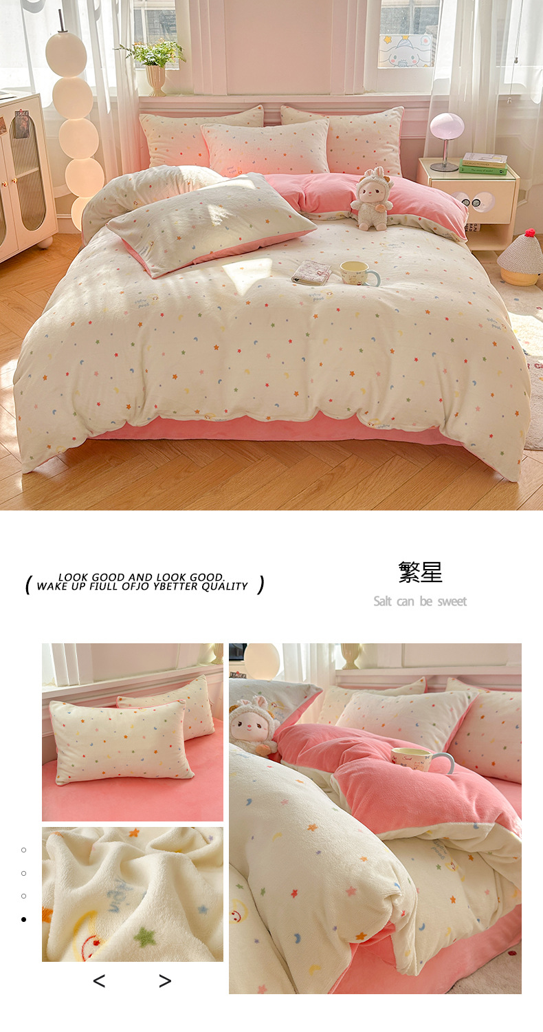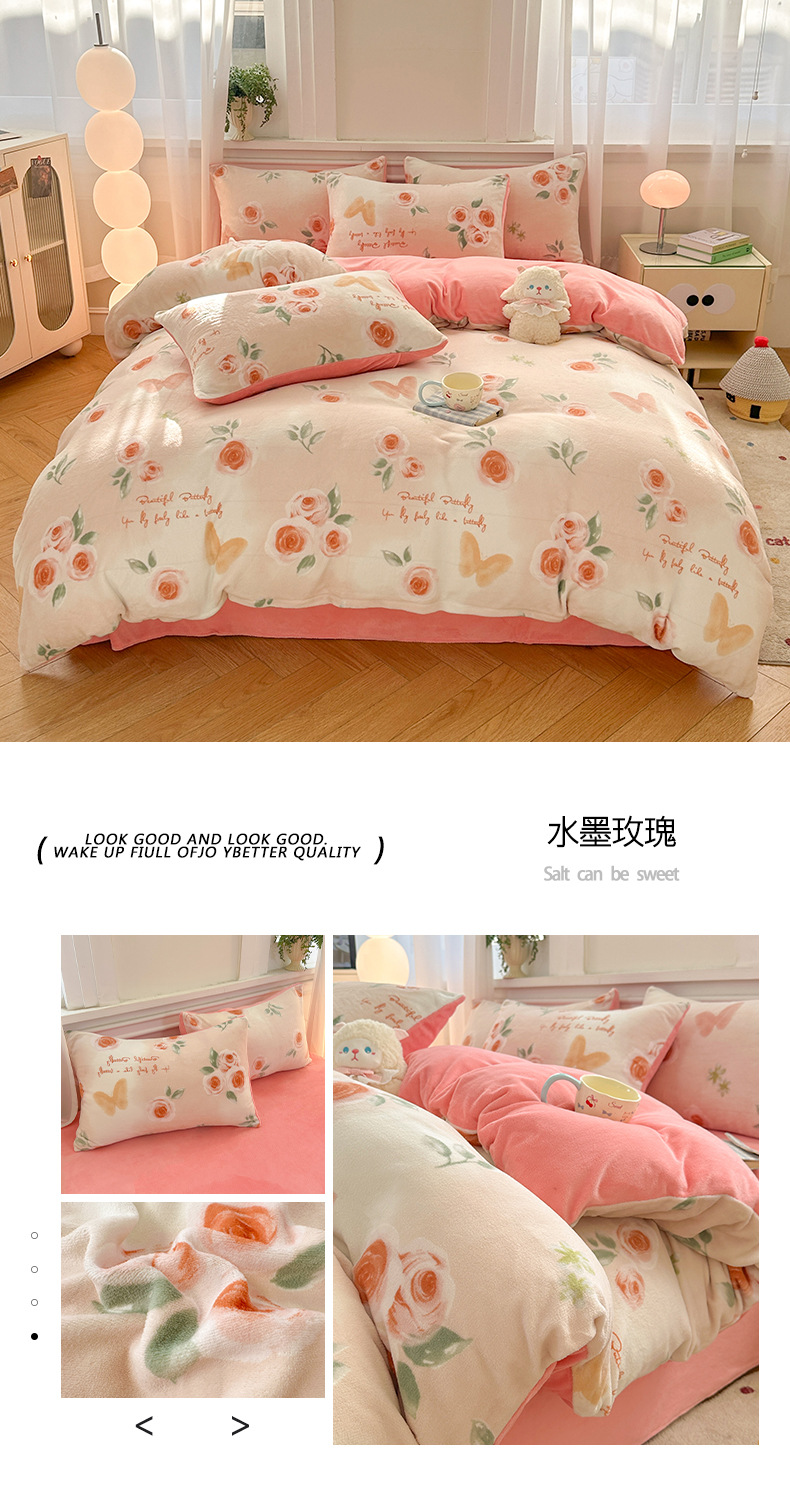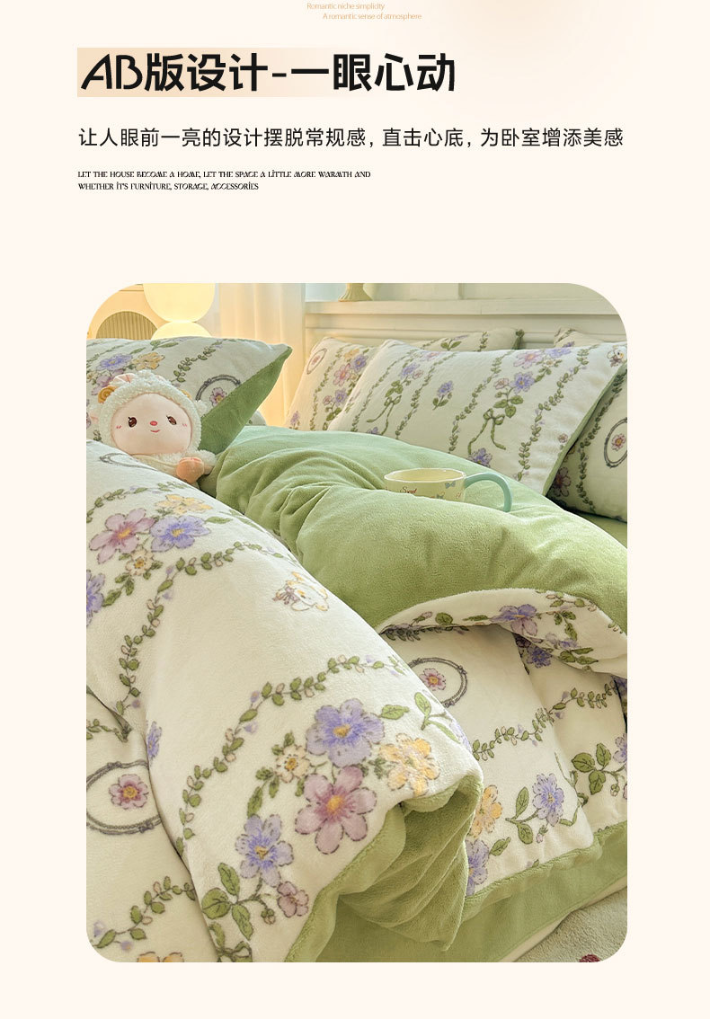 小清新加厚牛奶绒四件套冬季珊瑚法兰双面加绒被套床单床笠三件套