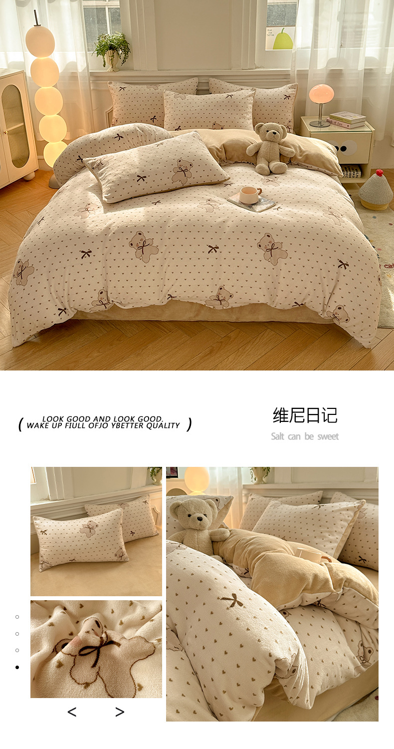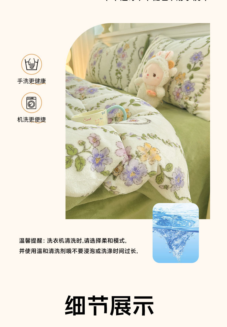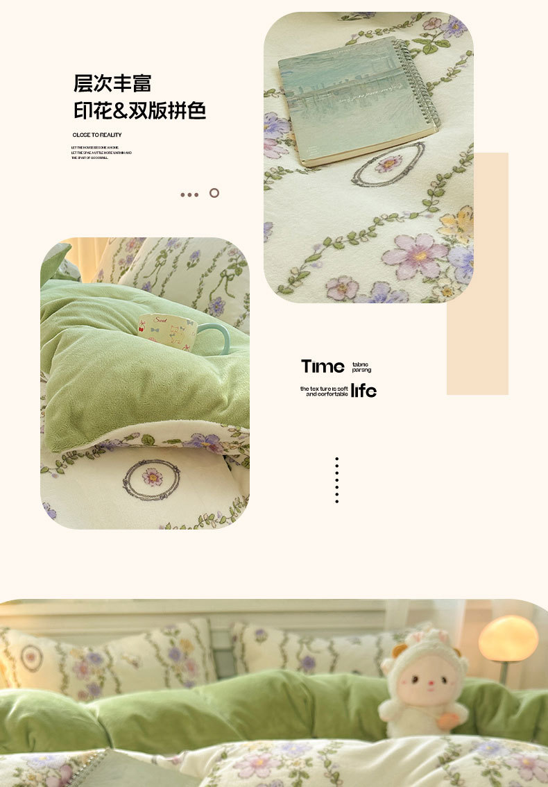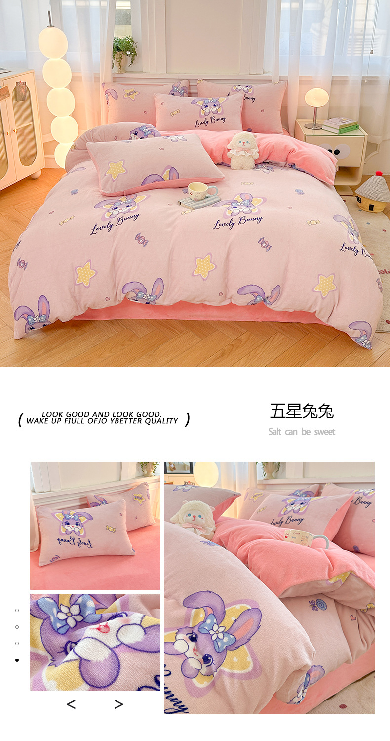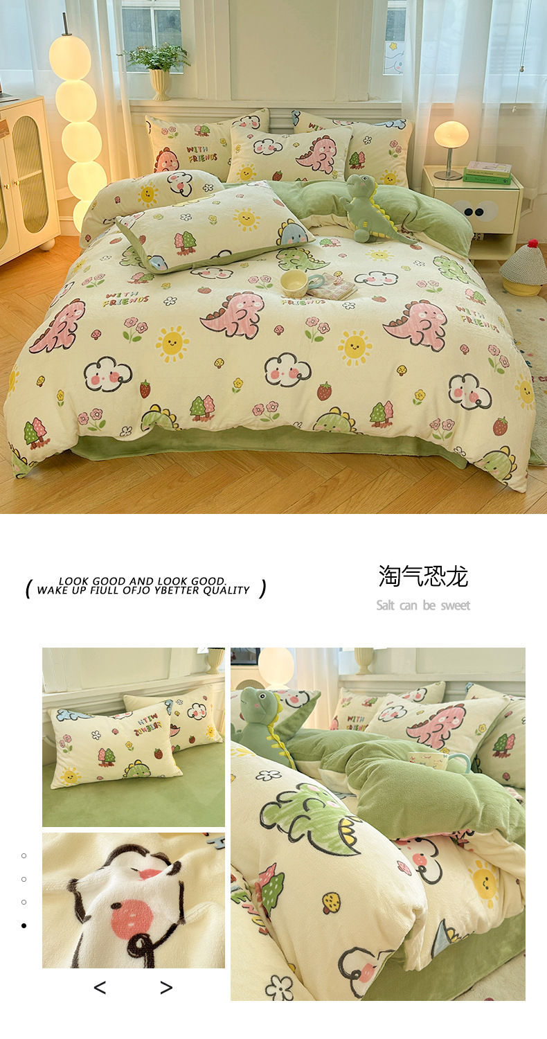 小清新加厚牛奶绒四件套冬季珊瑚法兰双面加绒被套床单床笠三件套