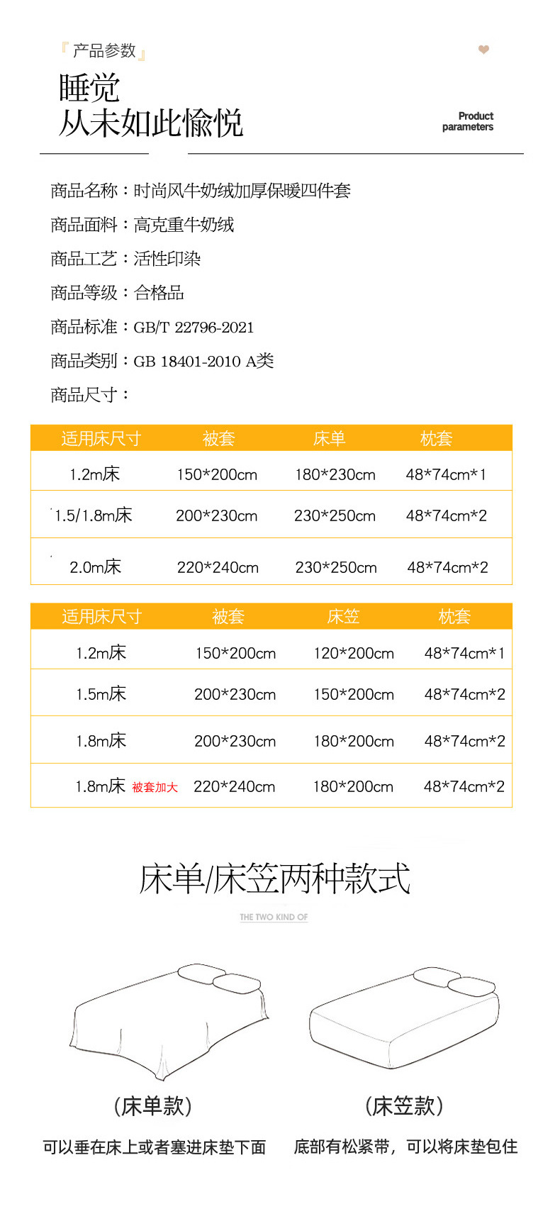 | 1.8m fitted sheet four-piece set (quilt cover 200 x230)(1.8m床笠款四件套(被套200x230)) | USD $25.09 | 100000 set available |