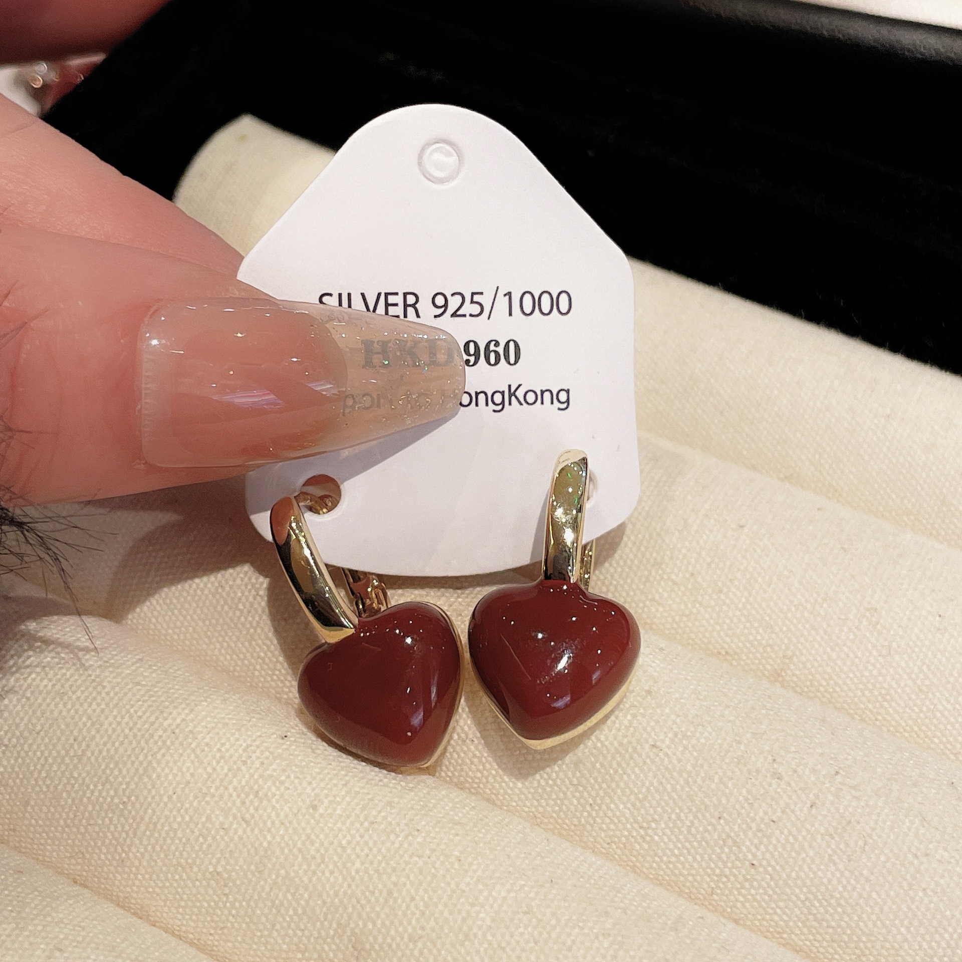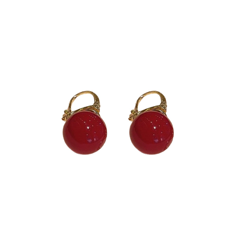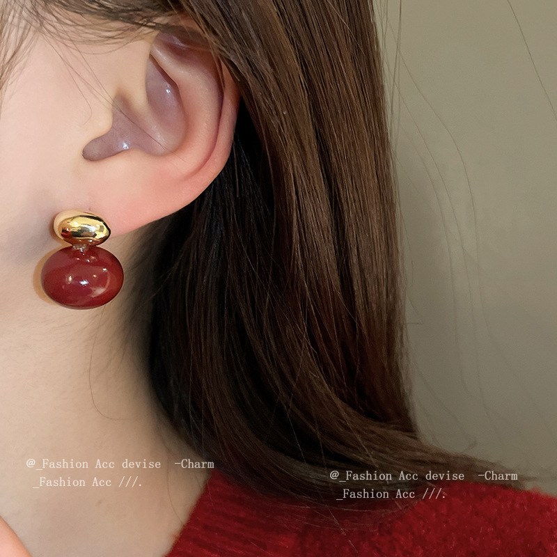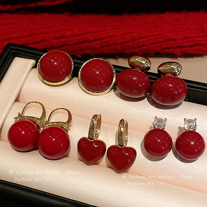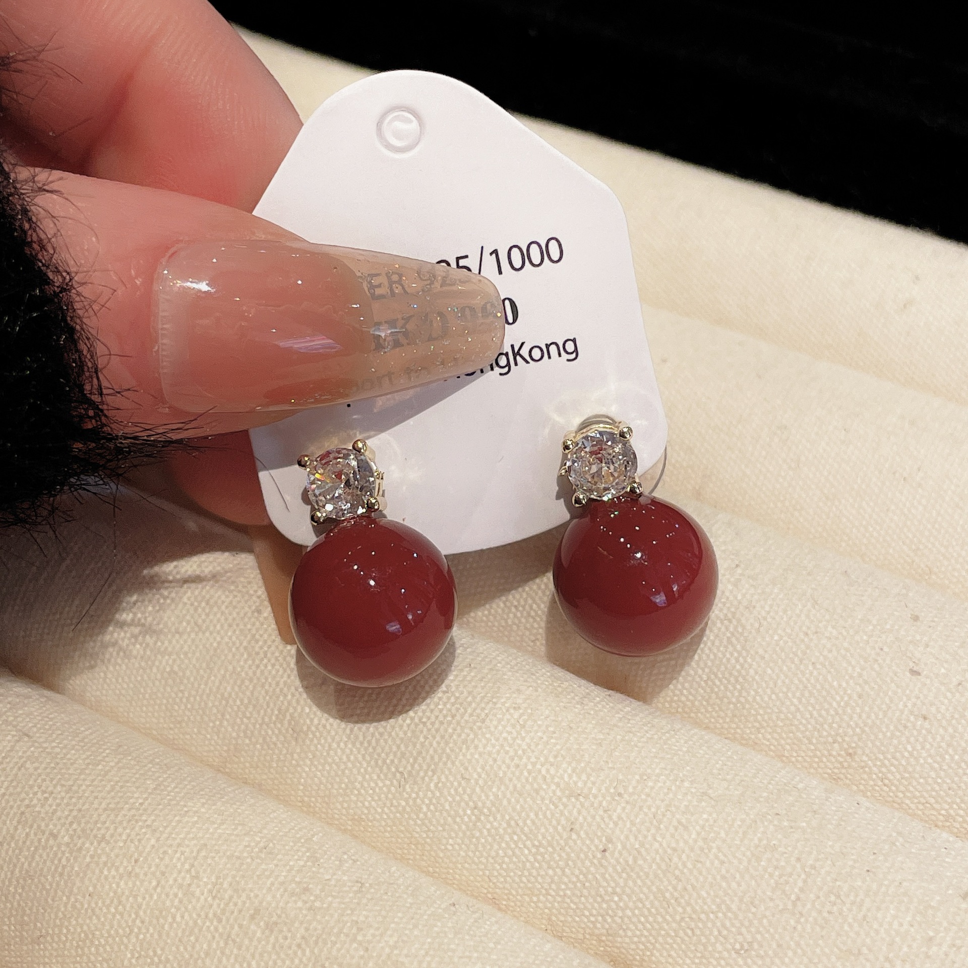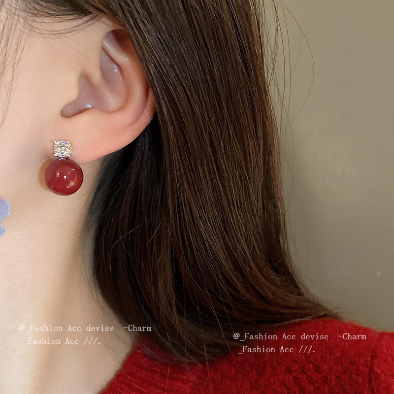 新年银针锆石珍珠红色耳环复古气质耳钉时尚高级感百搭耳饰批发女
