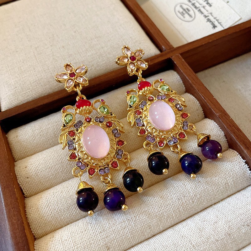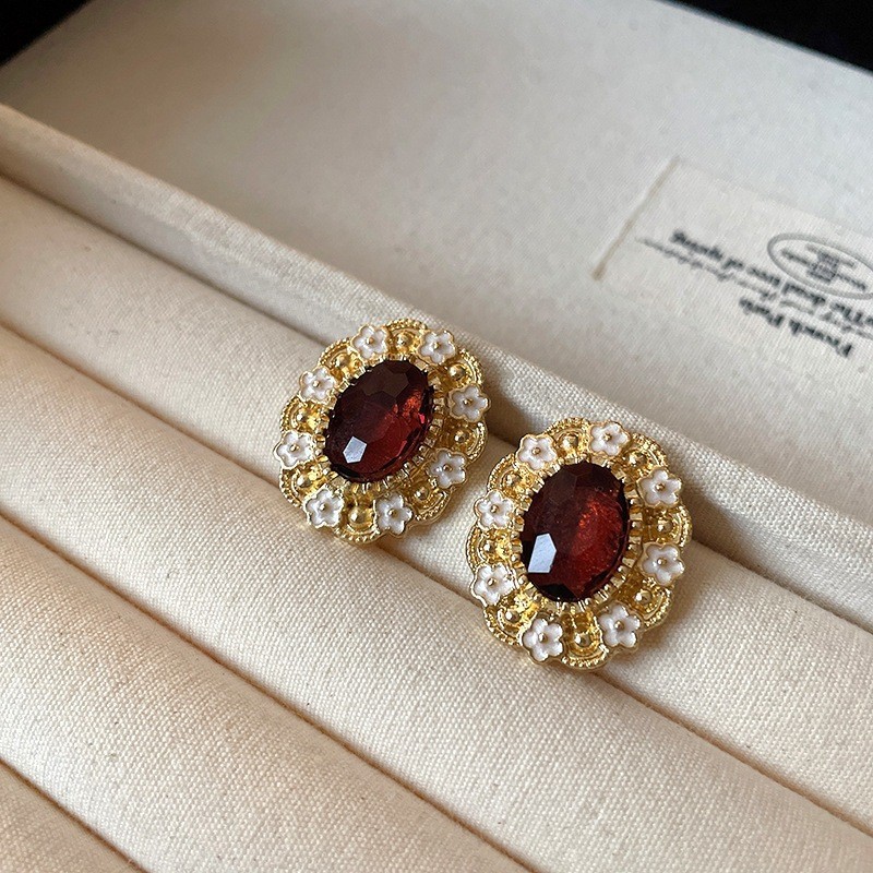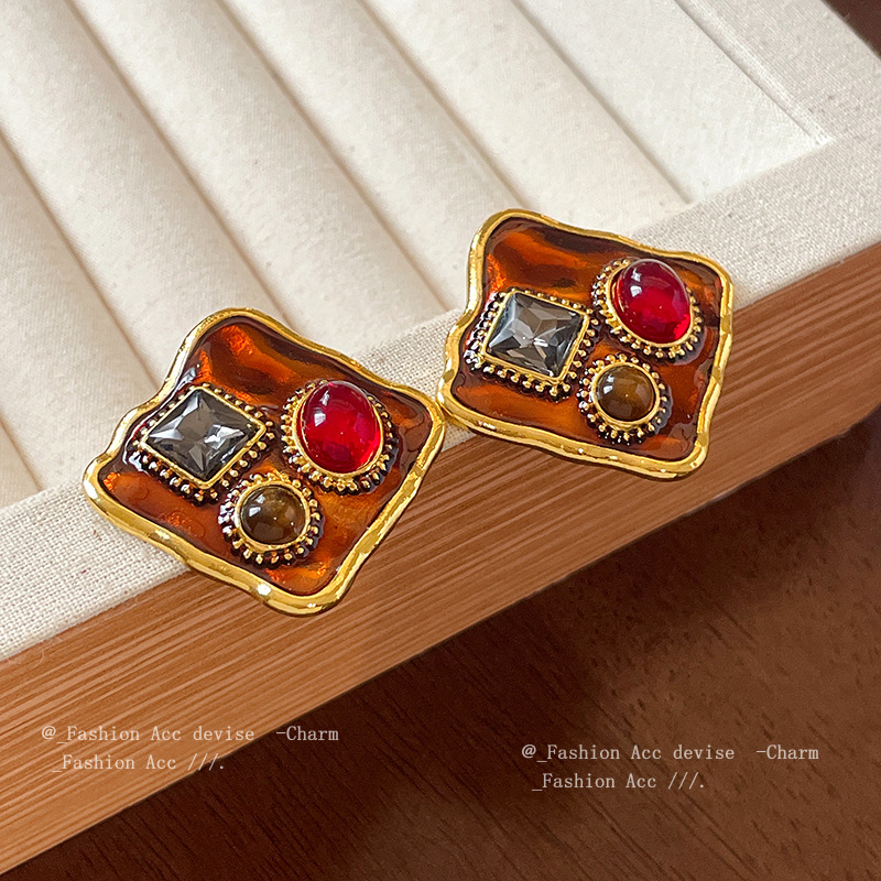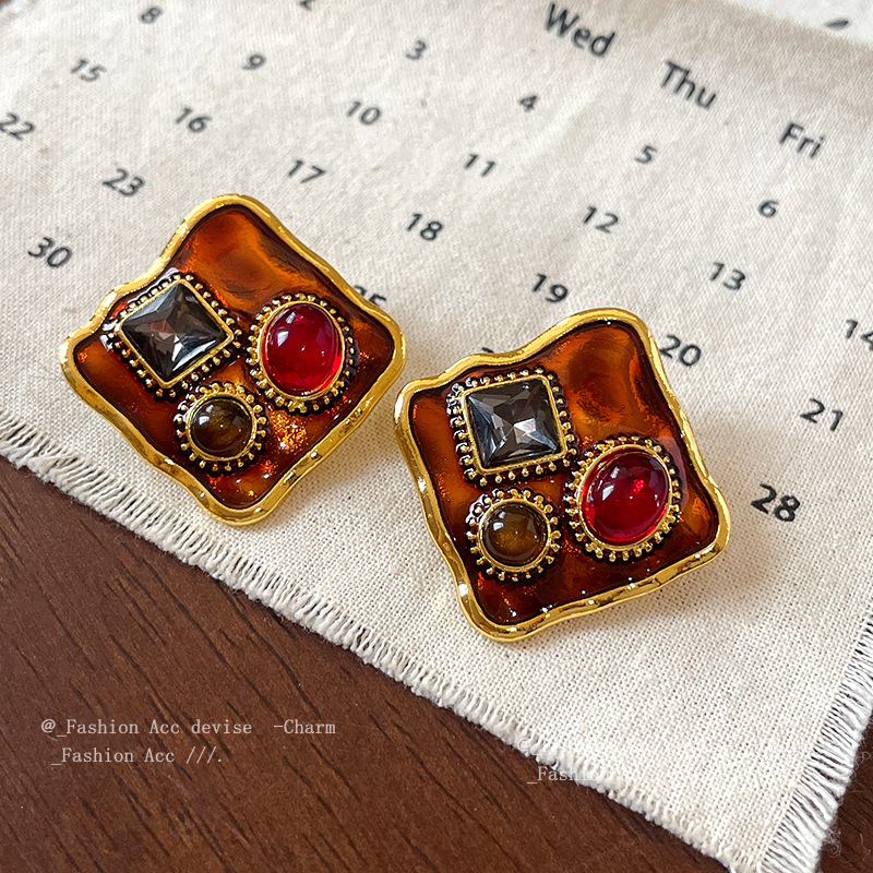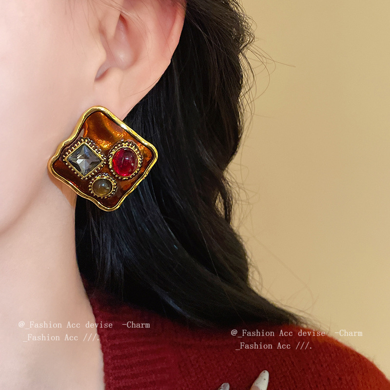 银针滴油镶钻人造虎眼石耳钉复古褶皱几何耳环中古vintage饰品女