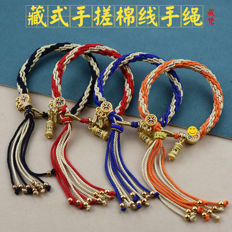 藏式手绳手工编织五彩手绳五爷文殊唐卡手链手搓棉线藏饰轮回手链