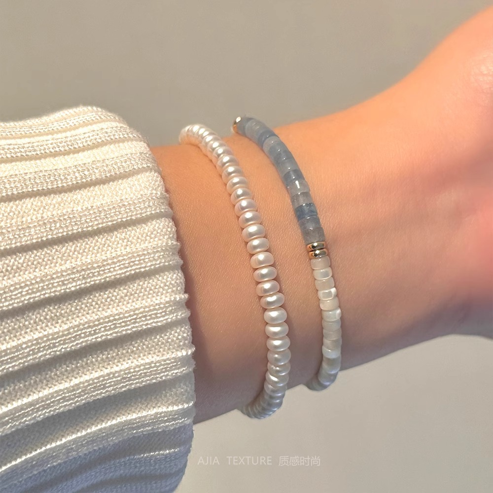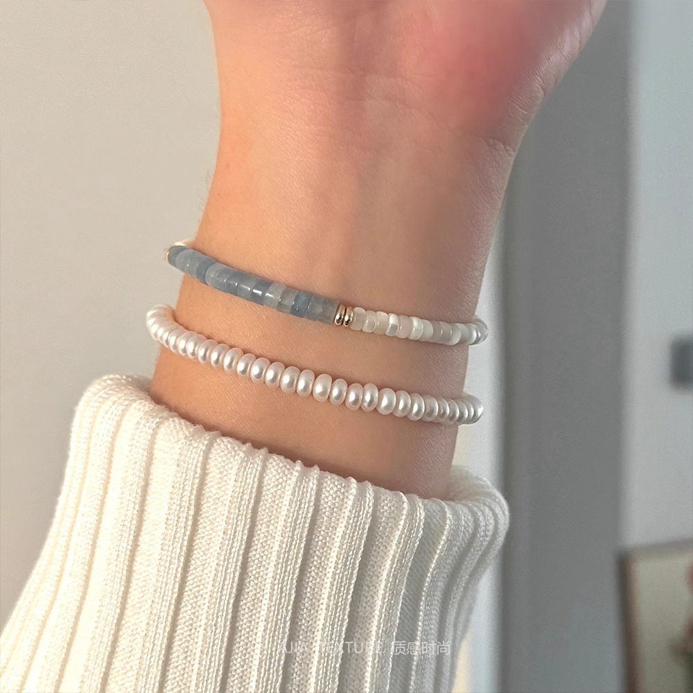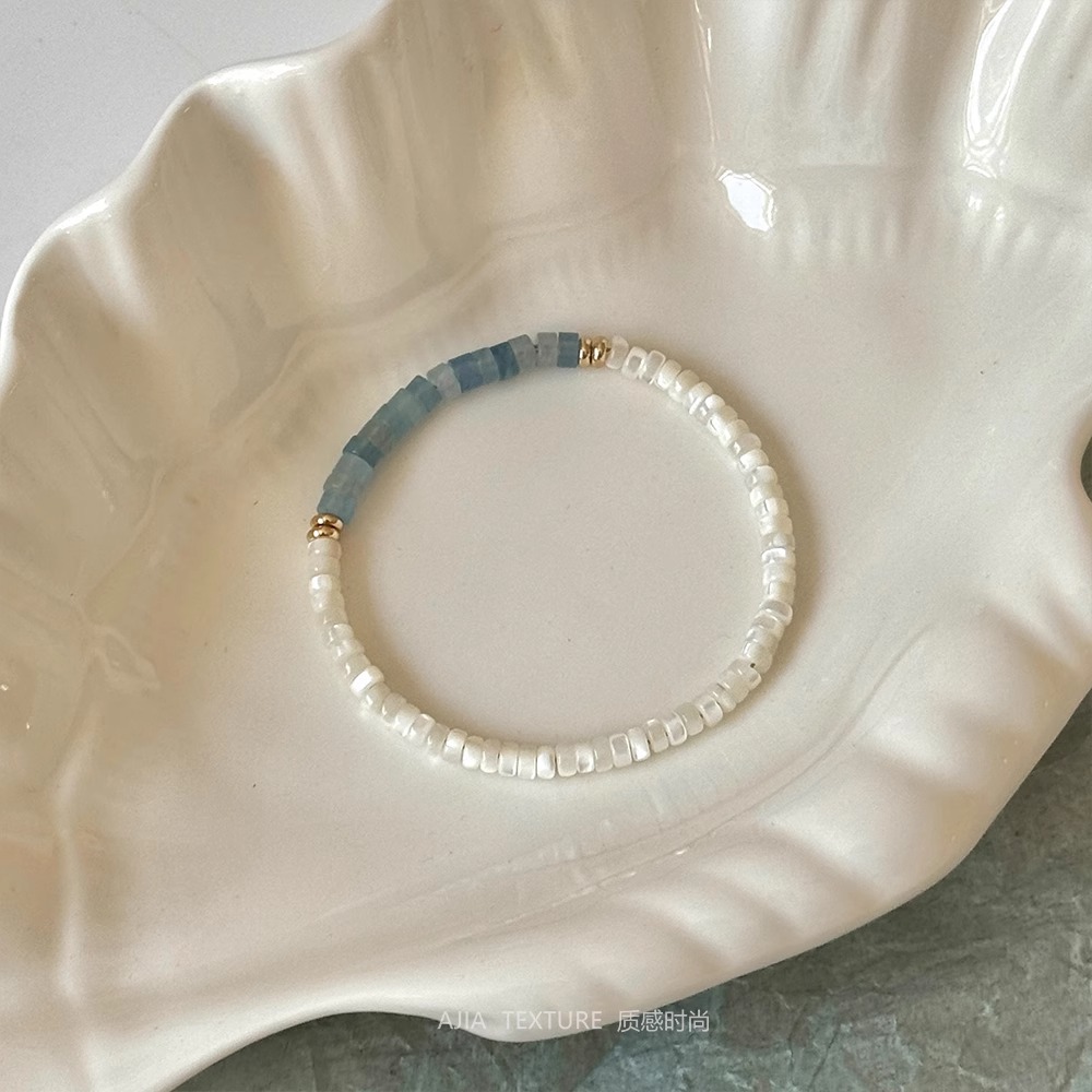 海蓝宝蝶贝手链天然白蝶贝弹力小众原创设计感精致叠戴串珠配饰