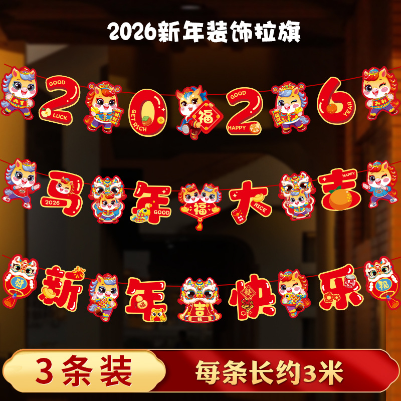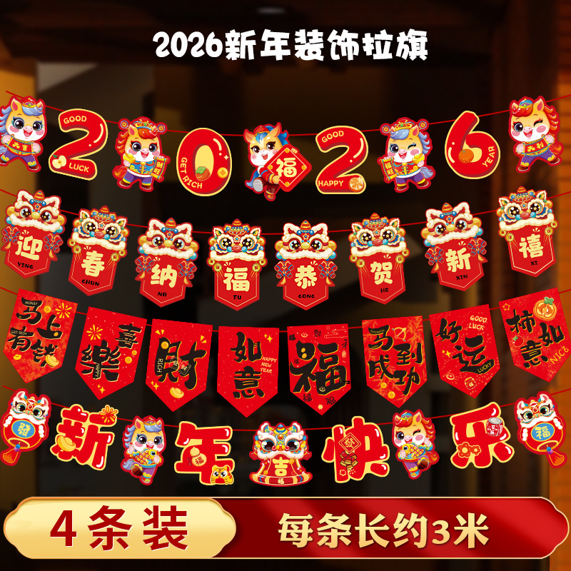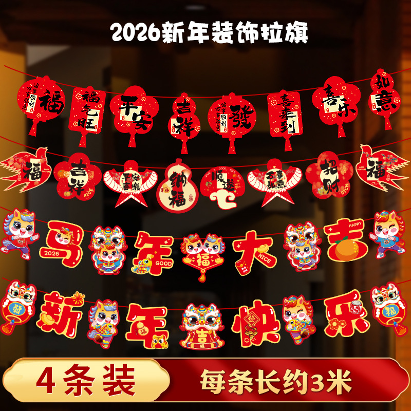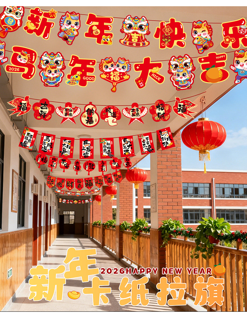 新款2026马年新年春节装饰用品拉旗拉花横幅商场店铺教室串旗批货