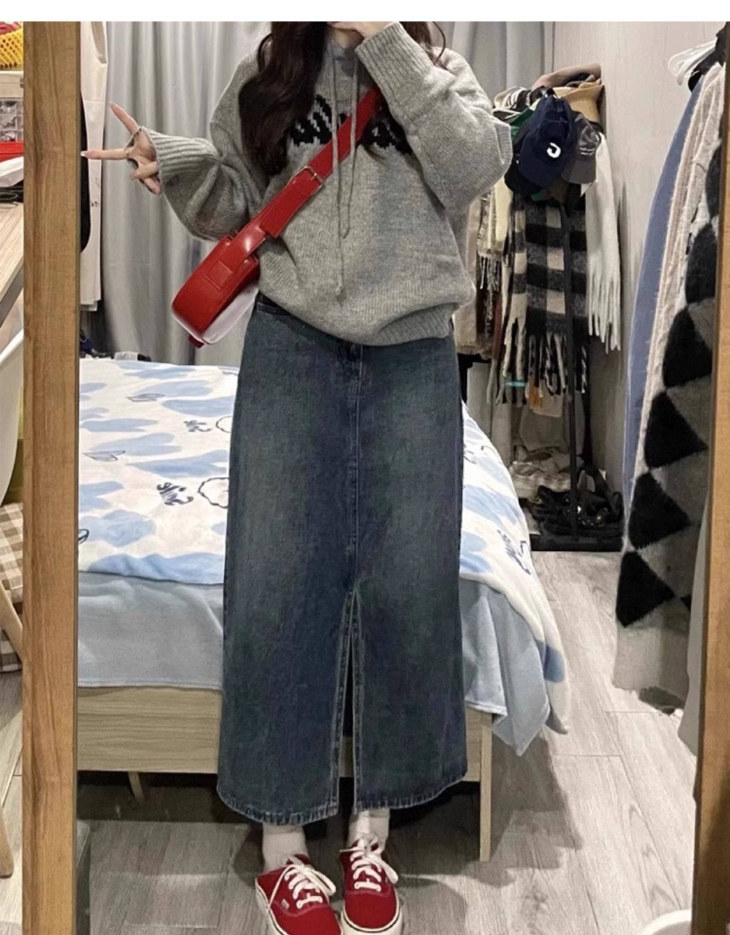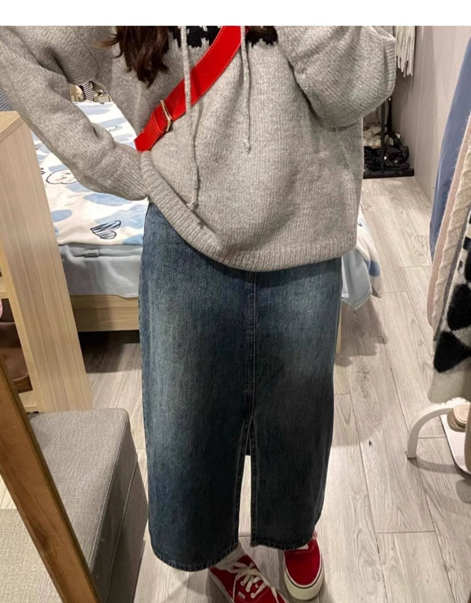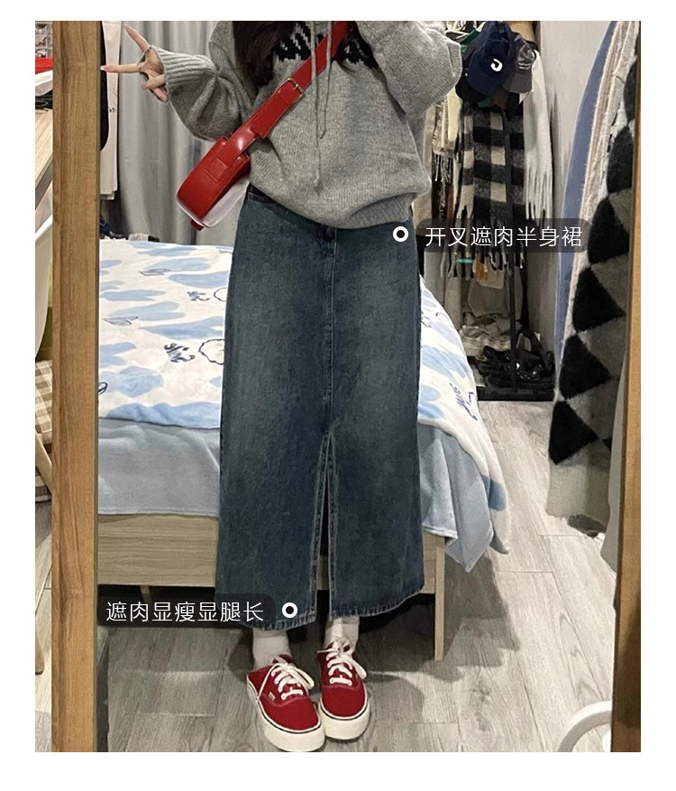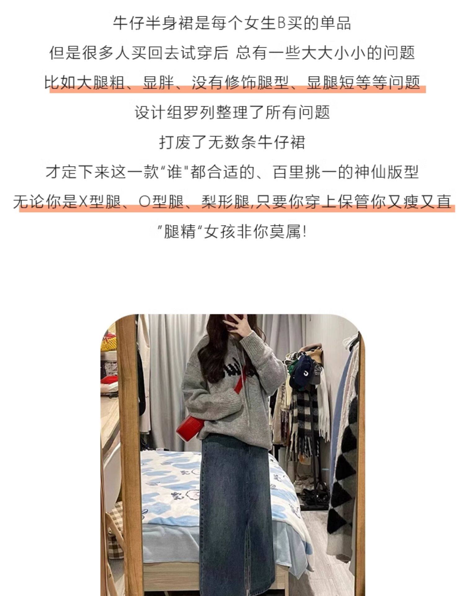 复古开叉牛仔半身裙女秋季高腰大码胖mm显瘦梨形身材中长款a字裙