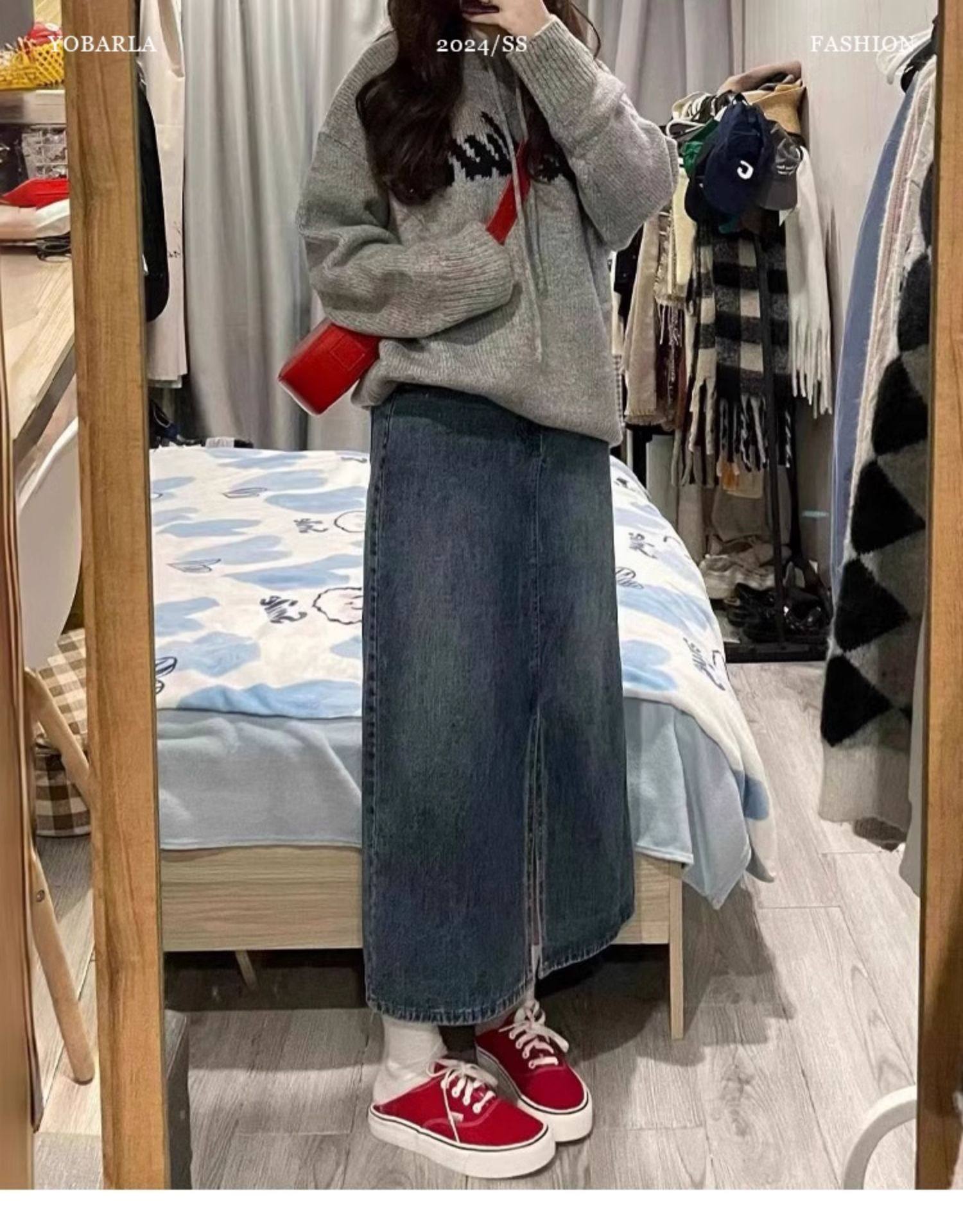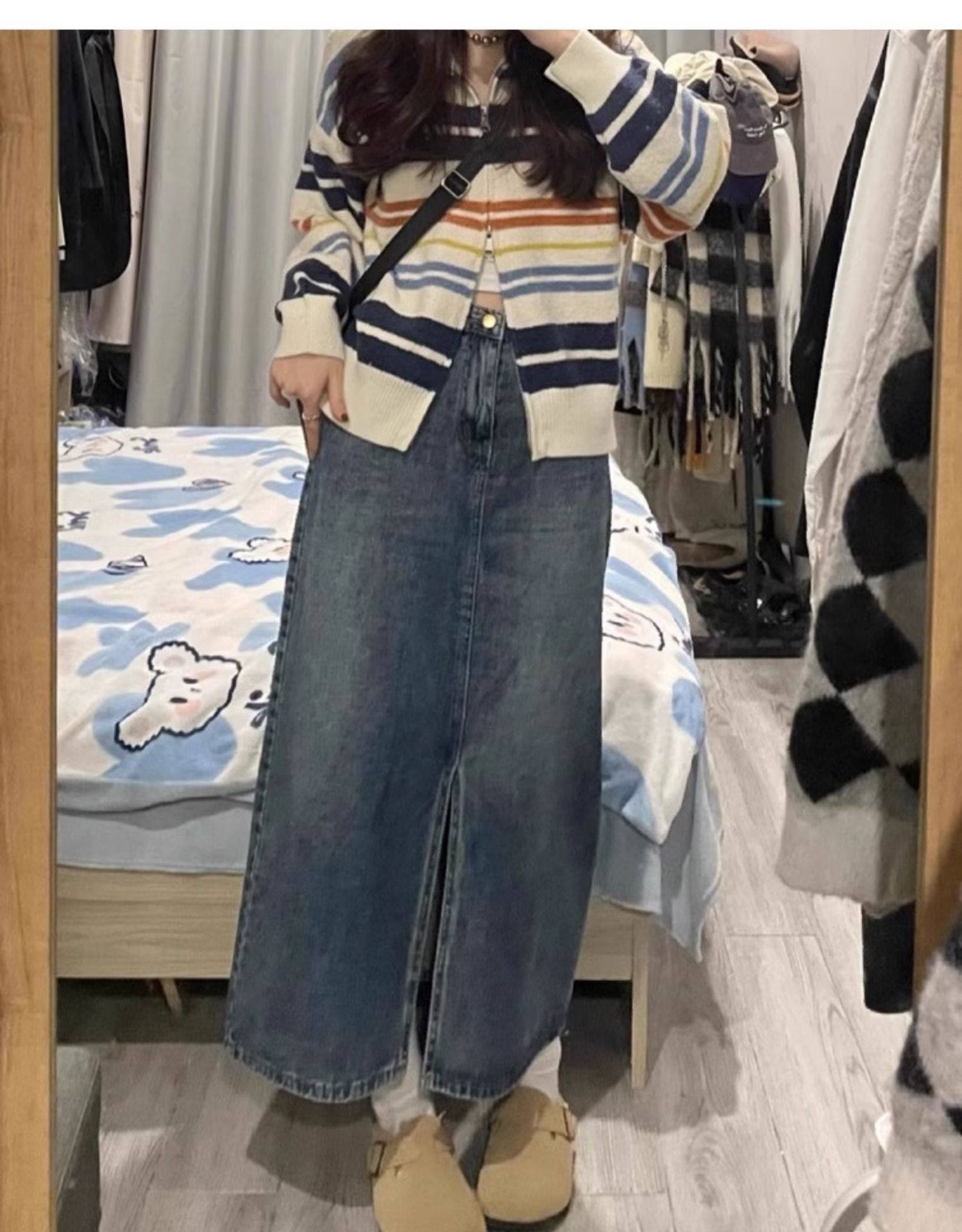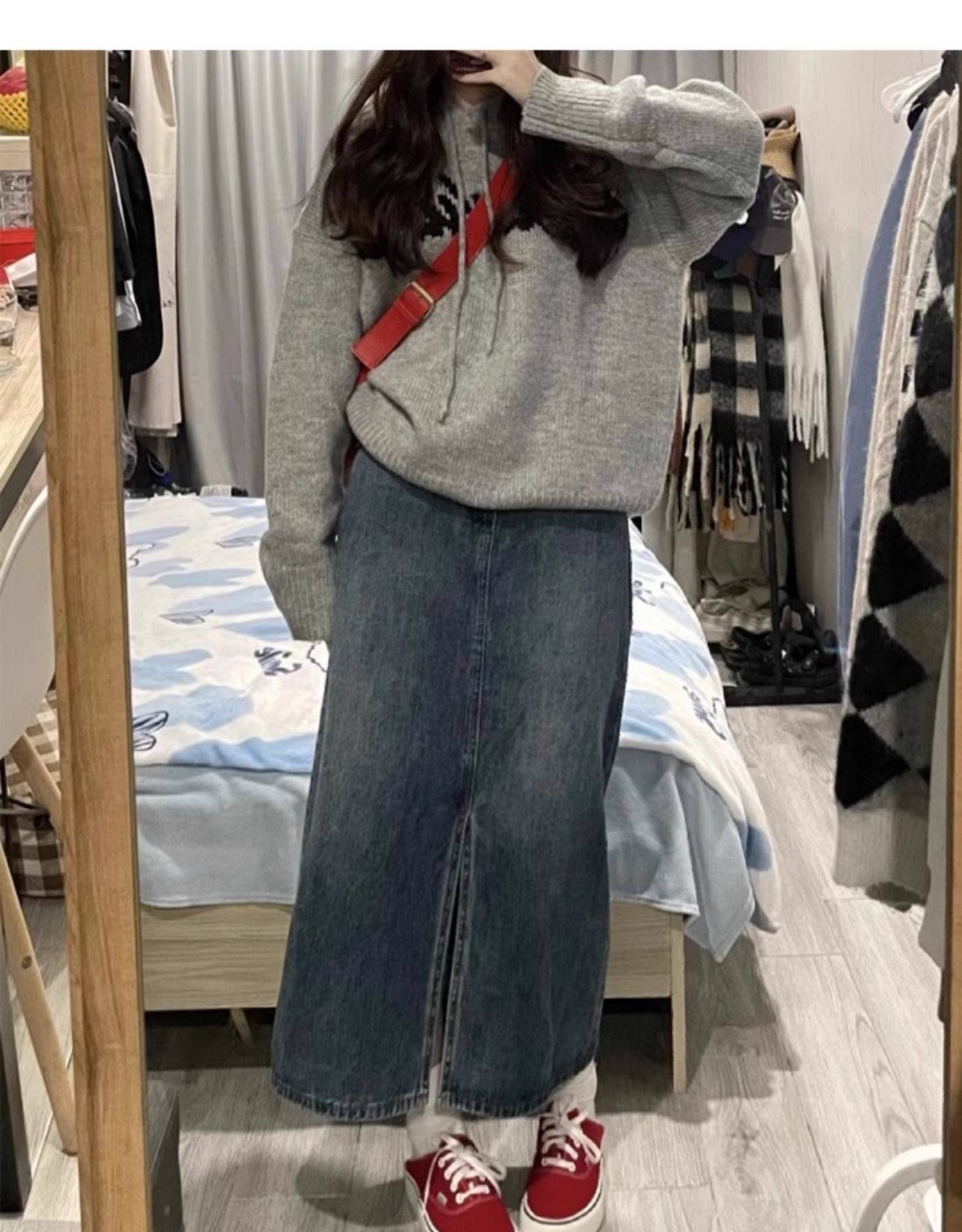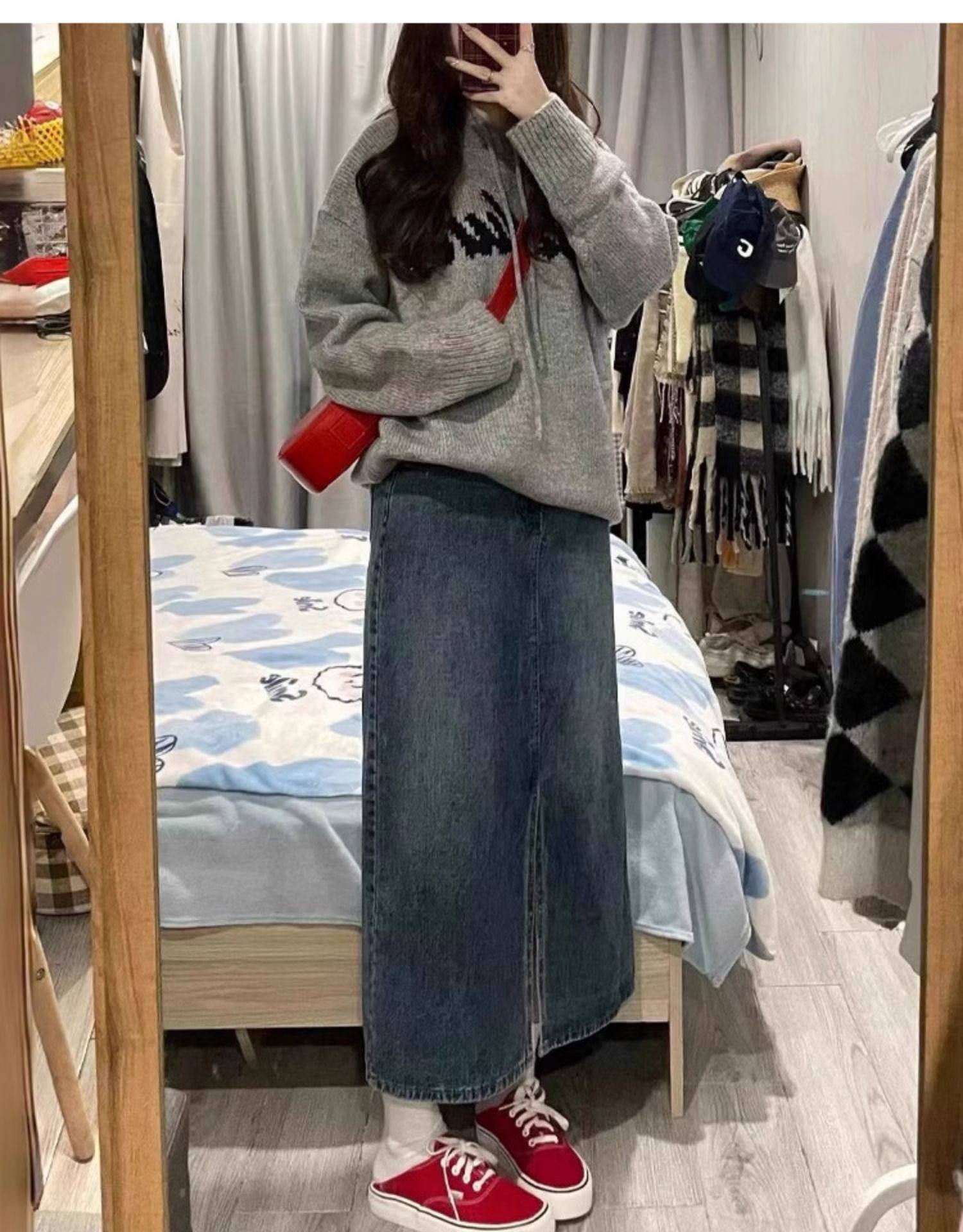 复古开叉牛仔半身裙女秋季高腰大码胖mm显瘦梨形身材中长款a字裙