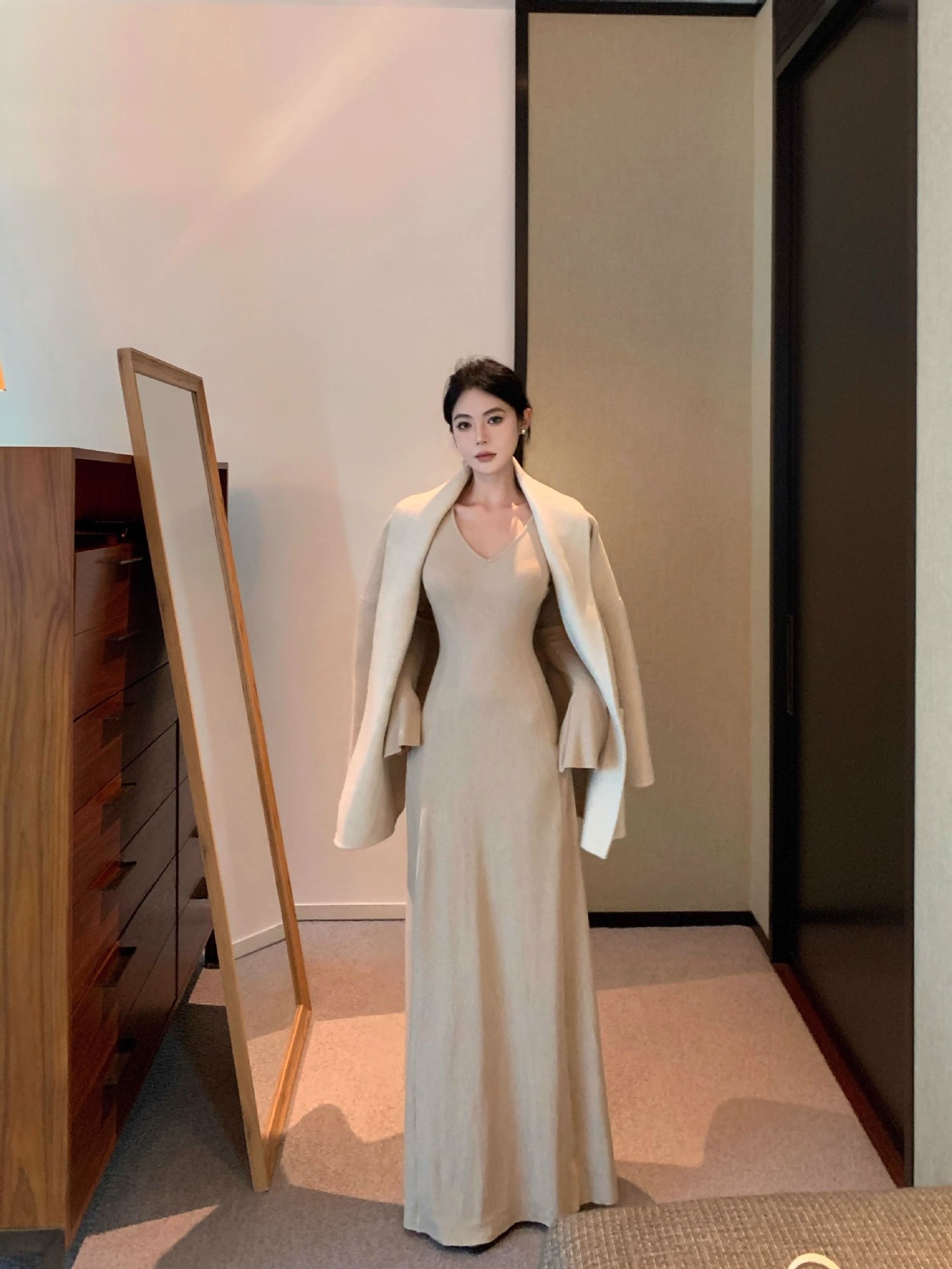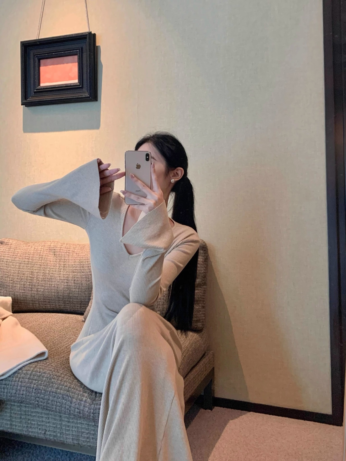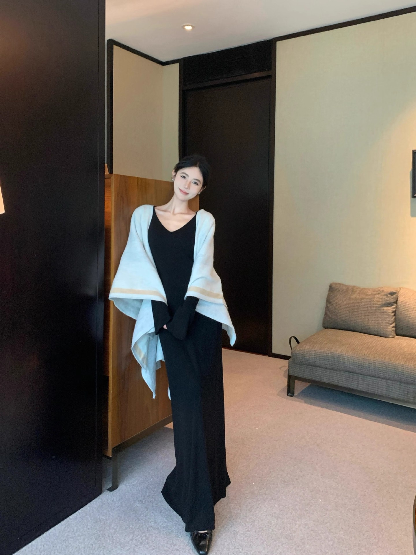 茶香可颂法式V领喇叭袖针织连衣裙女冬季气质收腰包臀鱼尾裙长裙