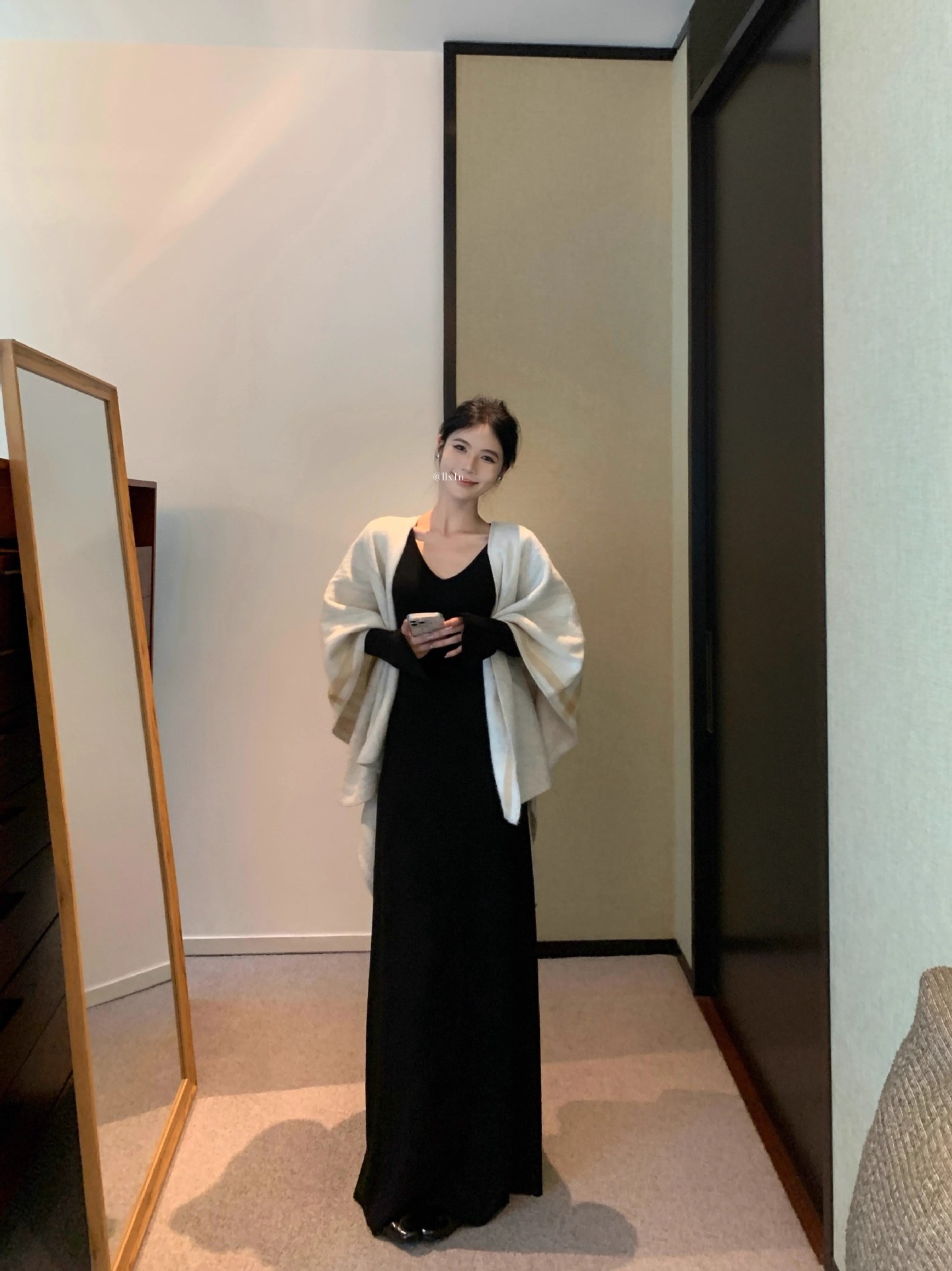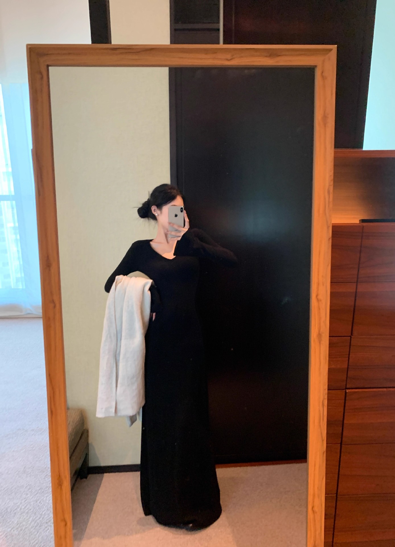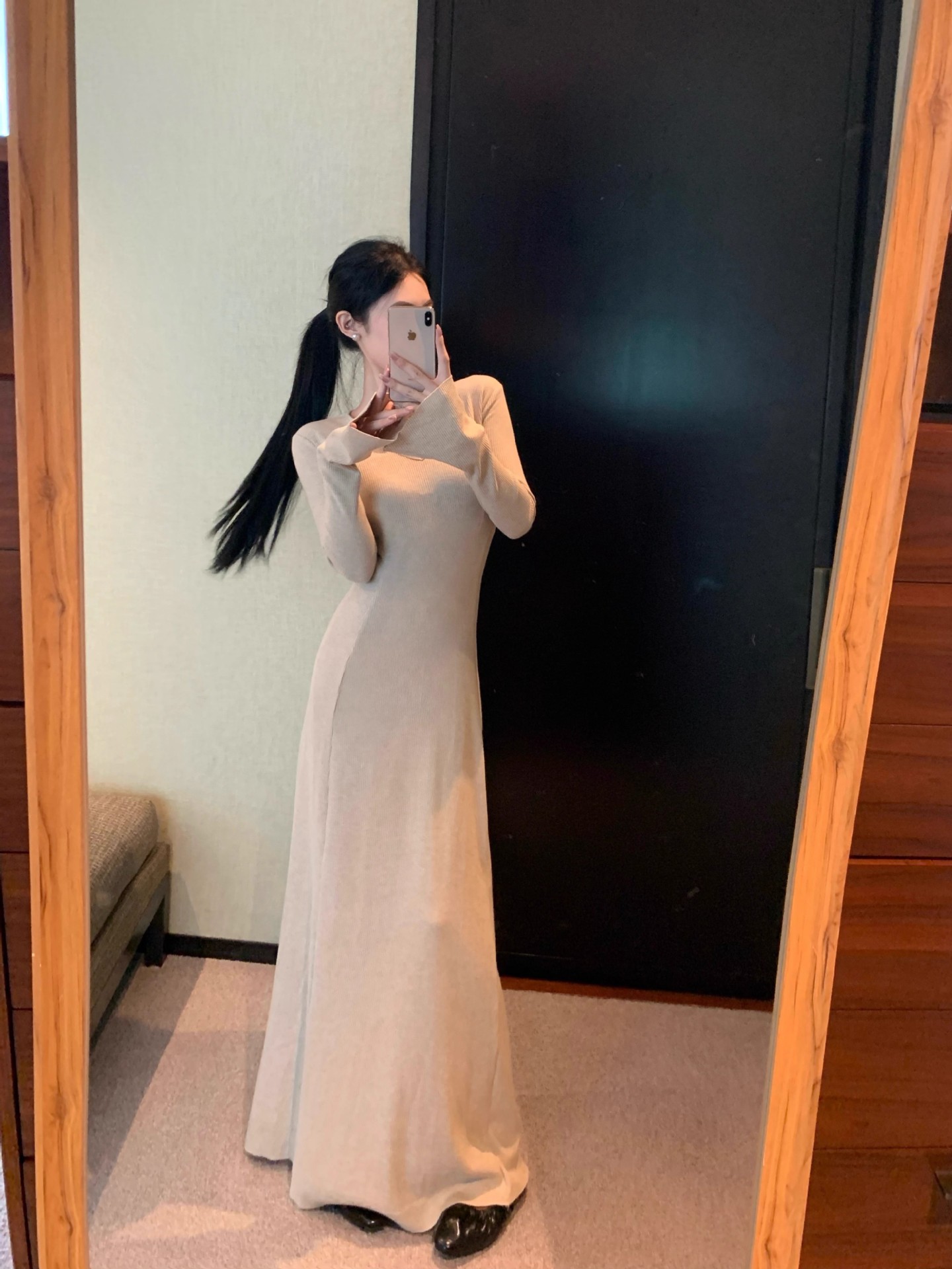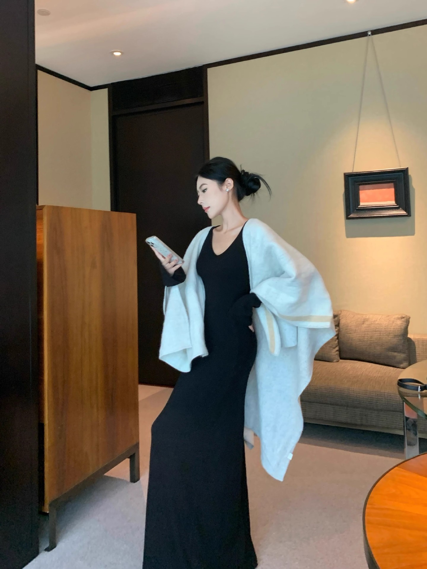 茶香可颂法式V领喇叭袖针织连衣裙女冬季气质收腰包臀鱼尾裙长裙