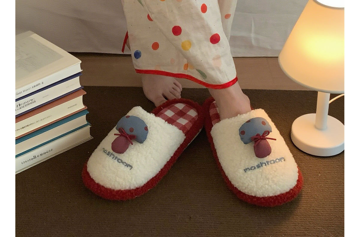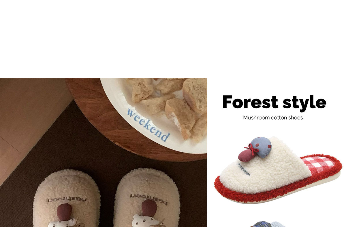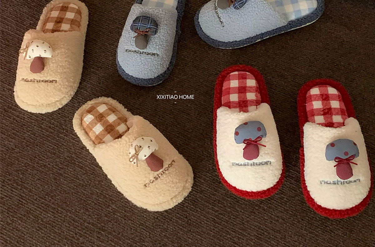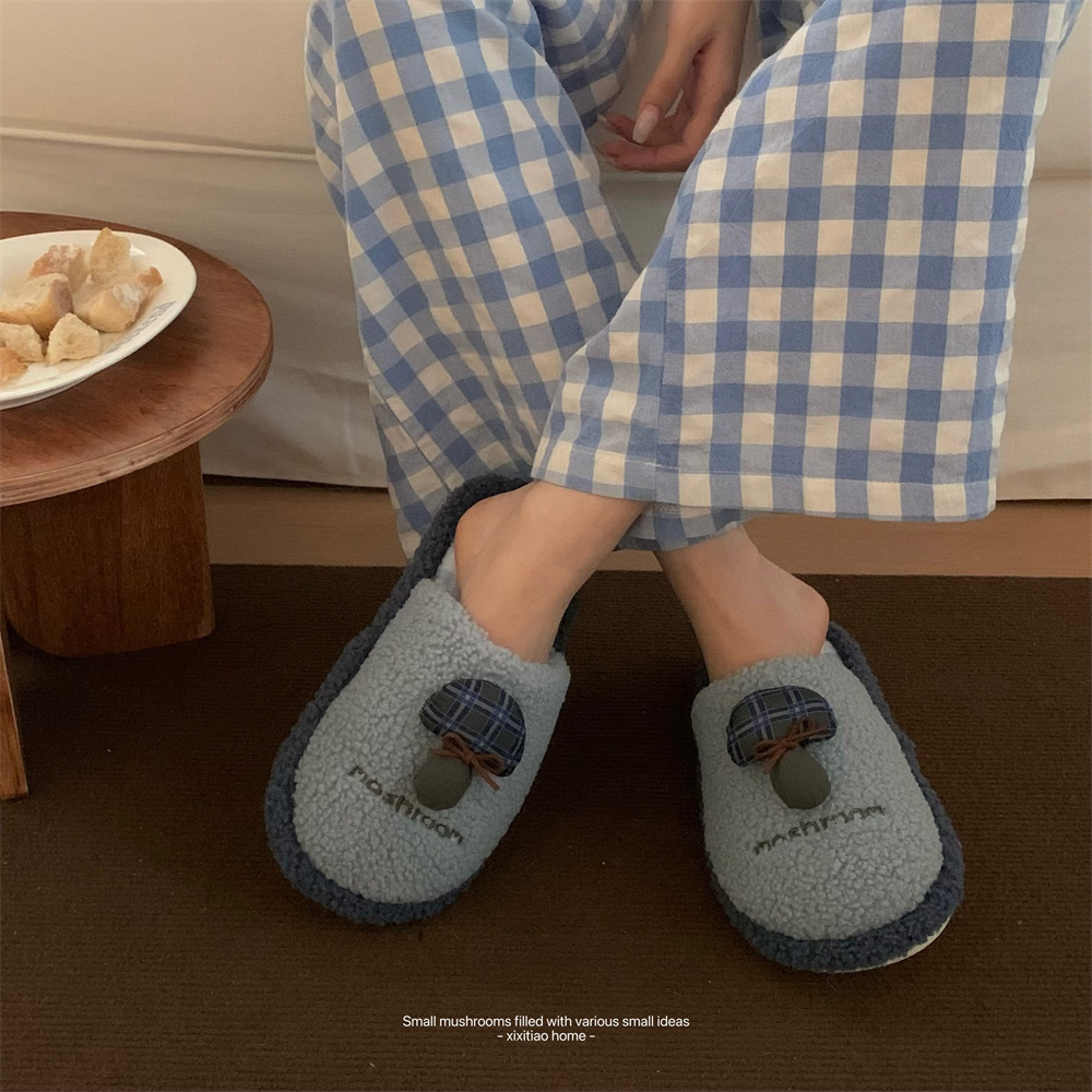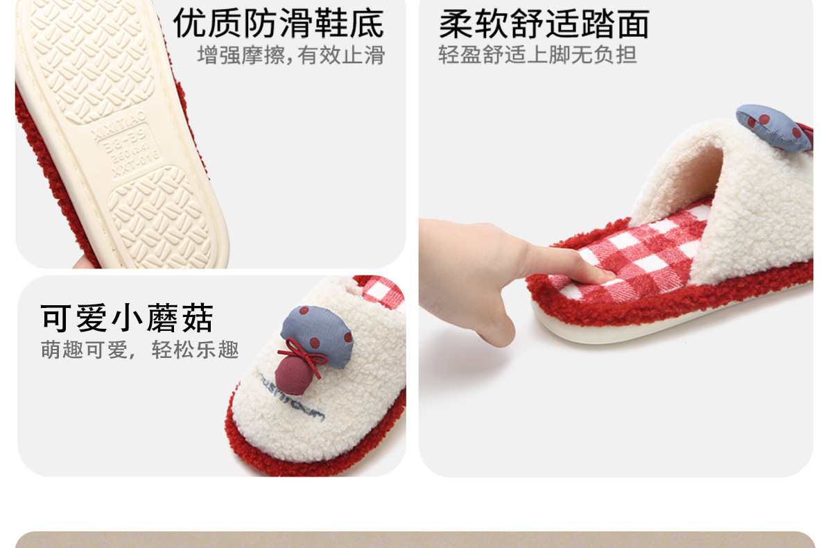 细细条 复古撞色小蘑菇棉拖鞋女秋冬保暖可爱学生居家舒适毛毛鞋