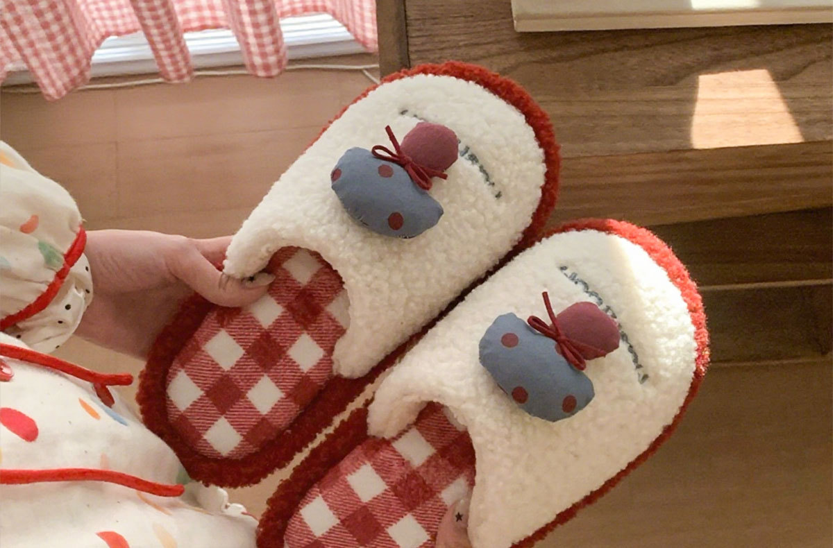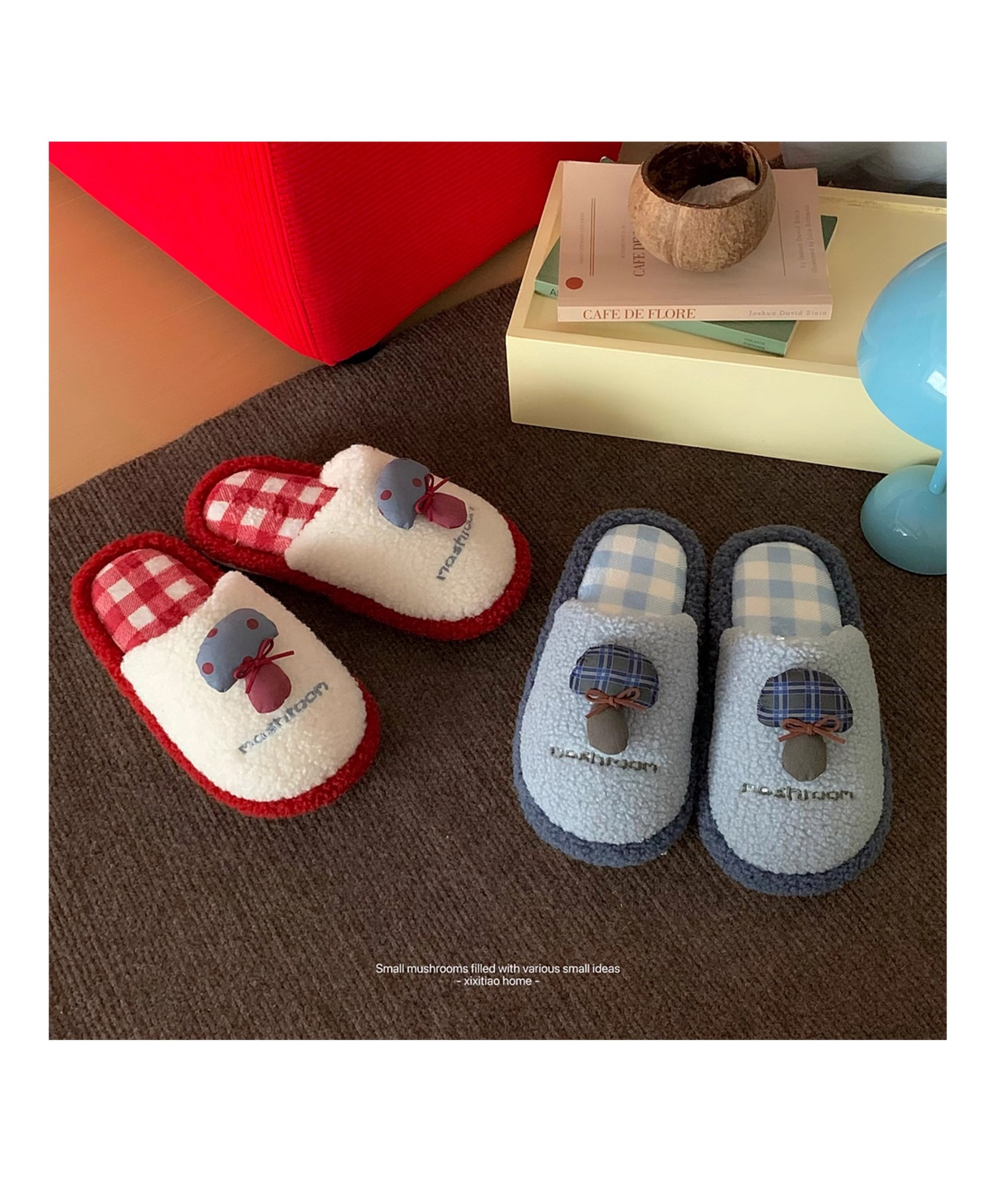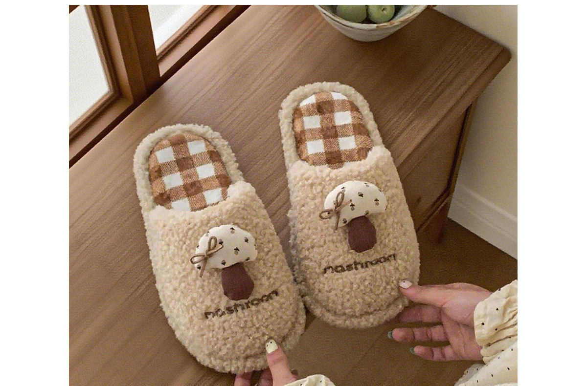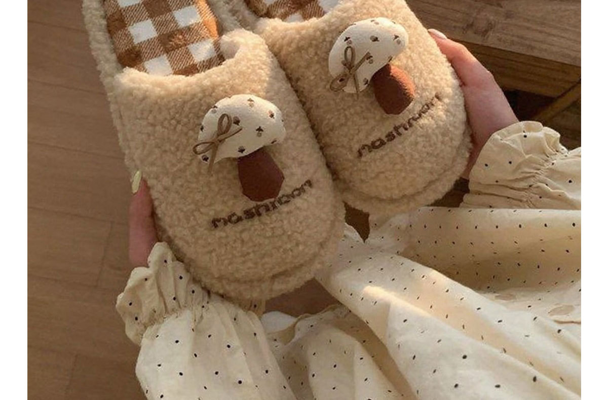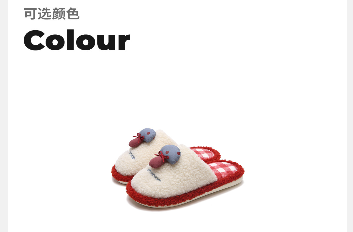细细条 复古撞色小蘑菇棉拖鞋女秋冬保暖可爱学生居家舒适毛毛鞋