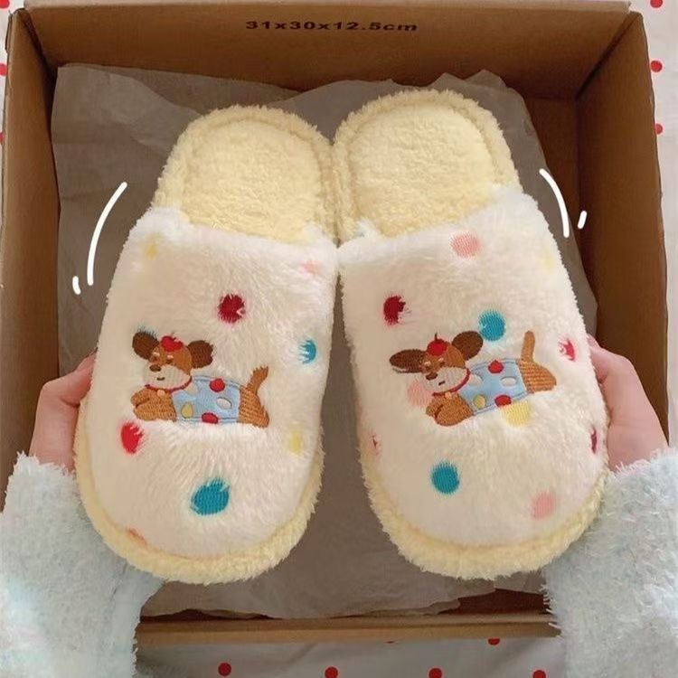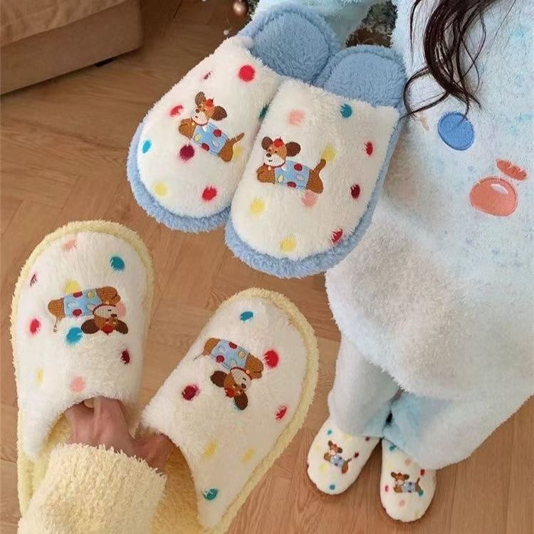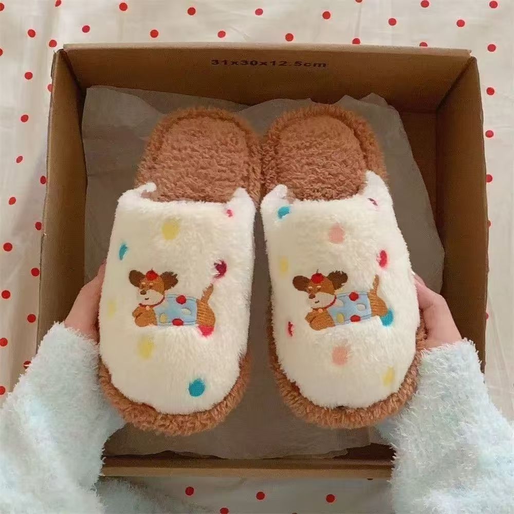加绒卡通彩点狗狗棉拖鞋舒适保暖家用趣味包头毛毛鞋男女冬季