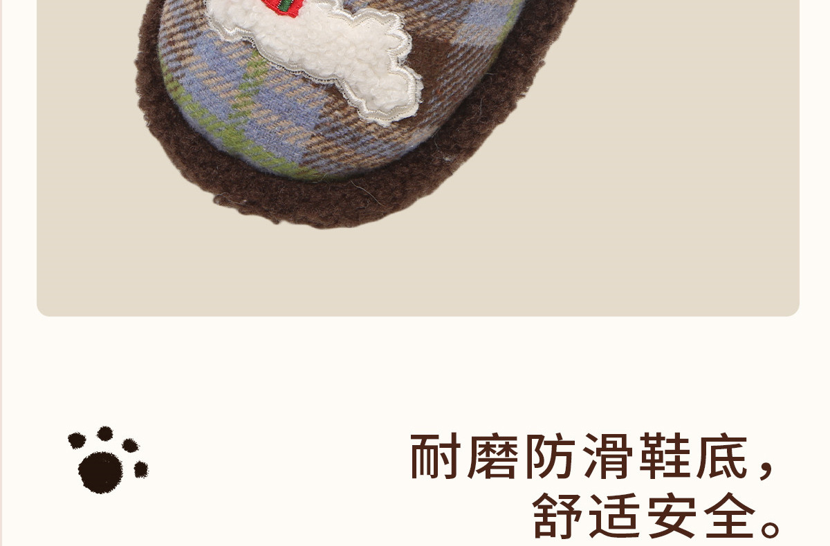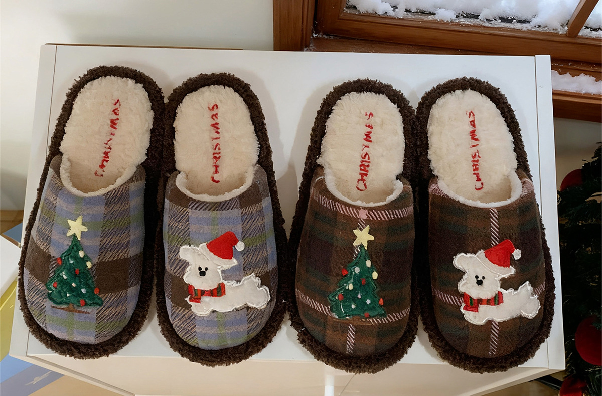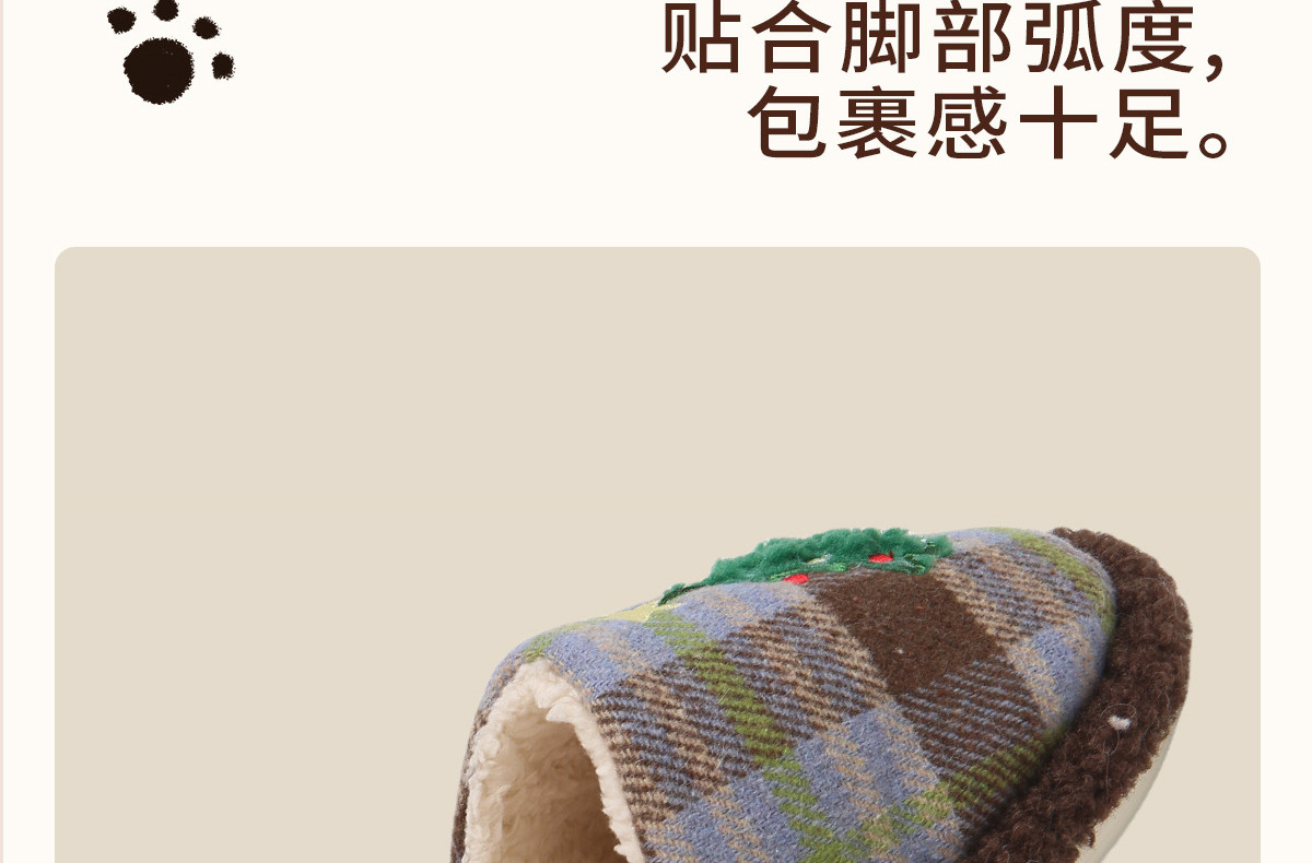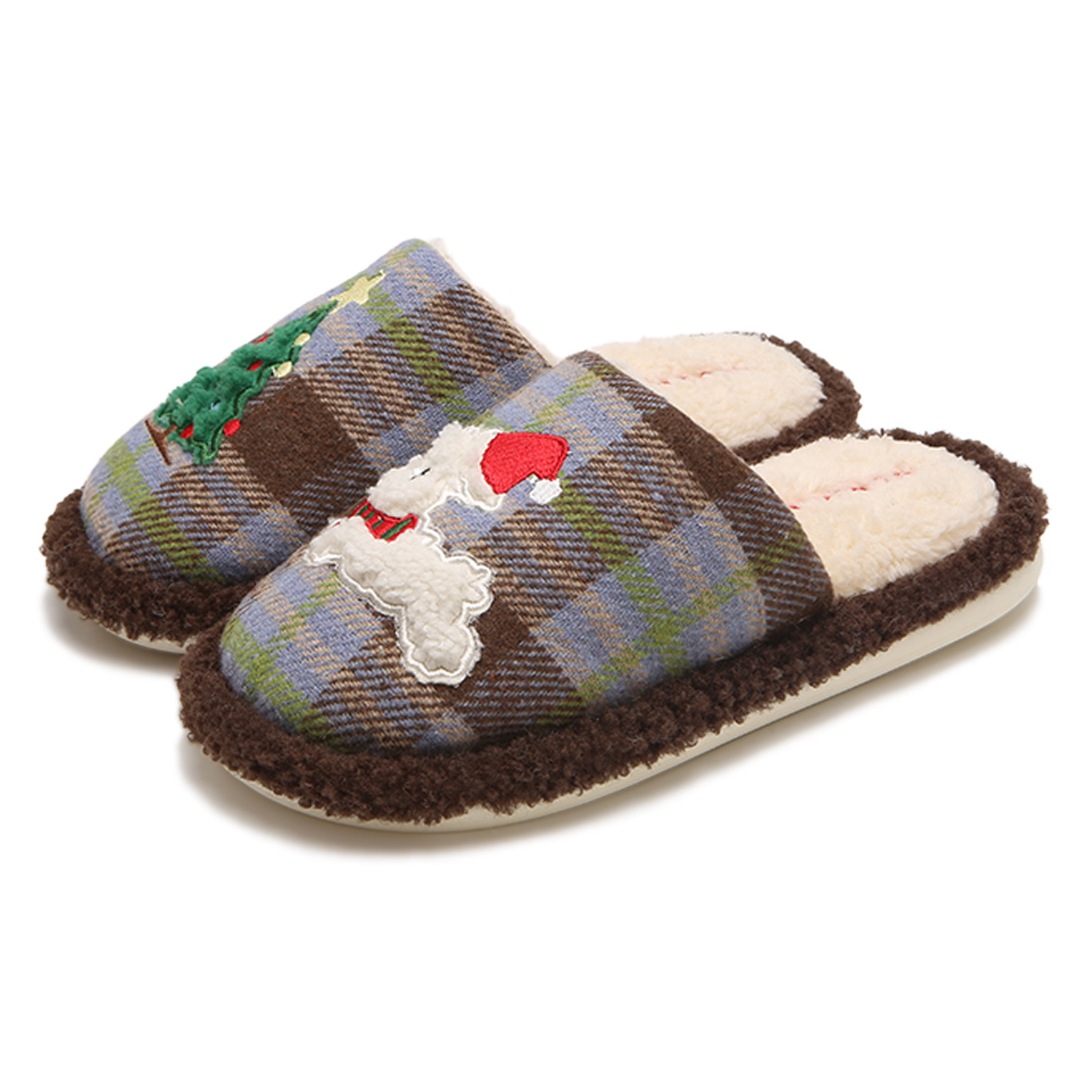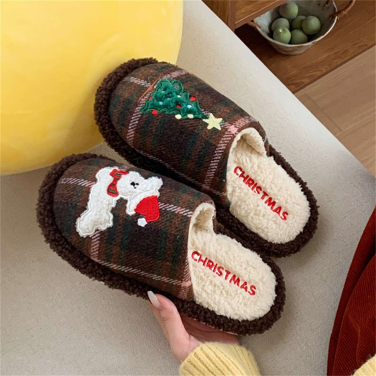 卧室趣味刺绣小狗女士棉拖鞋复古格子居家保暖创意圣诞树毛毛鞋冬