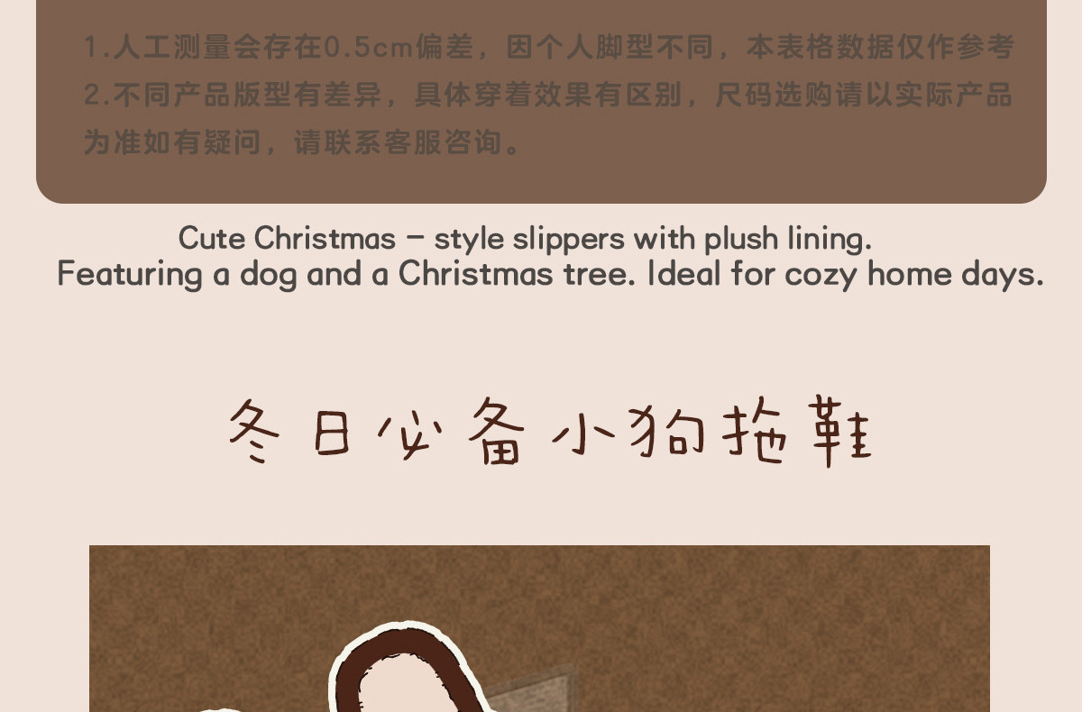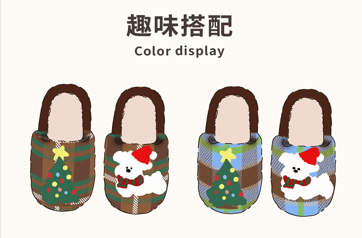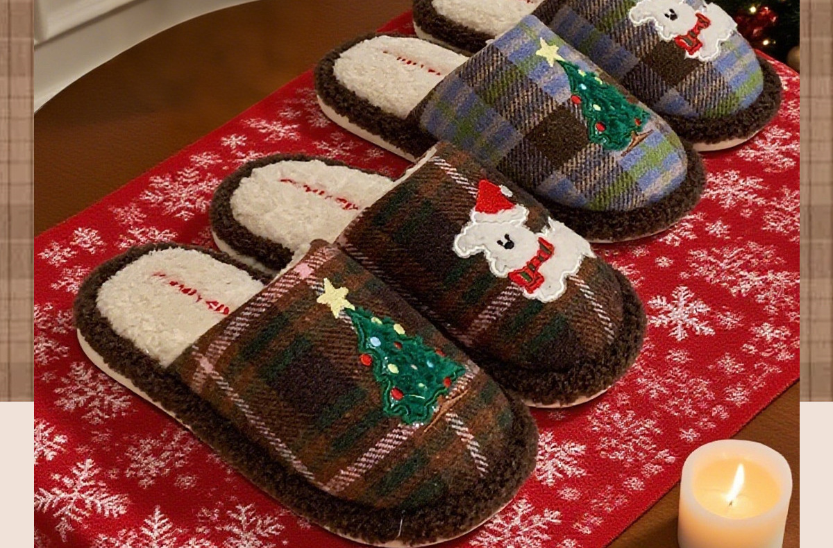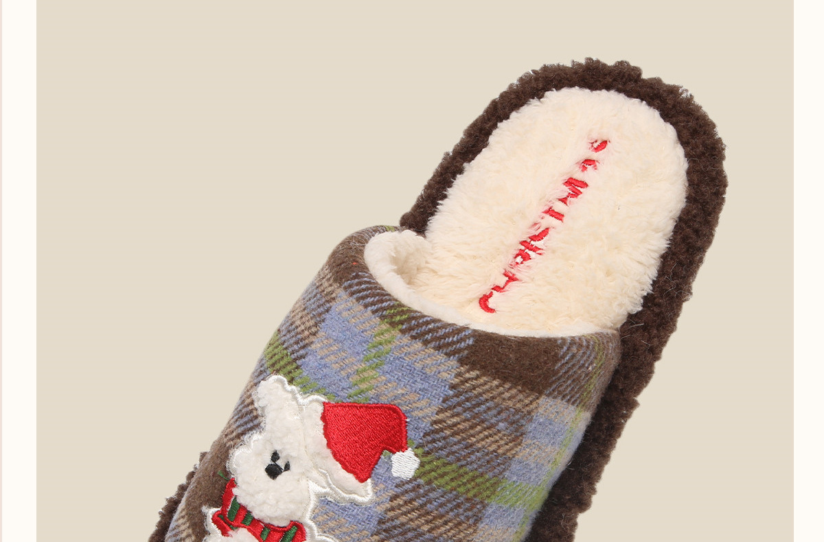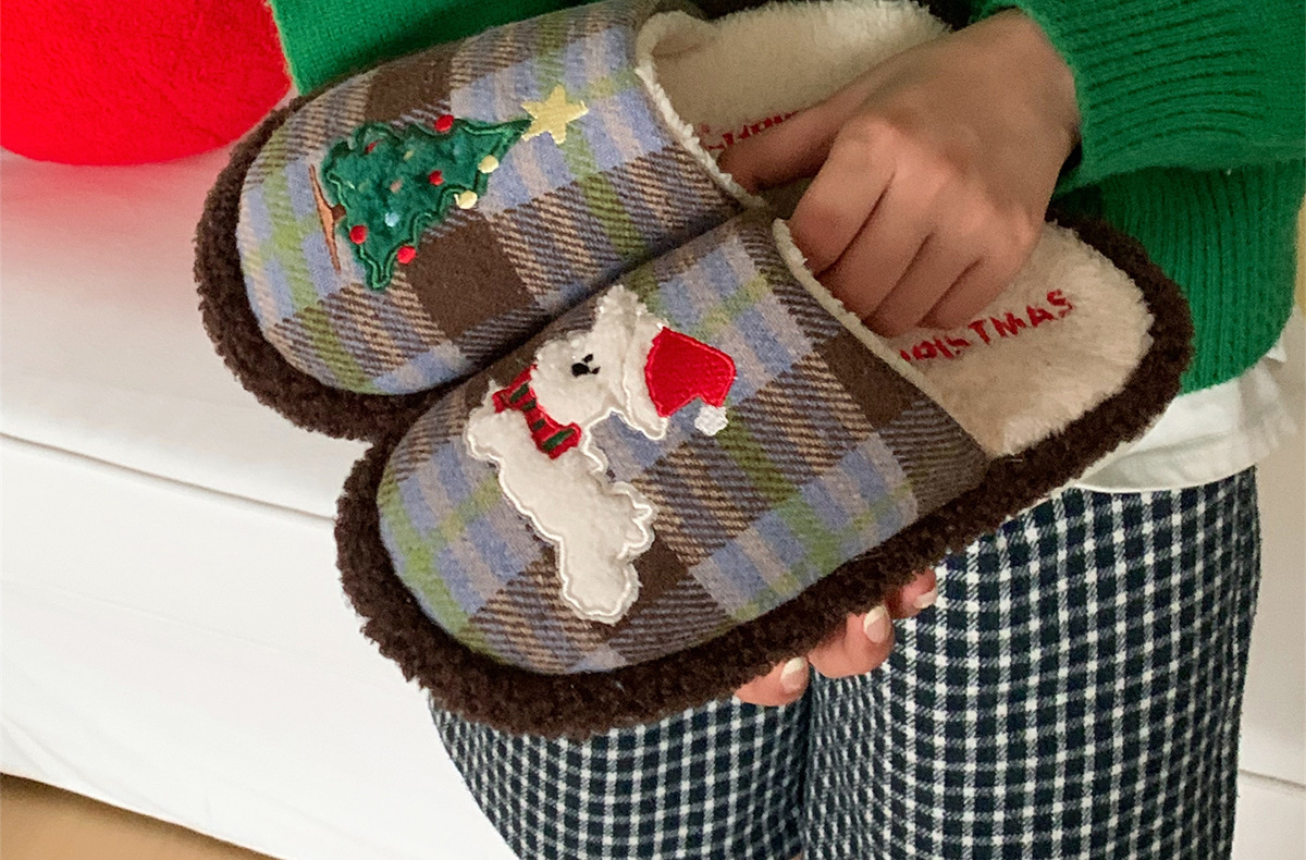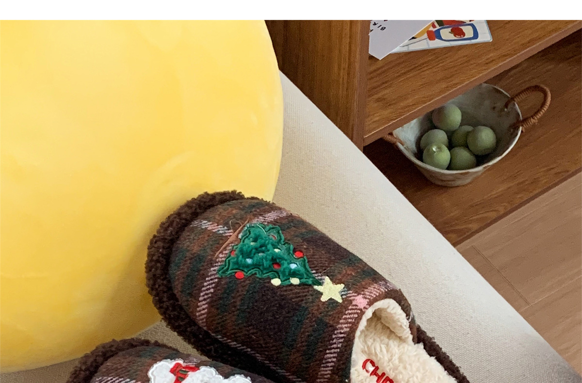 卧室趣味刺绣小狗女士棉拖鞋复古格子居家保暖创意圣诞树毛毛鞋冬