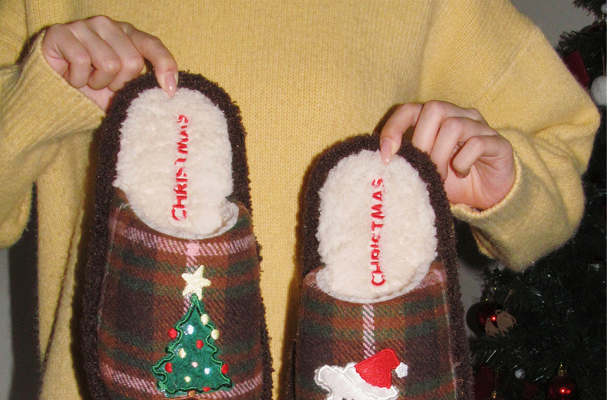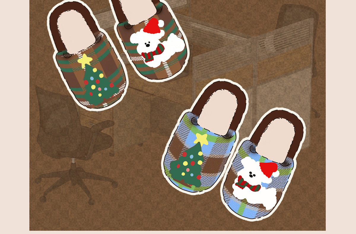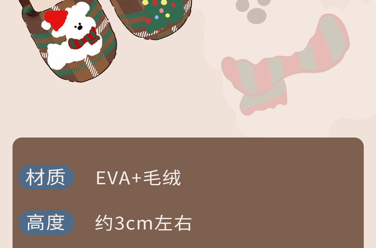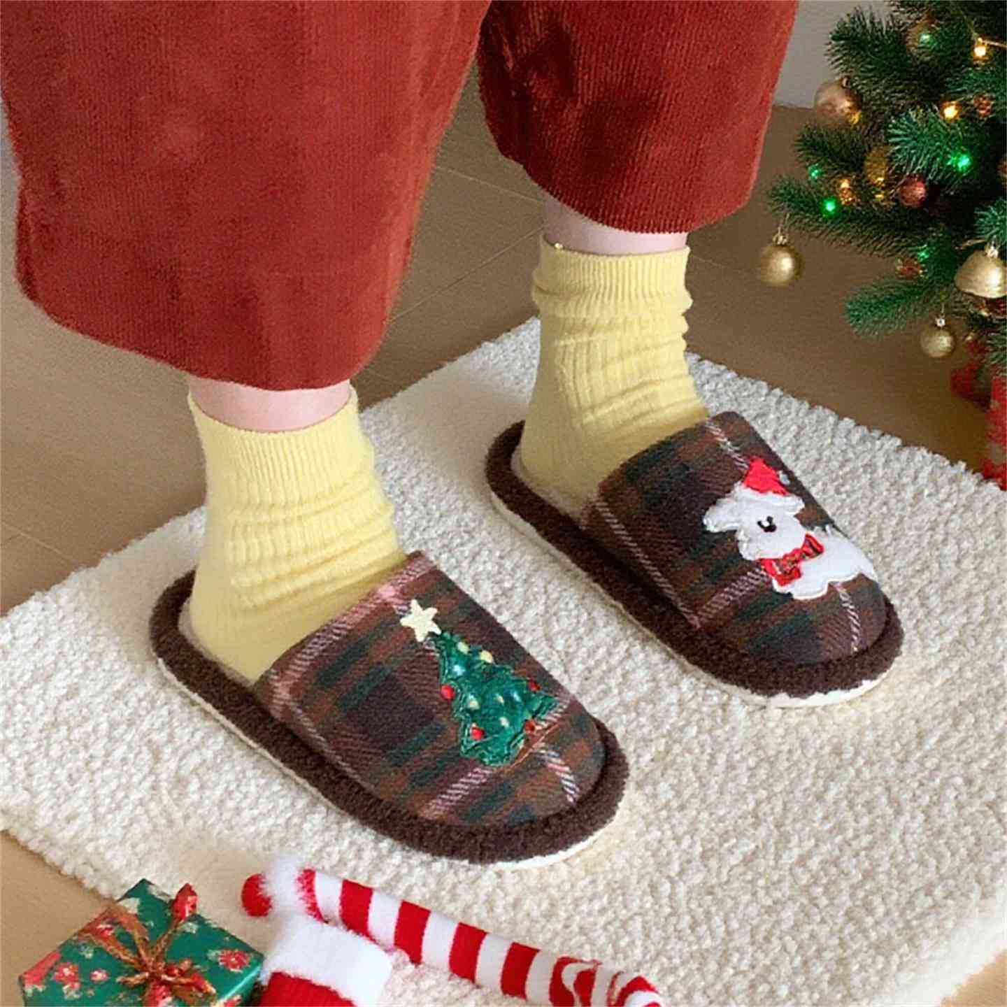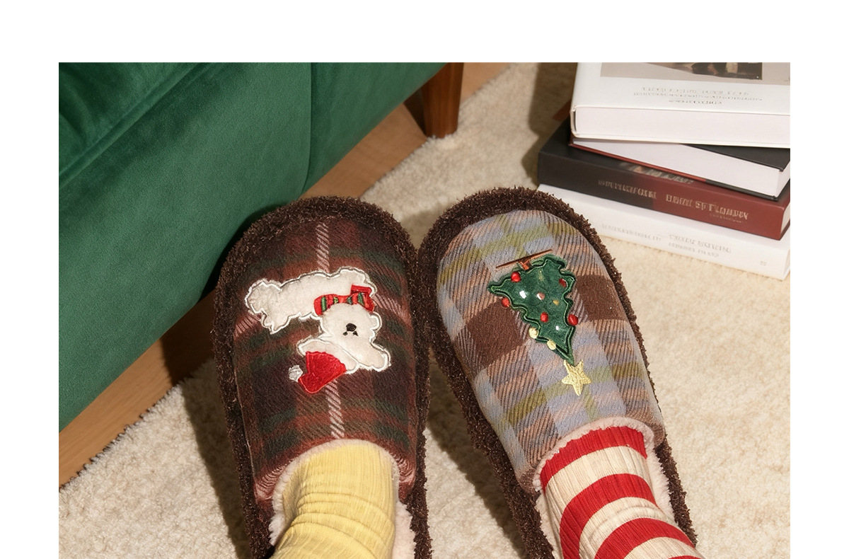 卧室趣味刺绣小狗女士棉拖鞋复古格子居家保暖创意圣诞树毛毛鞋冬