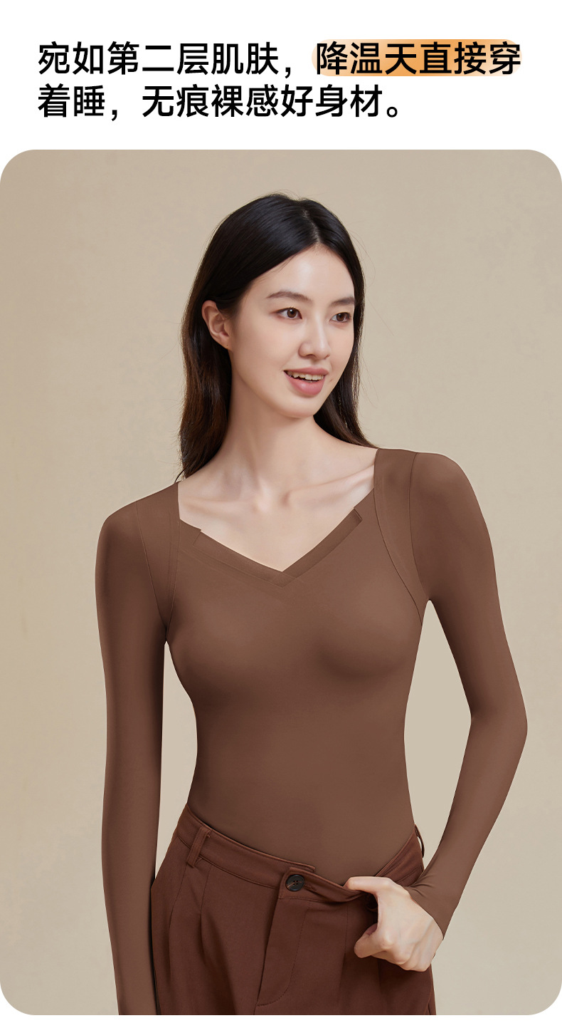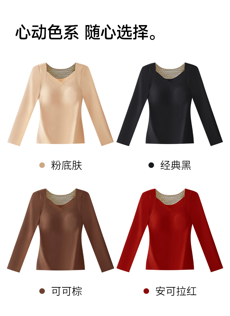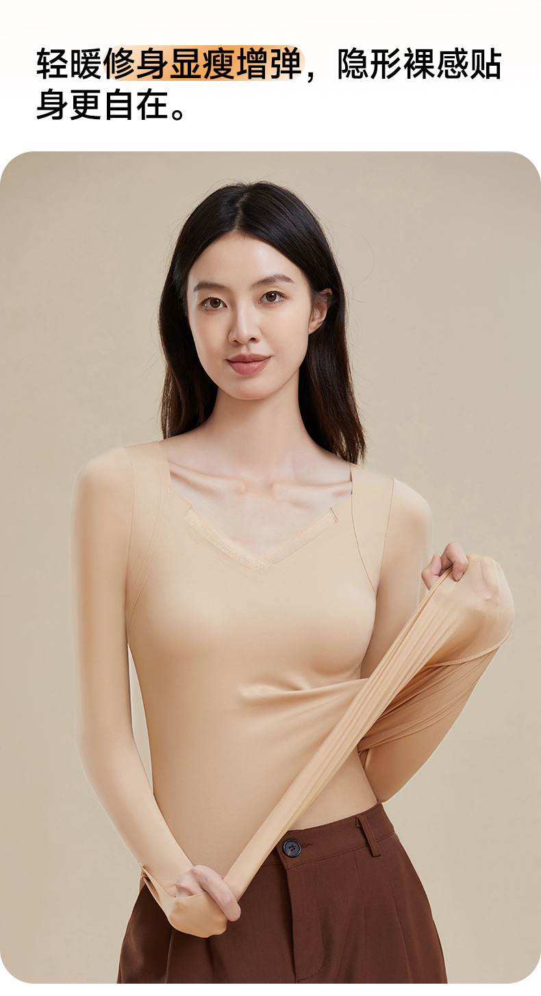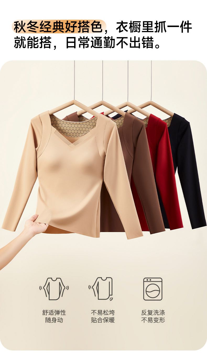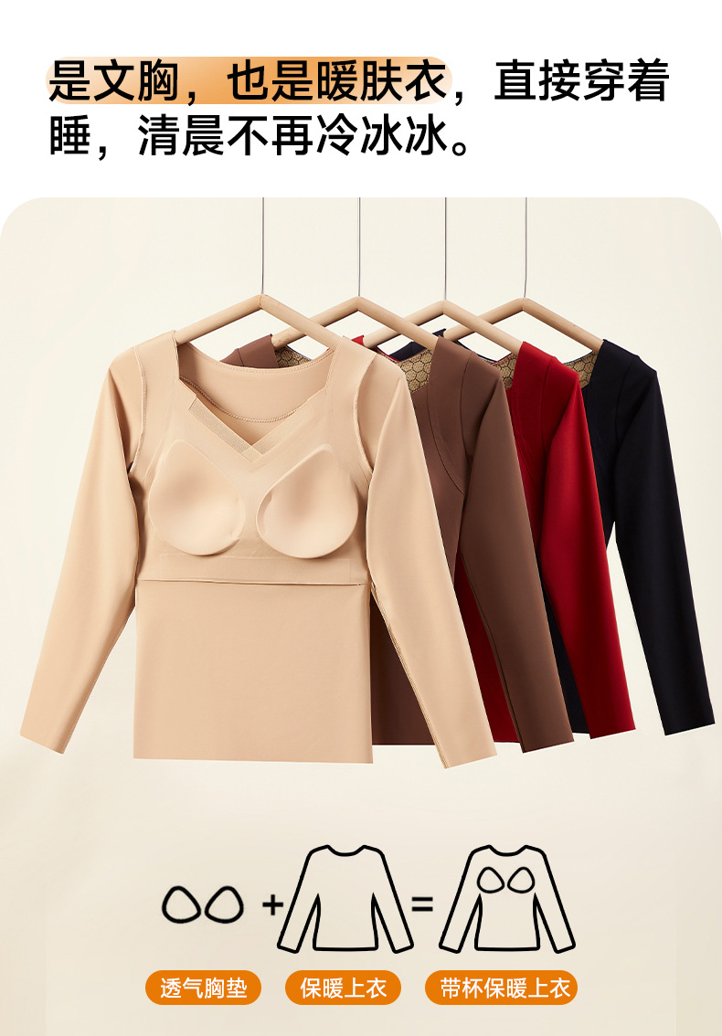 黑科技金贴片保暖内衣长袖女高弹带胸垫一体打底杉蕾丝无痕薄款秋