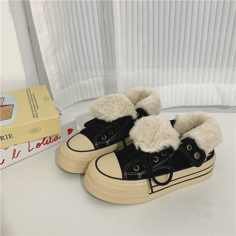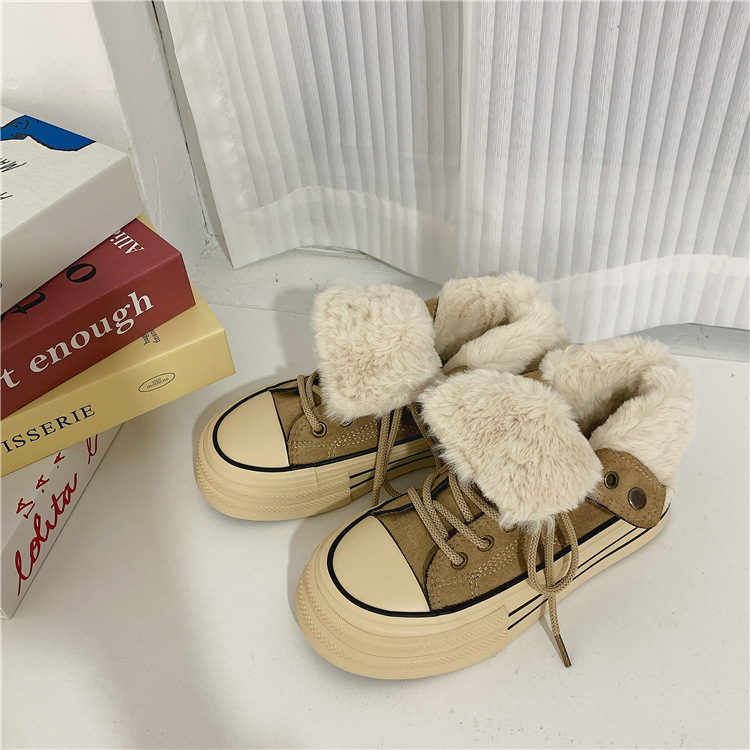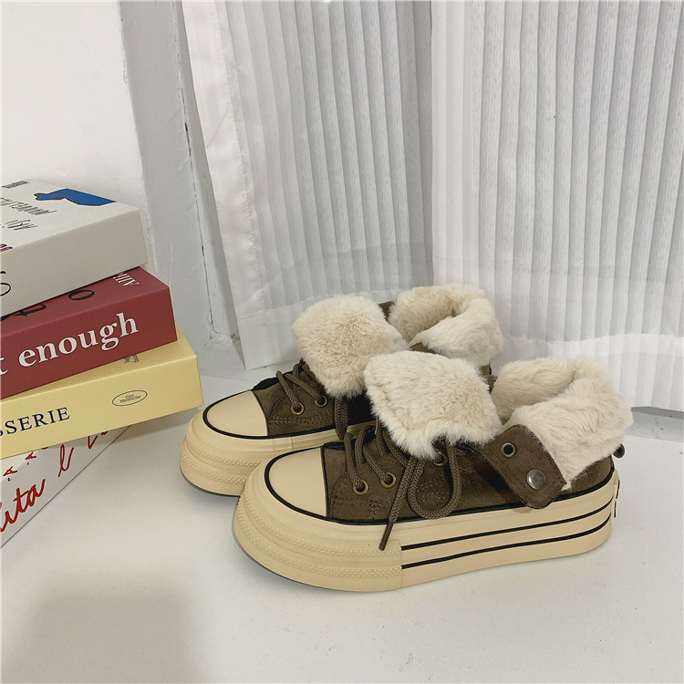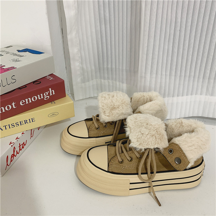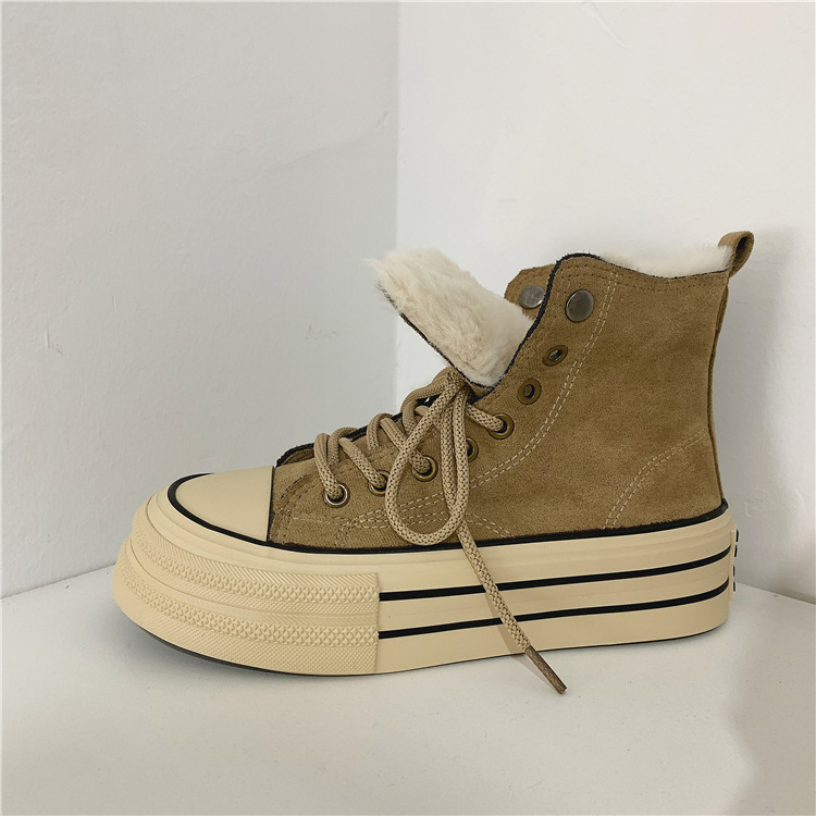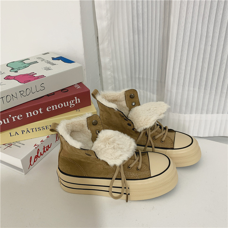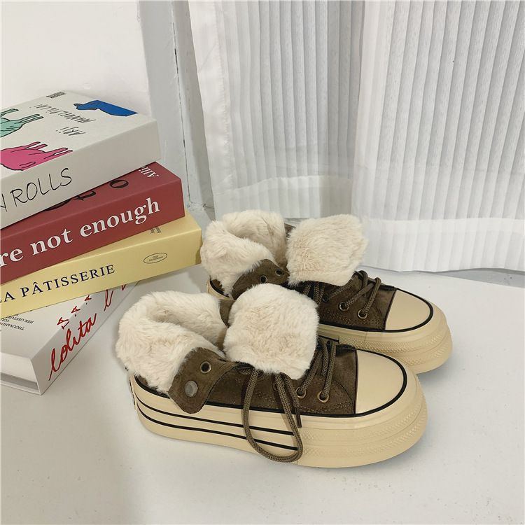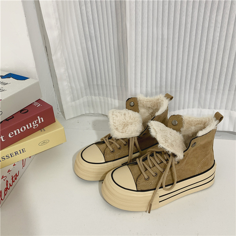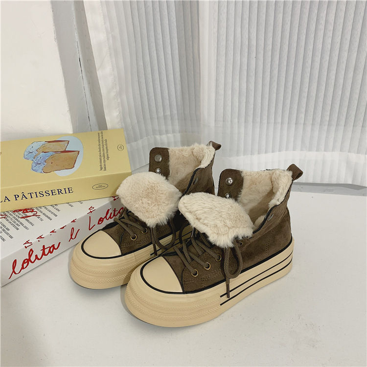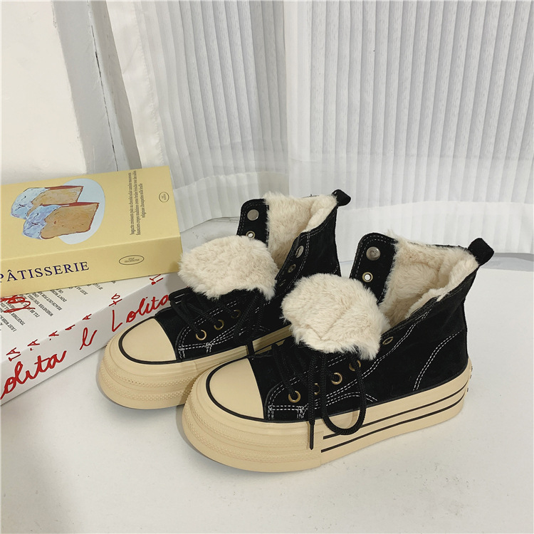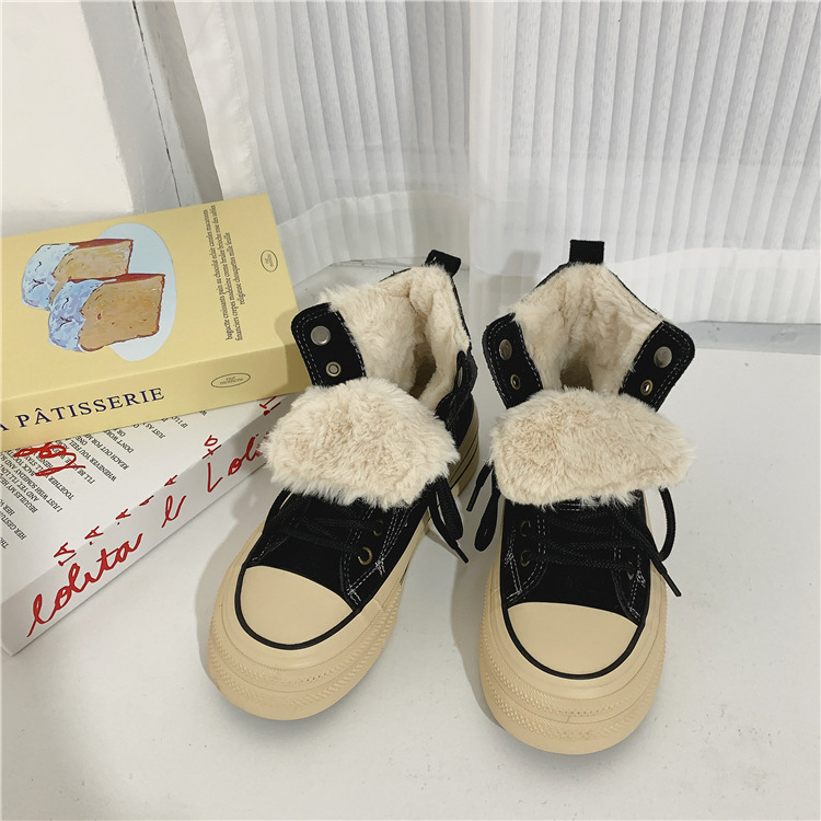 秋冬季学生韩版百搭加绒帆布鞋女2023新款高帮原宿厚底保暖棉鞋子