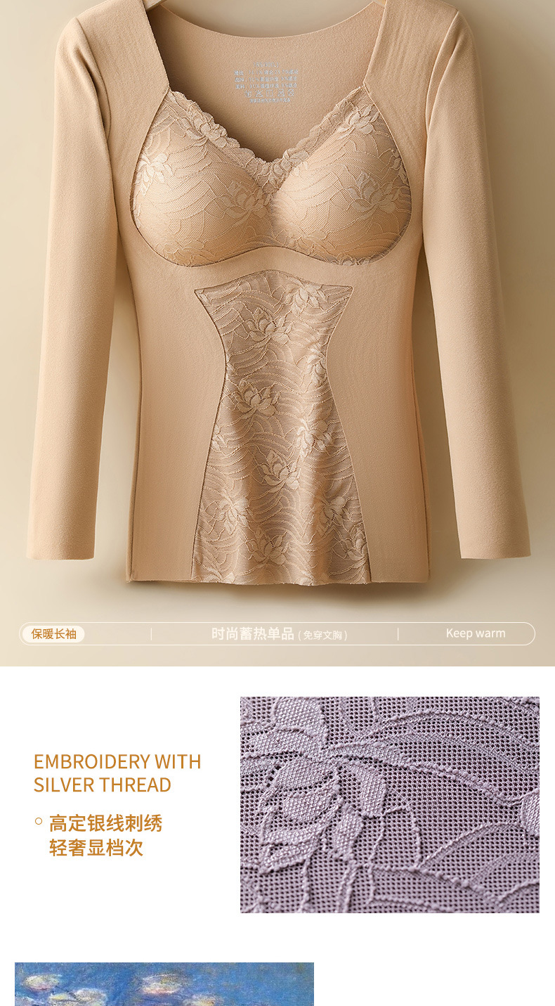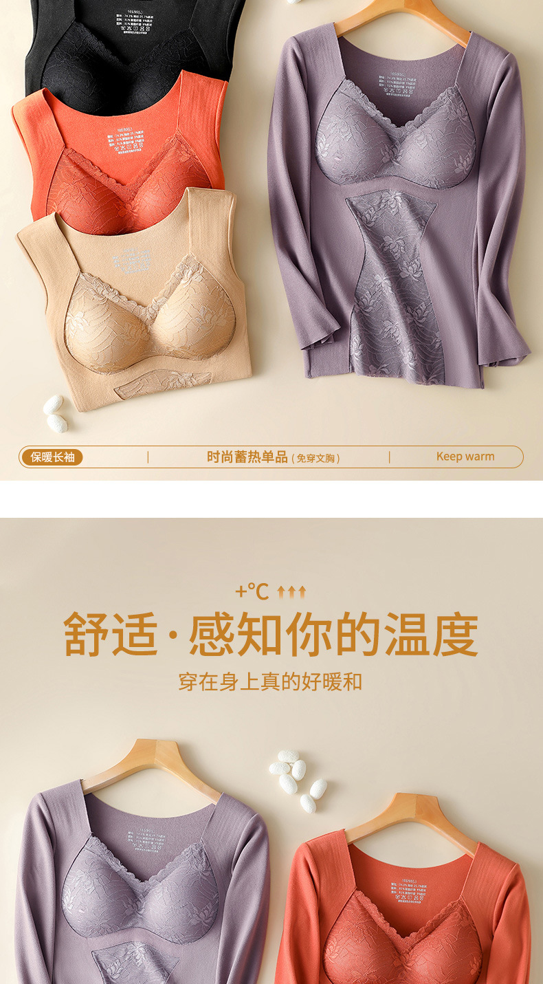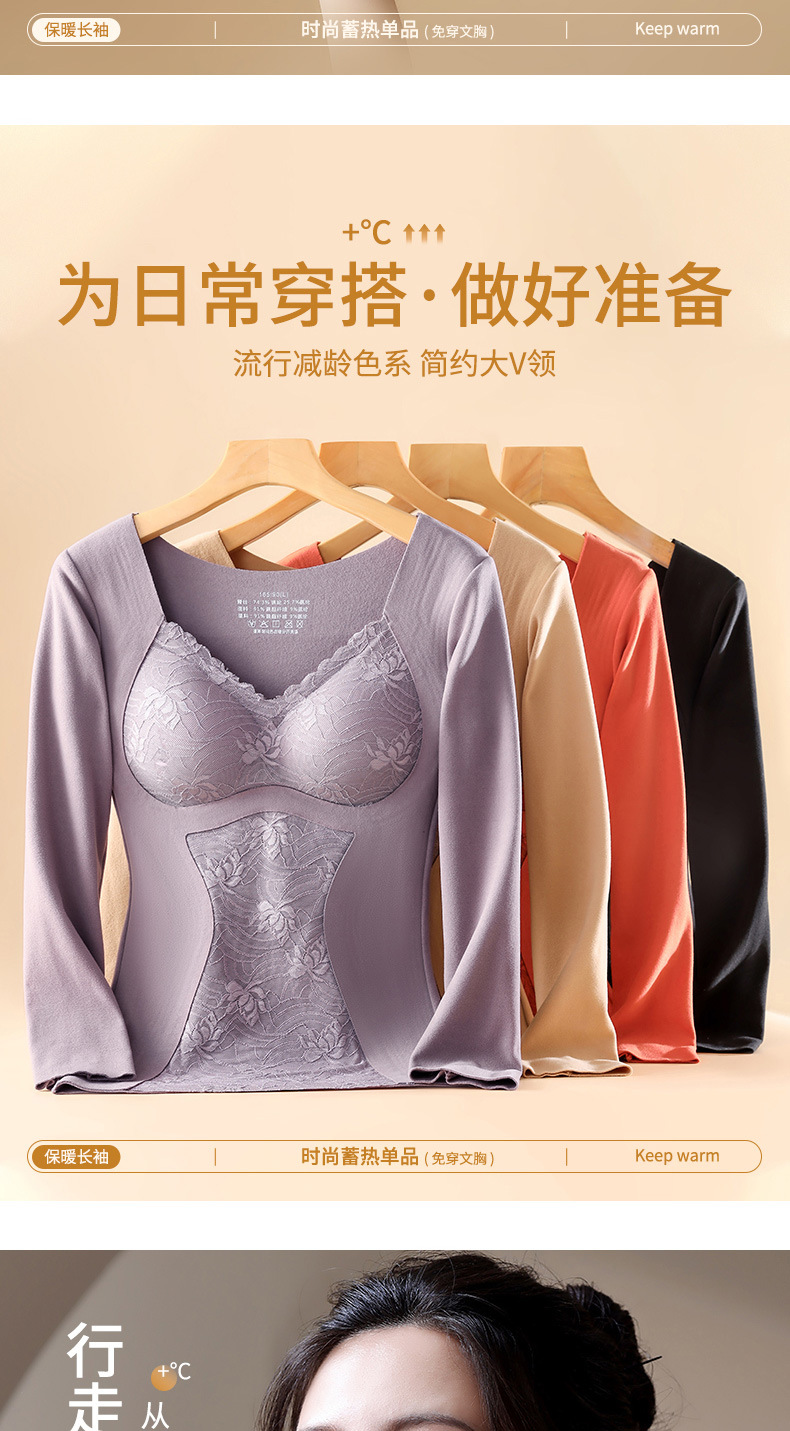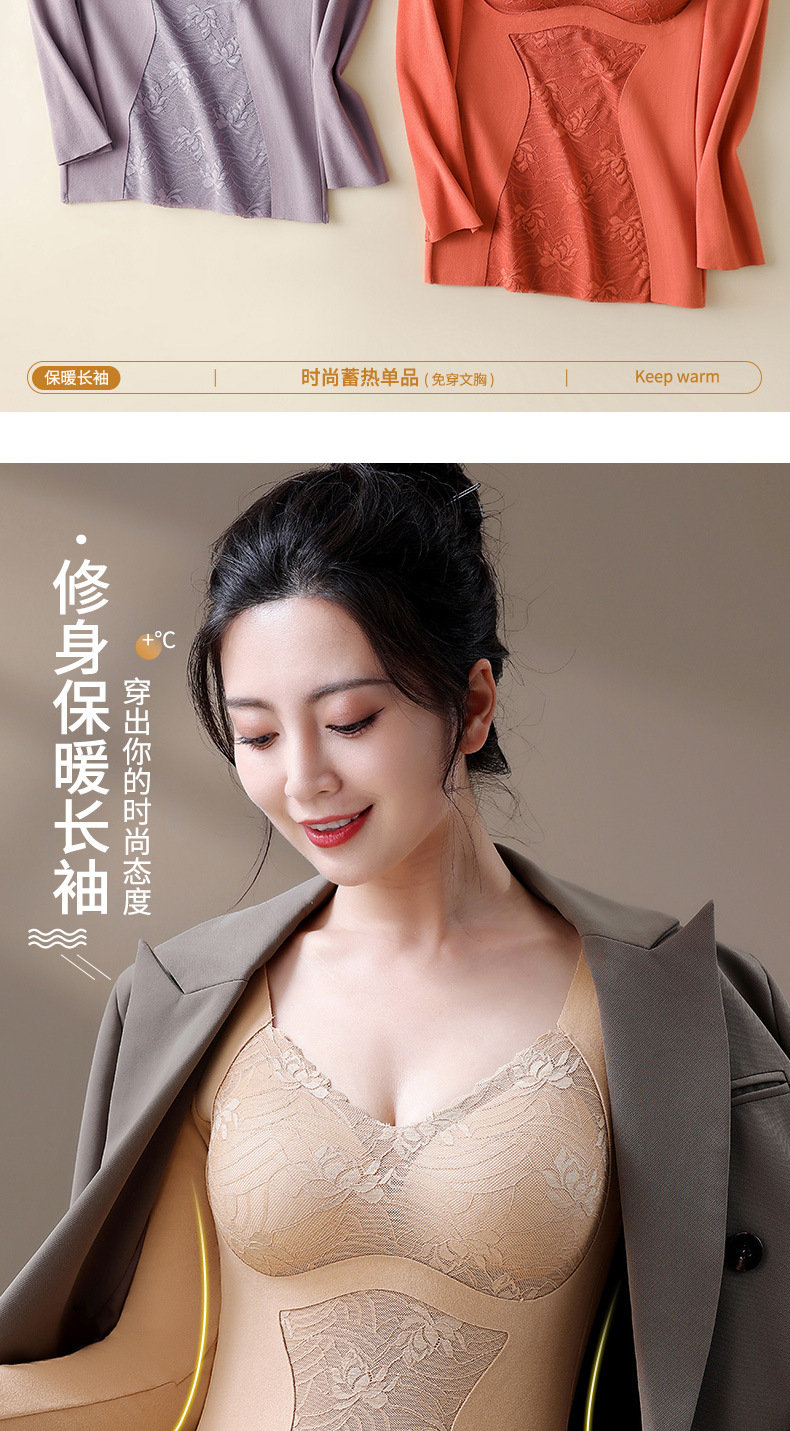 秋冬固定杯带胸垫长袖女士保暖内衣蓄热打底塑身上衣蕾丝保暖背心